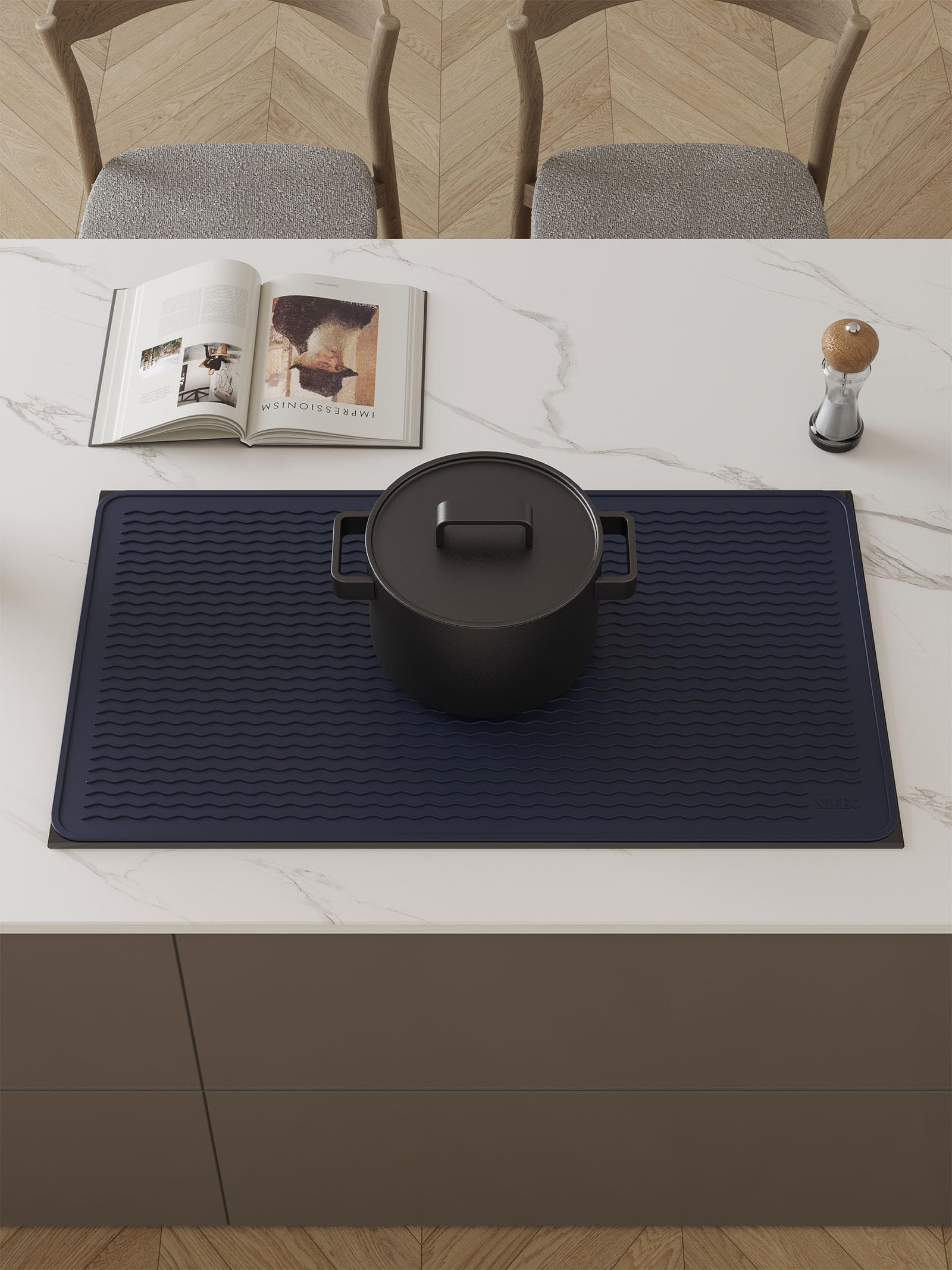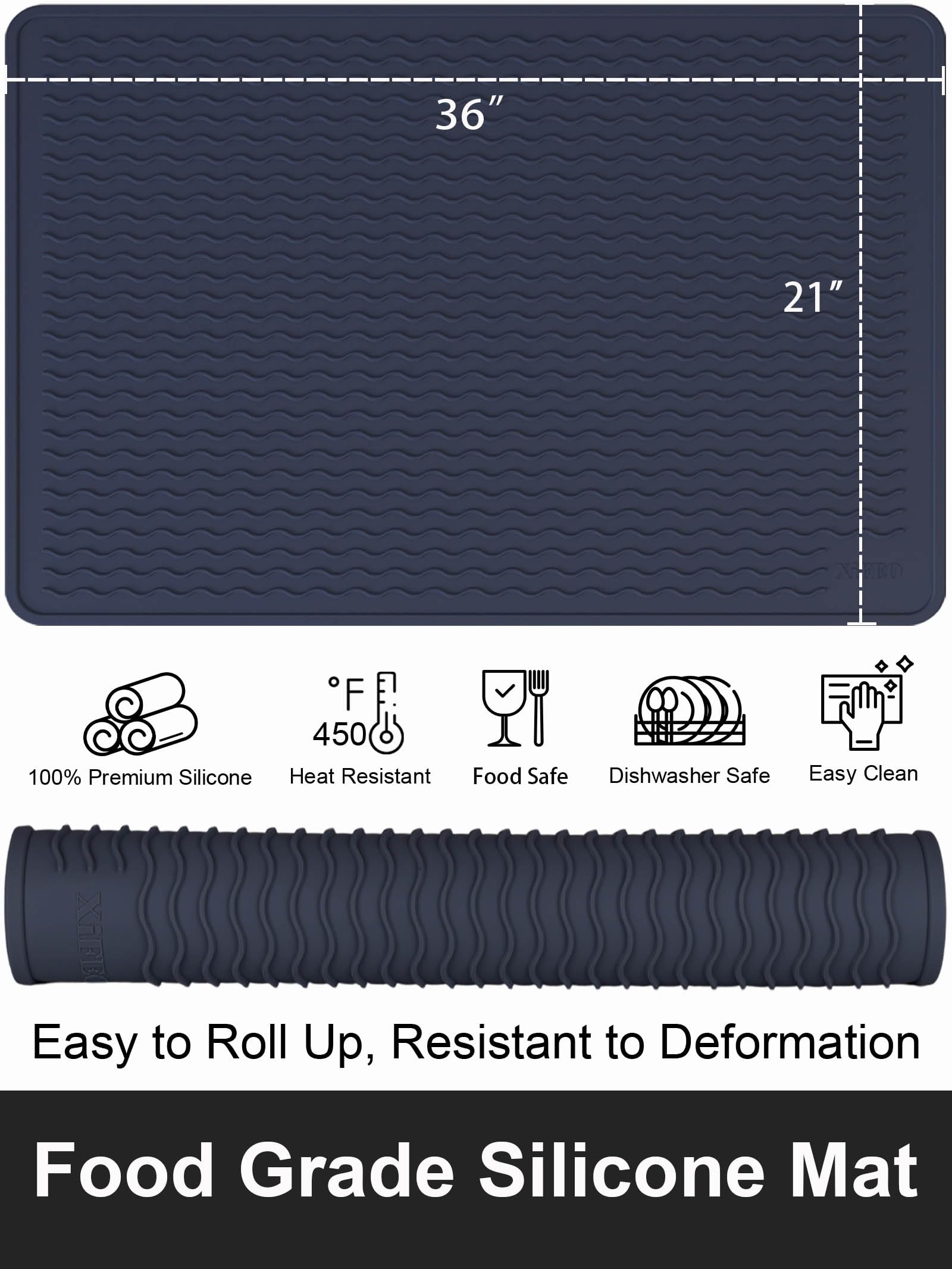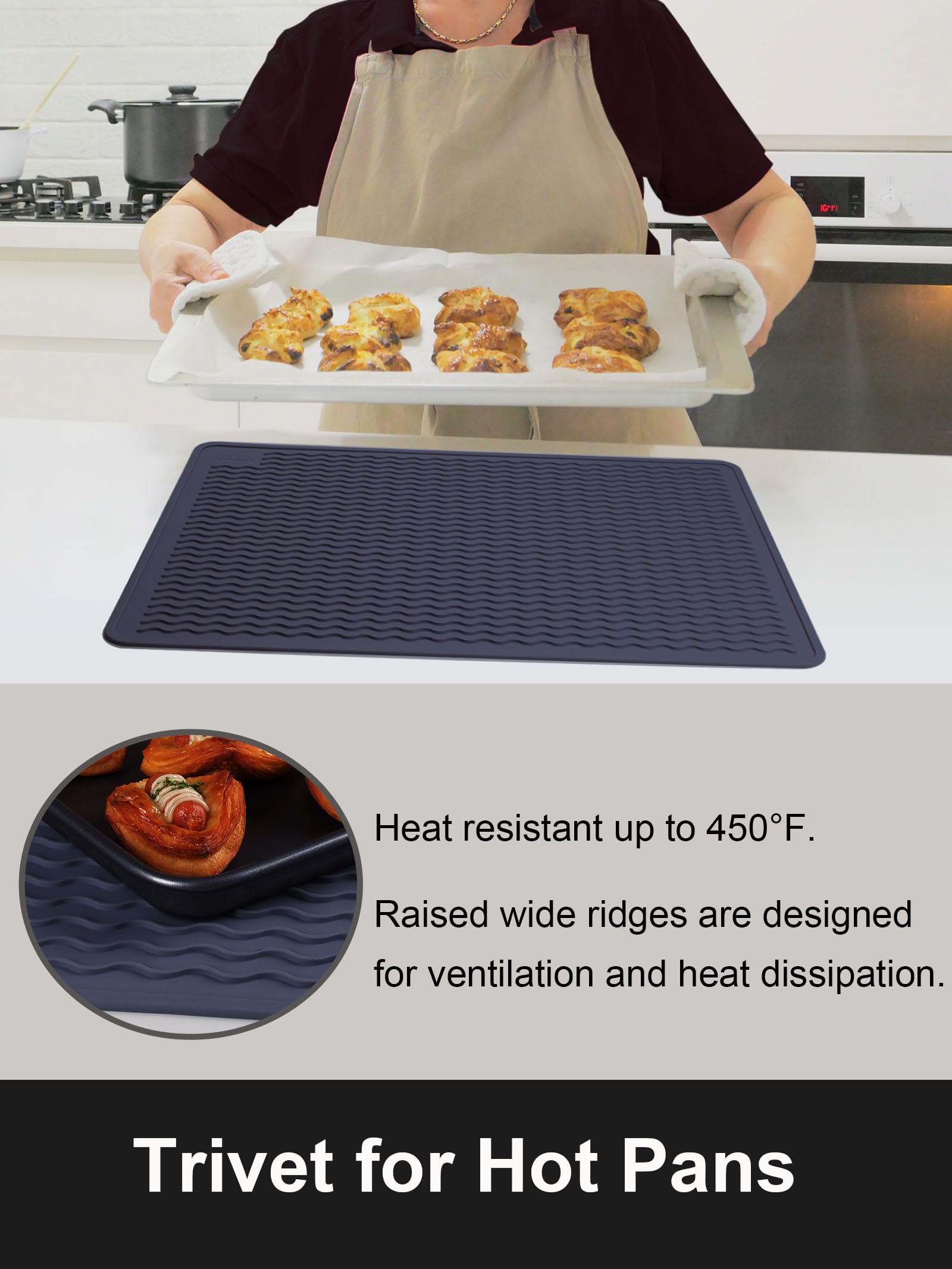 [Silicone Trivet Mat] Elevated wave patterns ensure efficient heat dissipation, while our silicone mat withstands temperatures up to 450°F, safeguarding your surfaces from heat damage. Caution: Do not cover induction cookers exceeding 450°F or place over active cookers.