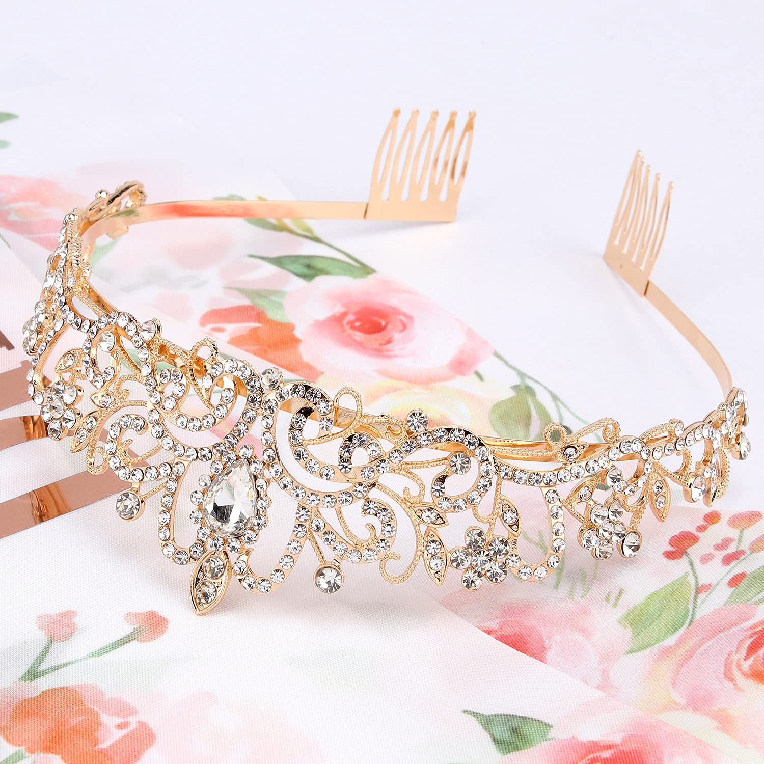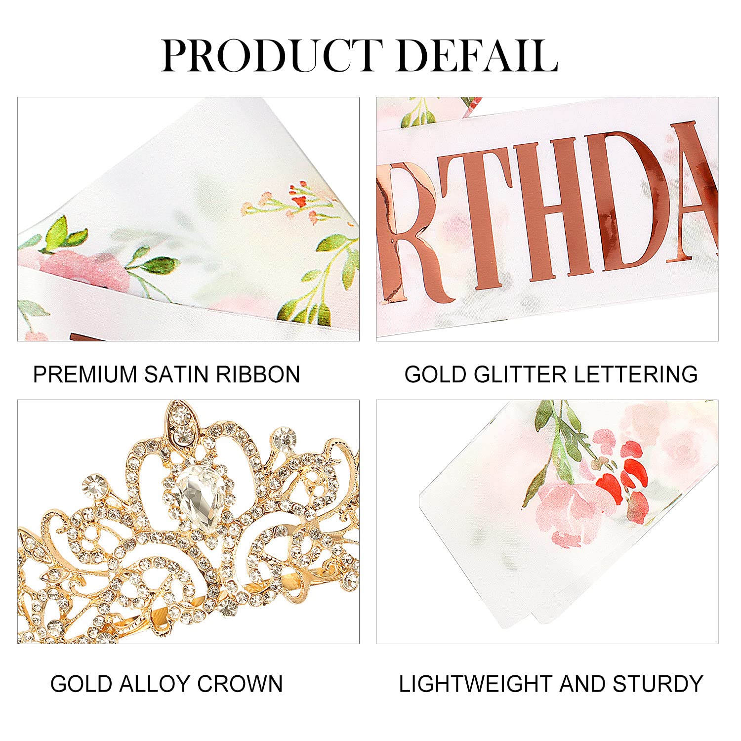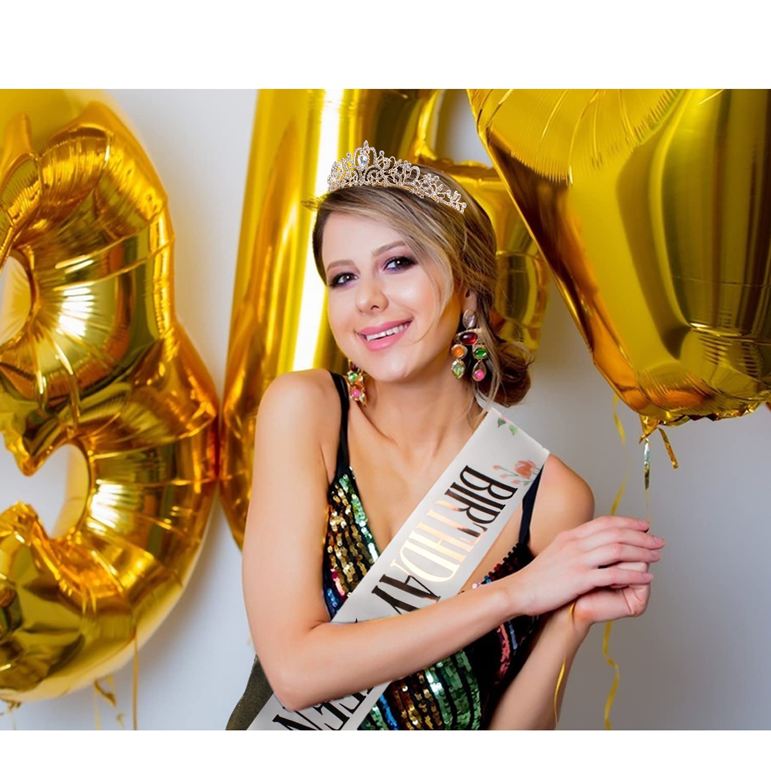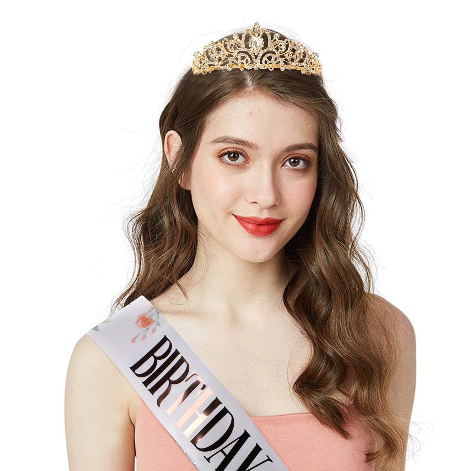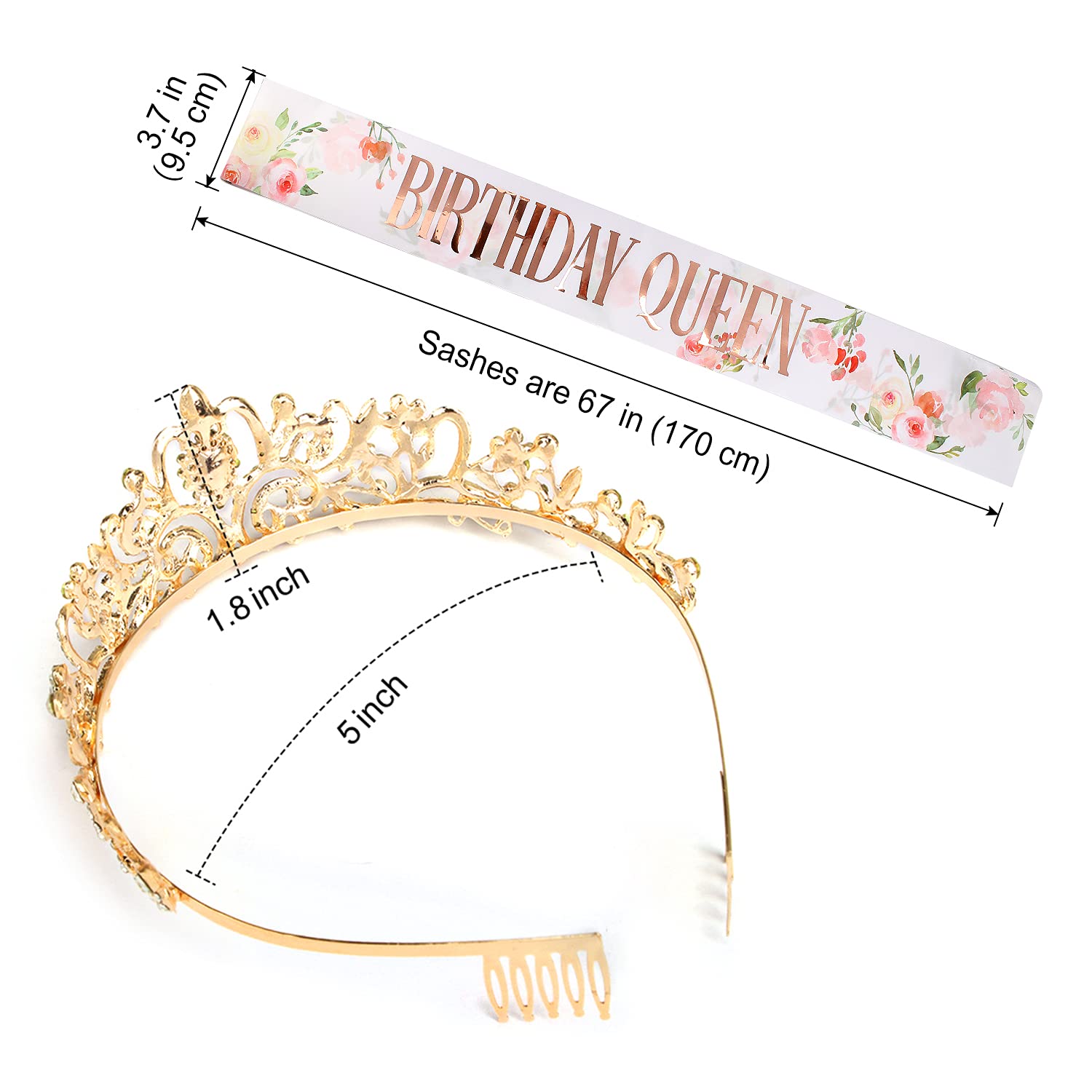 🎁GOLD SASH + CRYSTAL TIARA - Our sash is constructed of the most beautiful gold glitter material and hand pressed foil that reads "BIRTHDAY QUEEN" - each sash measures 3.5 inches wide and 33 inches long. The birthday tiara is made of rhinestone and alloy, sparking and beautiful make you more charming and eye-catching. Each tiara measures 4.92 in (12.5 cm) in diameter, 1.57 in (4 cm) in height.