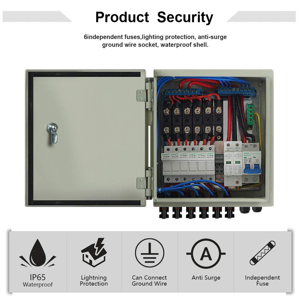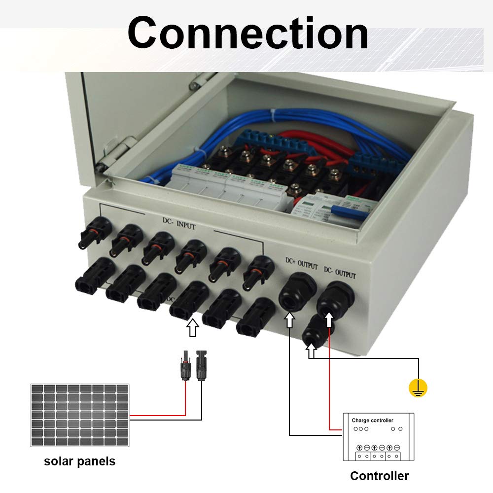 6 String Configuration, Max current of single PV input array is 10A .Each String Continuous Duty Rated at 250 Vdc.(Regardless of the specifications of the solar panels, regardless of the connection method is series or parallel, as long as the current and voltage of a single PV does not exceed 10A/250Vdc, you can connect the combiner box)