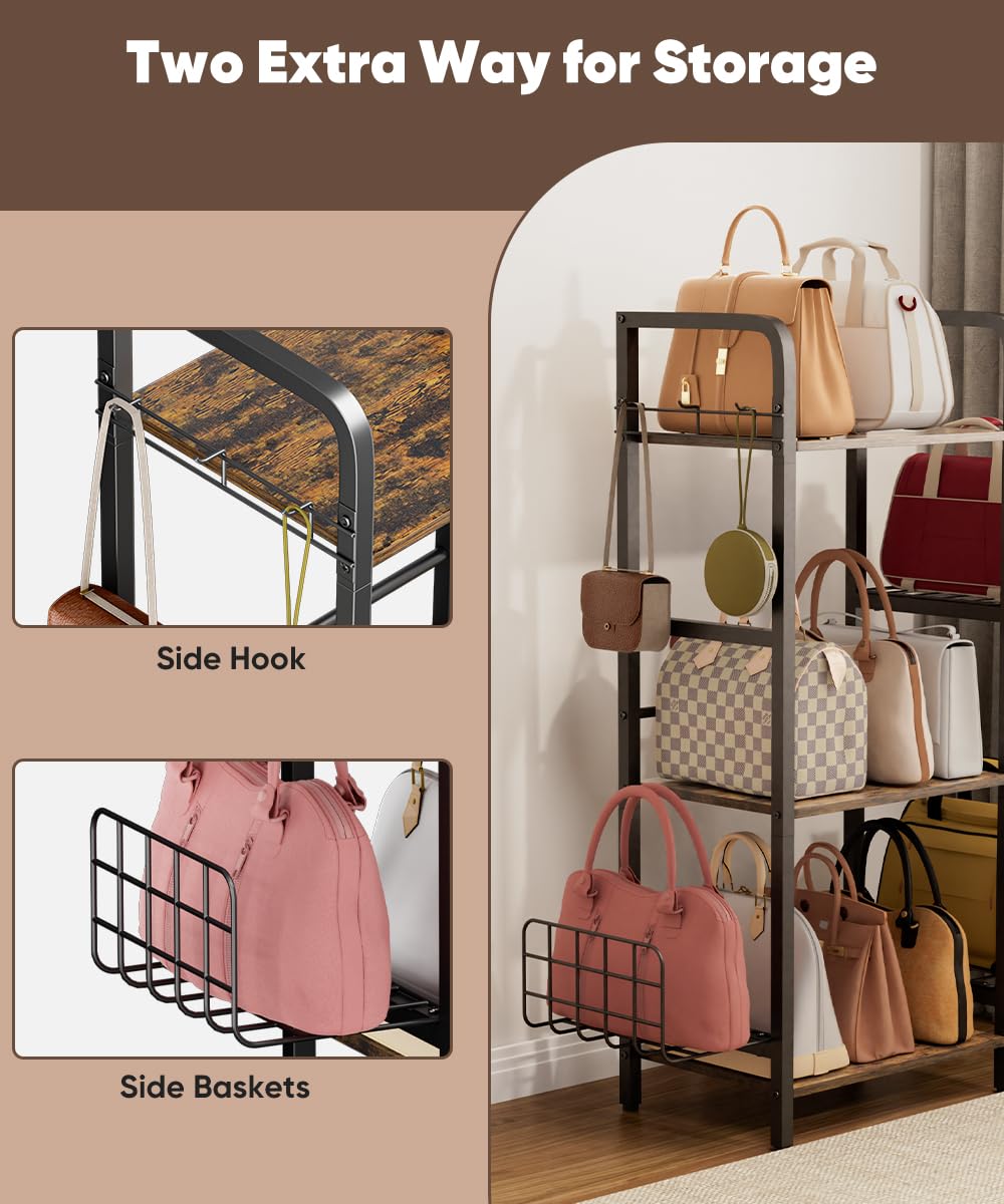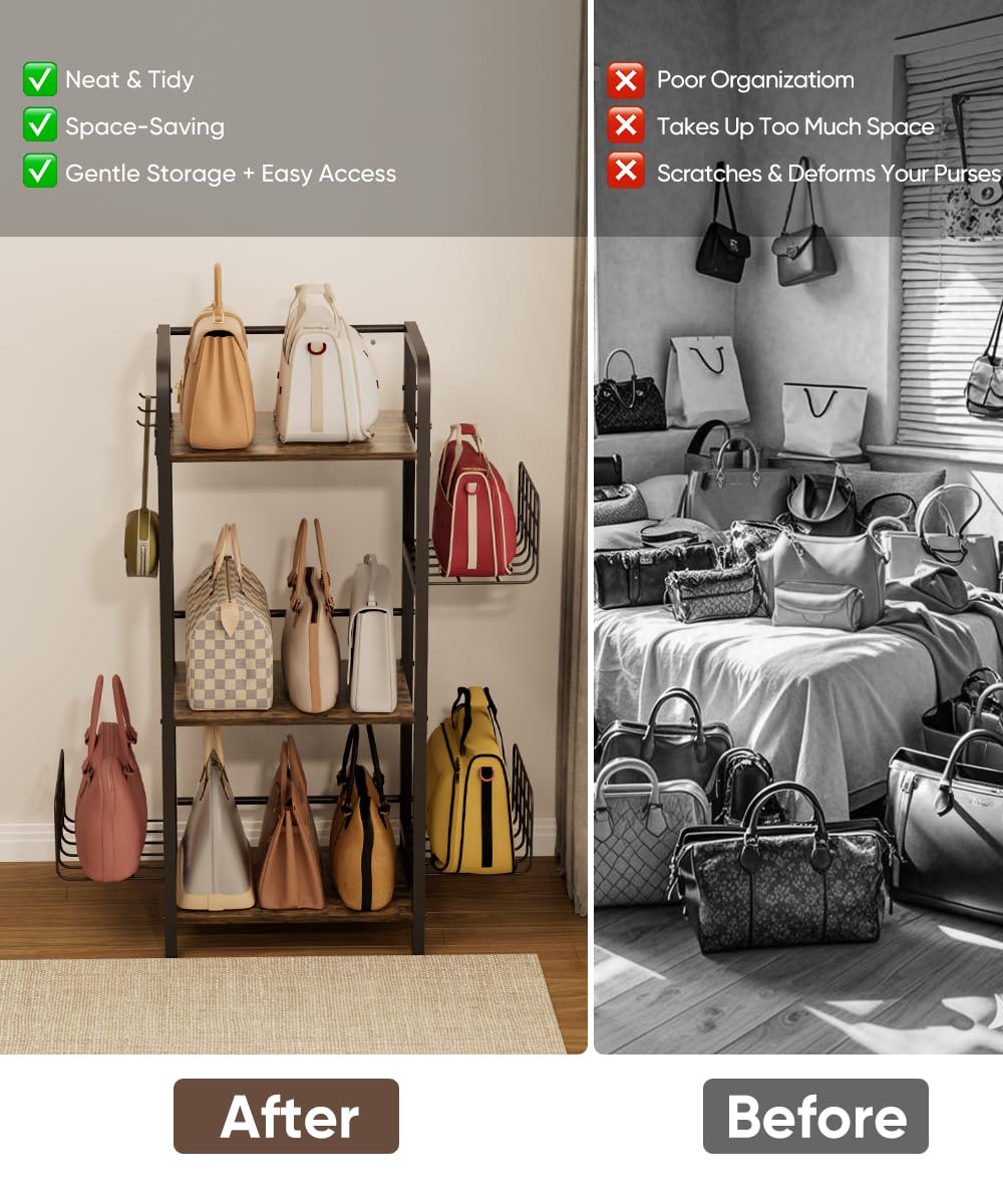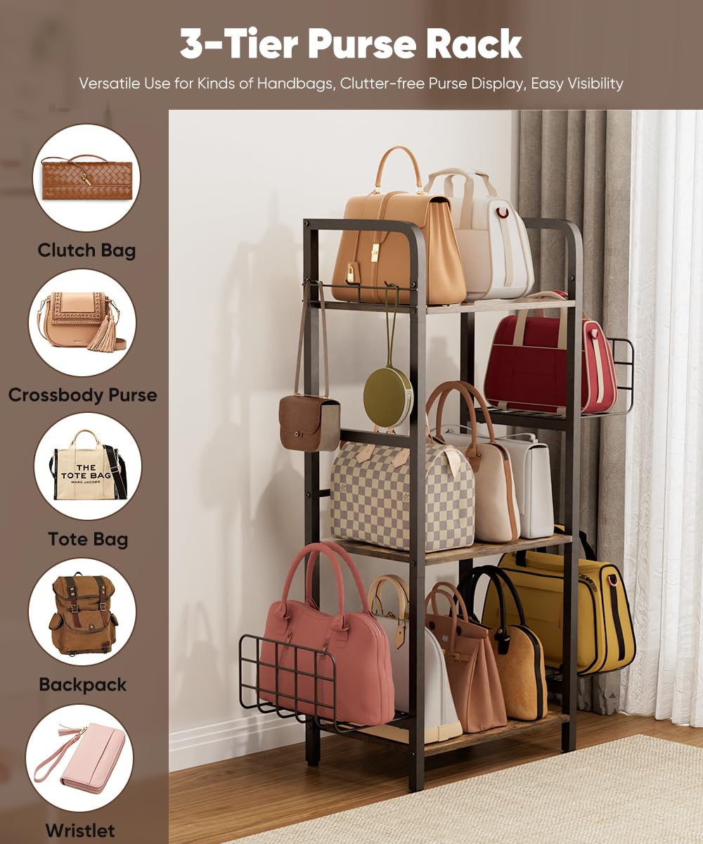 Spacious 3-Tier Design: This sturdy purse rack features three roomy shelves to neatly organize and display handbags, purses, hats, or scarves. Its vertical design maximizes capacity while saving floor space—ideal for bedrooms, closets, or entryways. The open layout ensures quick access and visibility.