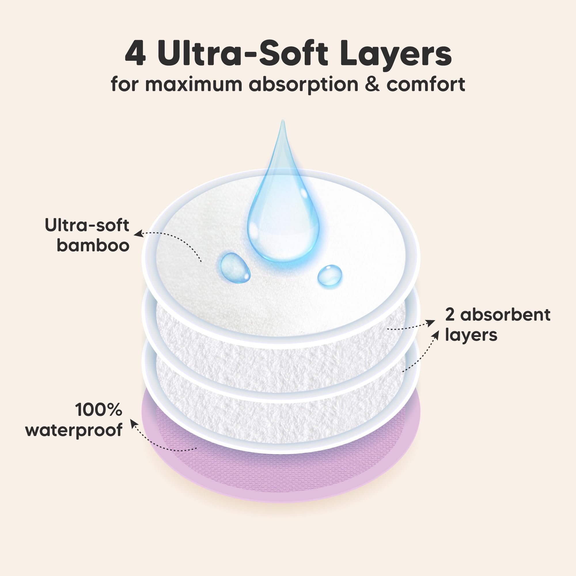 Great For Leakages – Leakage is a thing of the past with our 4-layer nursing pads. KeaBabies Nursing Pads feature three layers of ultra-absorbent viscose derived from bamboo, sealed with a protective waterproof outer layer for extra security on the nipple pads. Tip: If you experience a heavy flow, please replace breast pads every 5-6 hours.