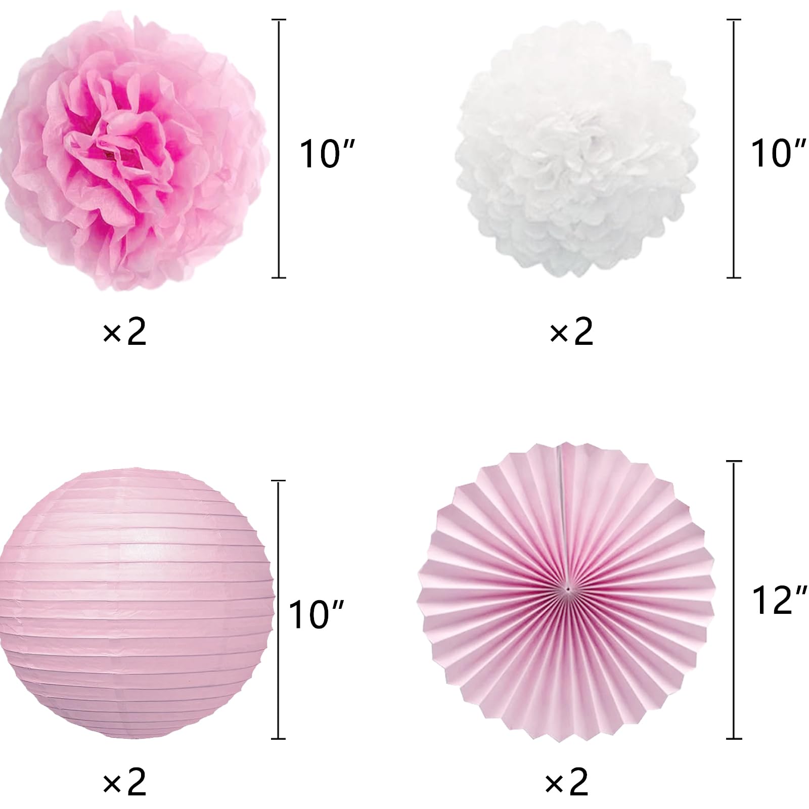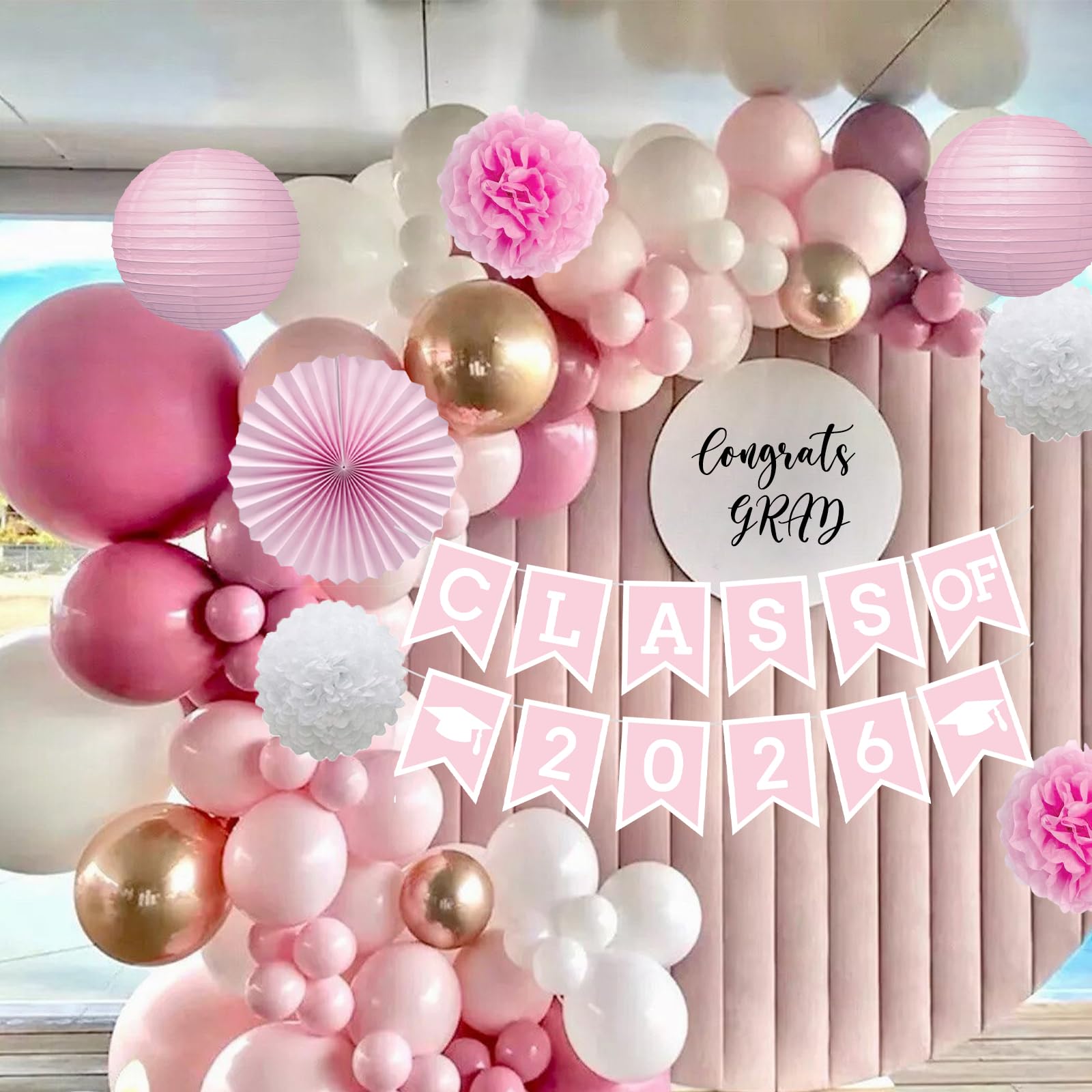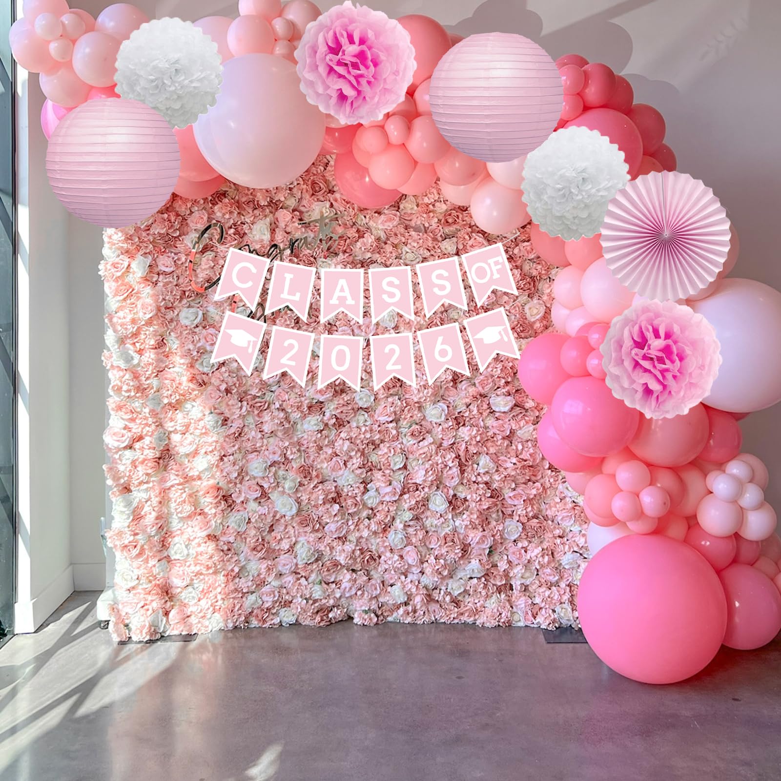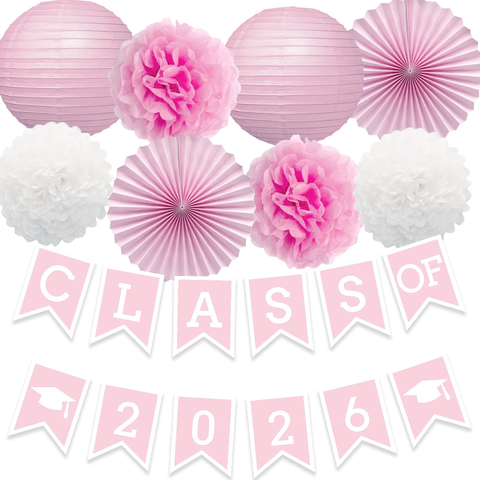 Quantity: 1 pink class of 2026 banner with 2 white grad caps, 2 pink pom poms flowers, 2 white pom poms flowers, 2 pink paper lanterns, 2 pink paper fan flowers