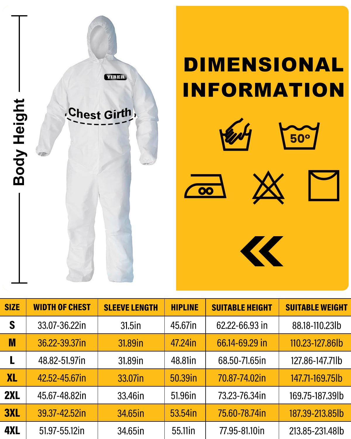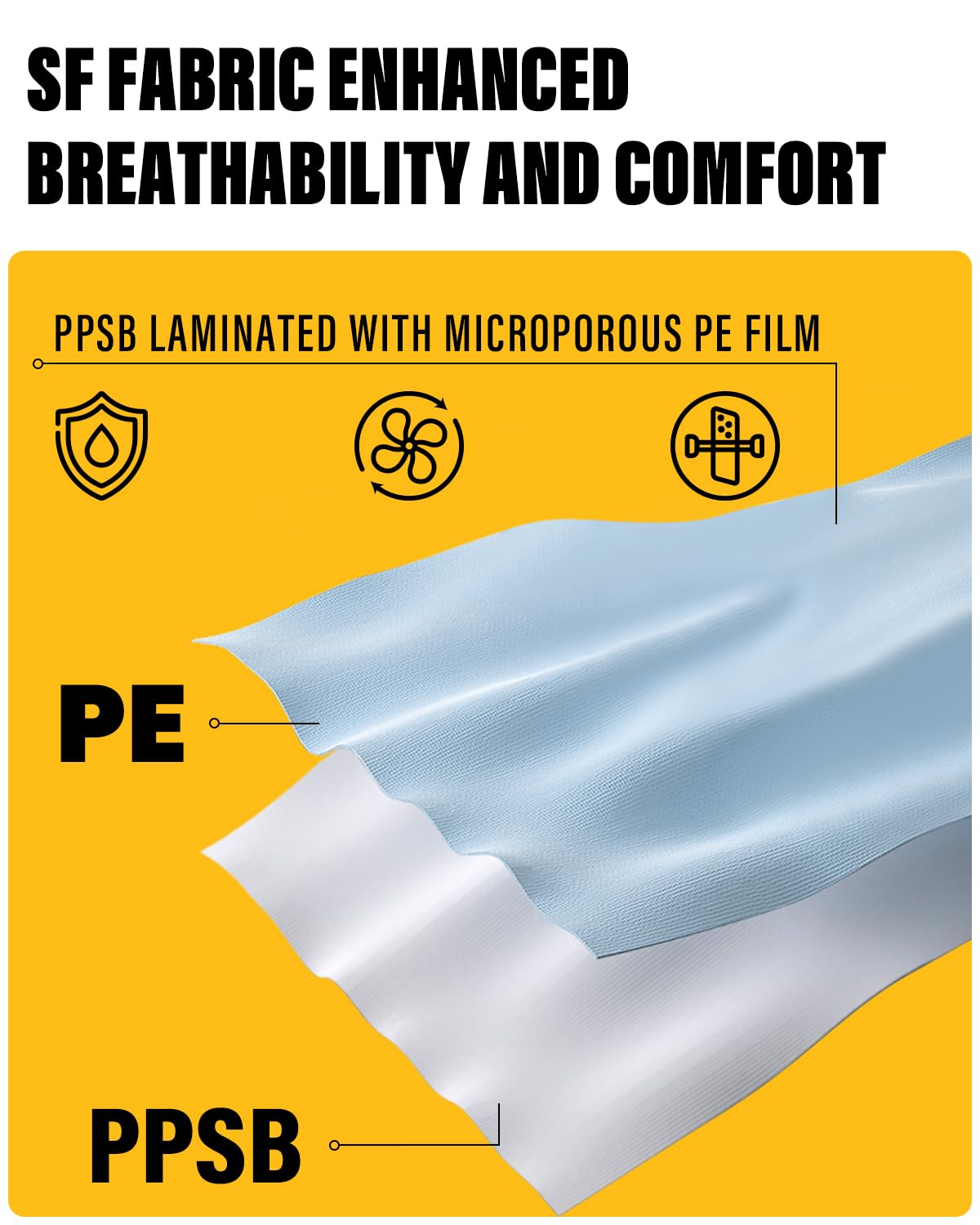 EXTRA COMFORTABLE, BREATHABLE MATERIAL | Constructed with a nonwoven multilayer design featuring a microporous film over spunbonded polypropylene, our coveralls offer exceptional durability and breathability. The soft, lightweight, seamless material provides superior comfort for extended wear, while elastic cuffs, waist, and ankles ensure a snug fit with freedom to move, stretch, and adjust.
