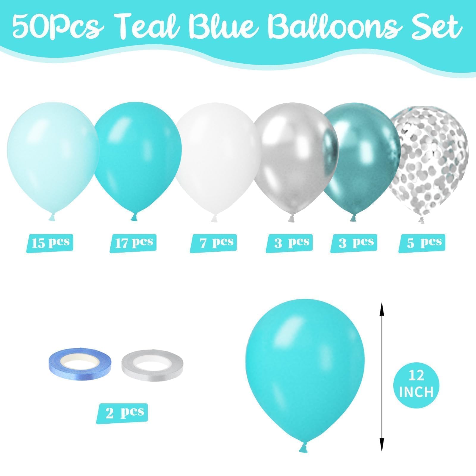 【WHAT YOU WILL GET】Our birthday party balloons include 50pcs teal blue and silver balloons, designed to help you create stunning decoration: 3 x metallic silver balloons, 15 x macaron teal blue balloons, 17 x teal blue balloons, 3 x metallic dark green balloons, 5 x confetti silver balloons, 7 x white balloons, 1 x light blue ribbon, and 1x white ribbon. The size of the balloon is about 12 inches after inflation. The combination of teal blue and silver can make party or occasion more classy.