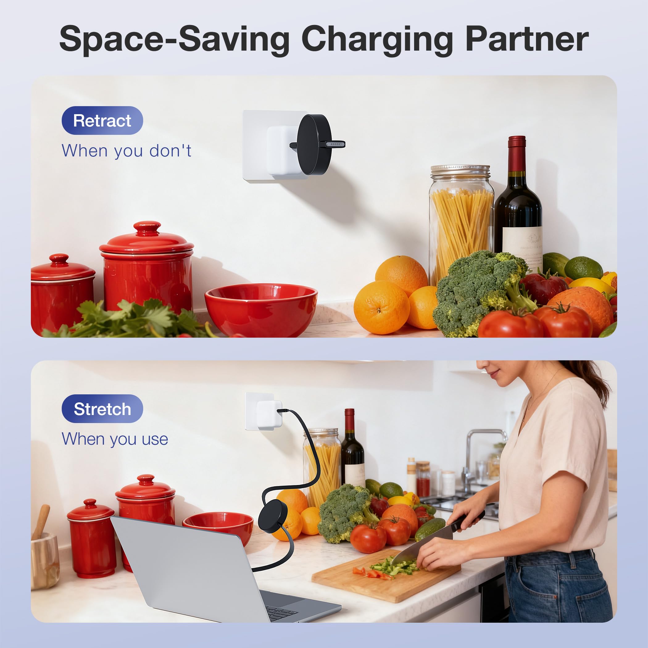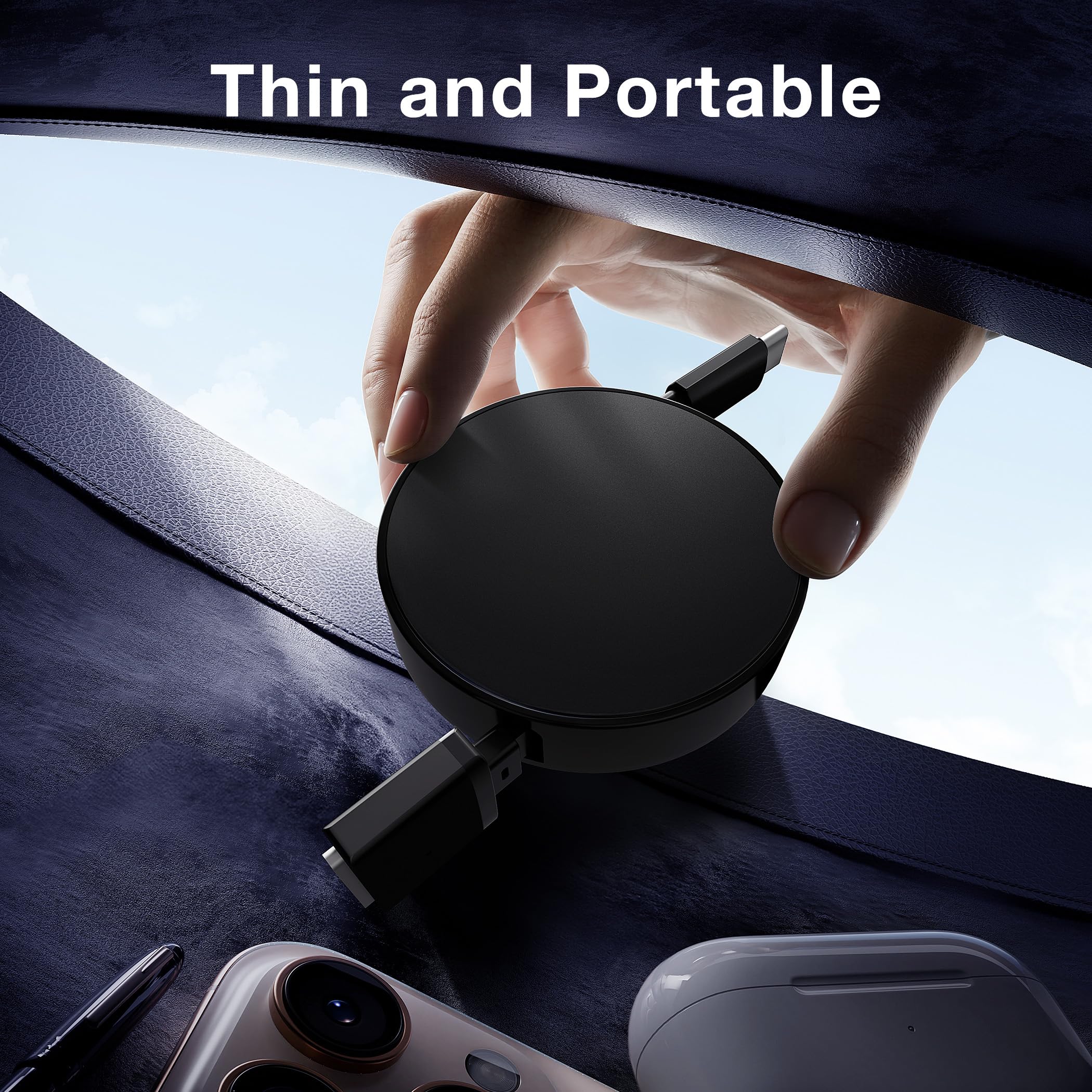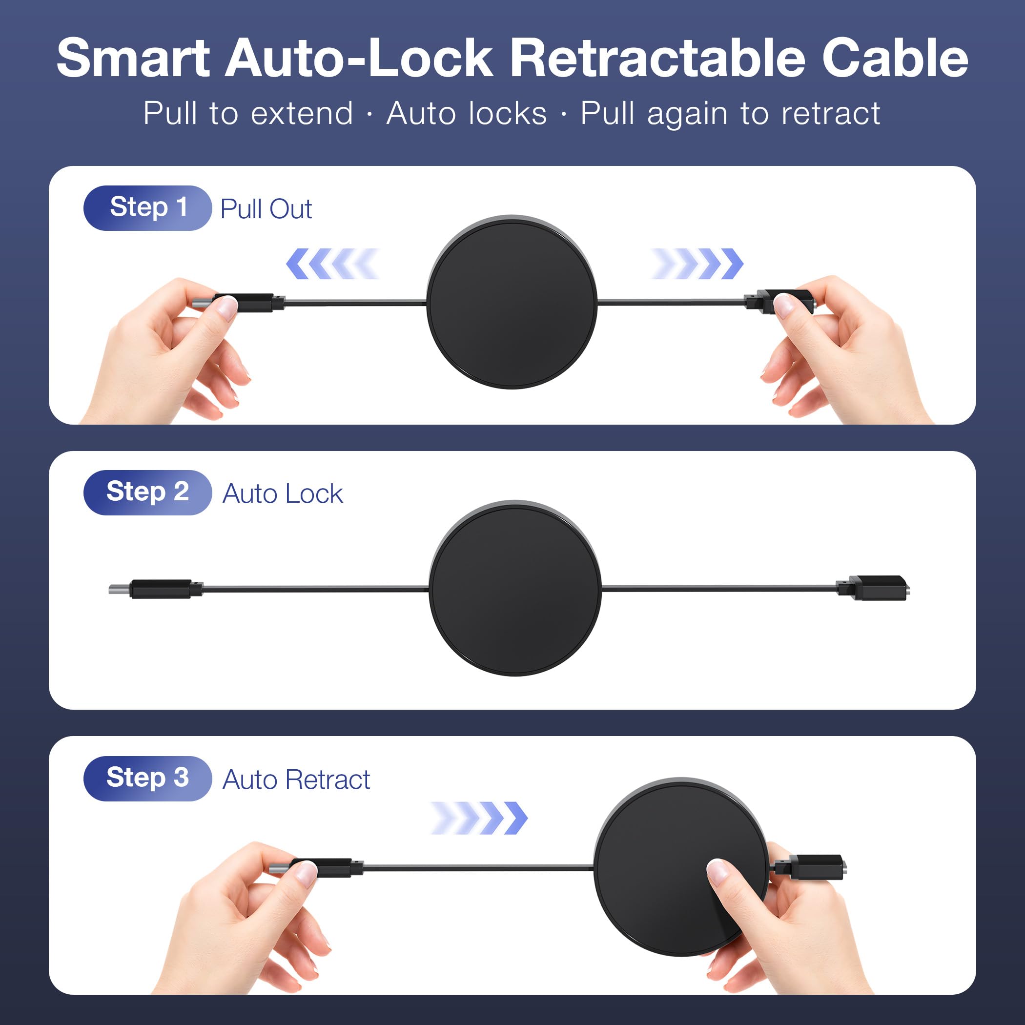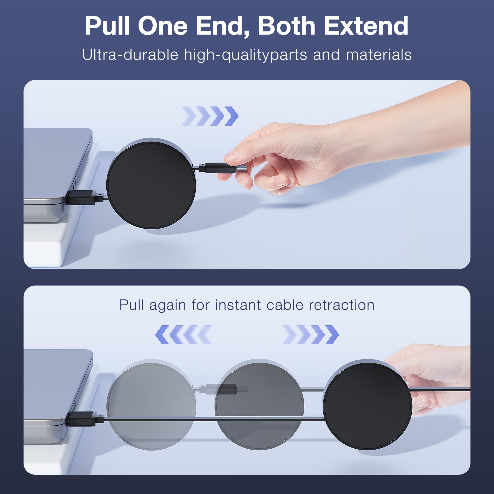 Pull-to-Use & Retract-to-Store: The cable extends smoothly to its full 5.4ft length with a gentle pull from either side. When done, just give it a slight pull and release—it automatically retracts completely, keeping your desk tidy and bag organized.