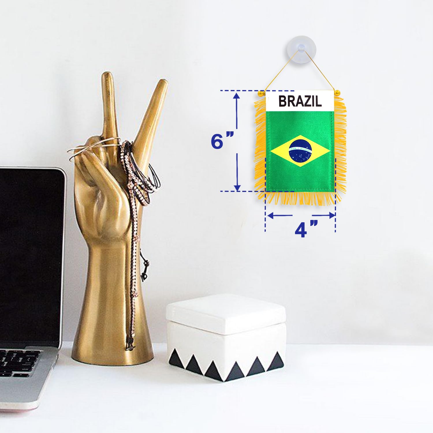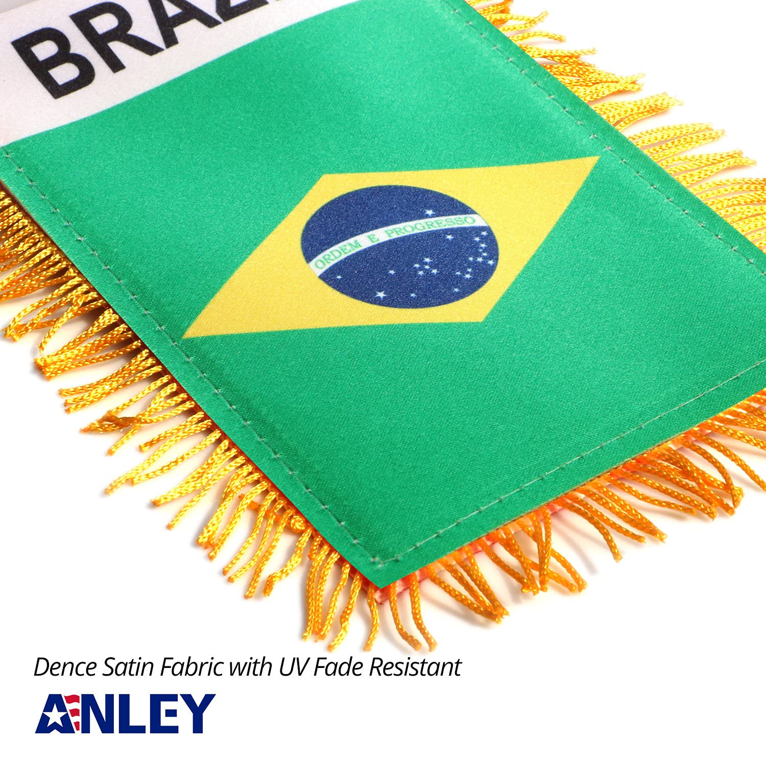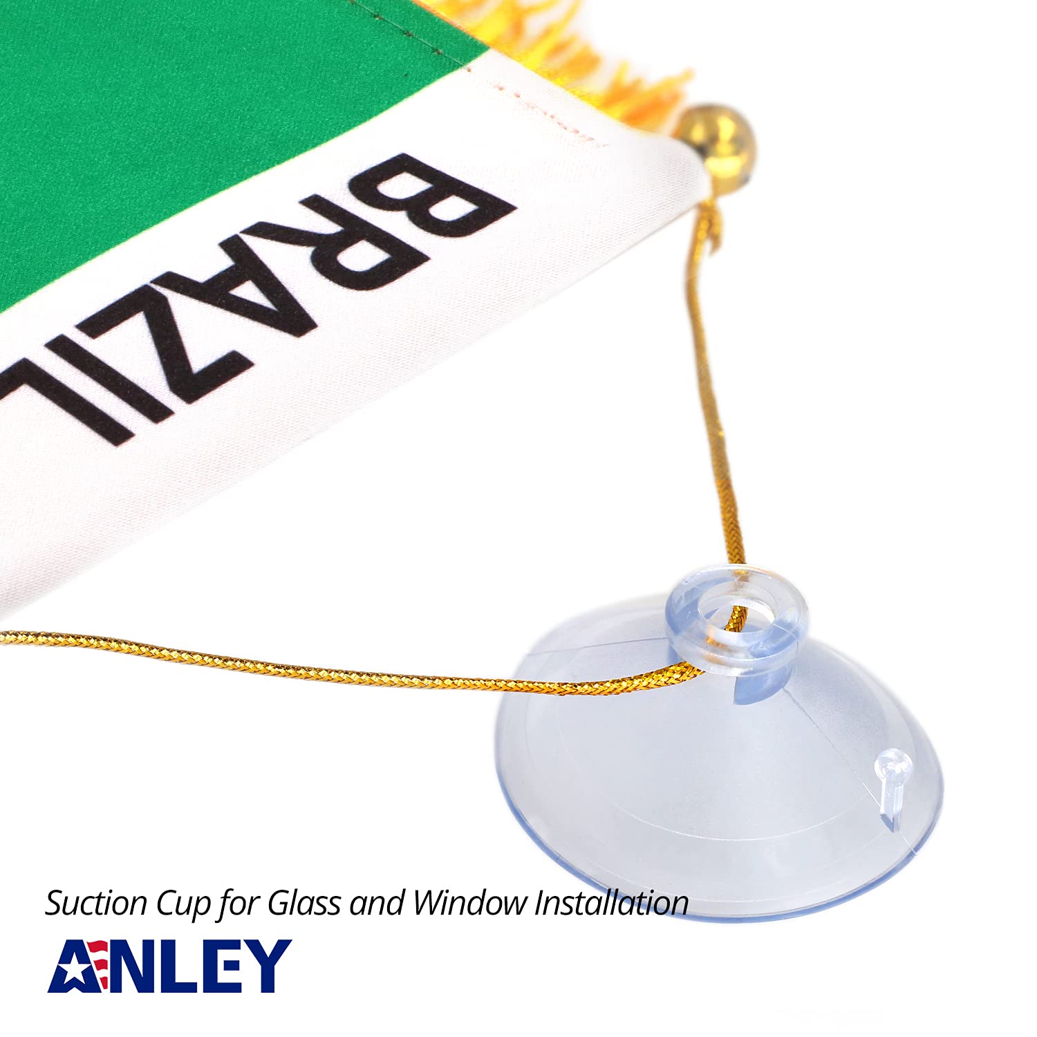 Anley 4 X 6 Inch Brazil Fringy Window Hanging Flag PREMIUM QUALITY Imported. Independently double stitched all around the edge, not easy to fall apart. FADE RESISTANT The color is bright and vivid, evenly-printed on both sides and without a color difference. EASY TO USE Can mount directly over the rear view mirror or with suction hanger. You can also hang it on the window in your home. Light & Compact The flag is 4" x 6". Perfect match with all vehicle models. Special sateen is more unique in the sun. WARRANTY We stand behind our products! All flags and items sold by ANLEY come with 3-MONTH FREE replacement warranty.