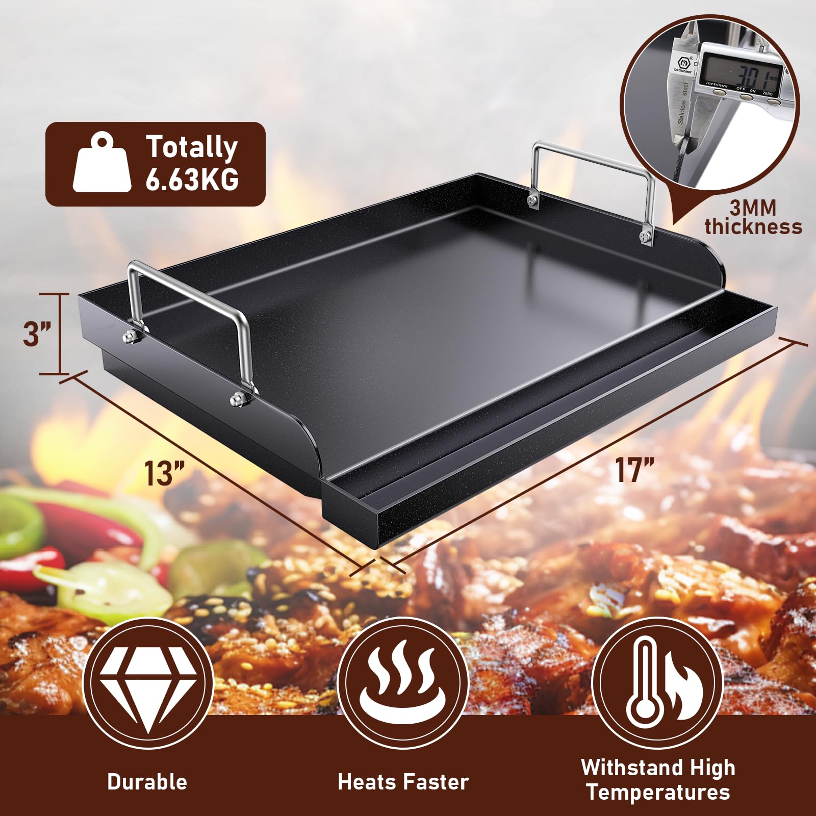 【Durable & Safe】 Constructed from high-quality metal, this heavy-duty griddle is built to last. Its thick, heat-resistant surface prevents bending or warping even under prolonged use. Reinforced triangular support ridges at the bottom ensure even heat distribution, eliminate hot spots, promote uniform cooking, and prevent the grill sheet from warping. With polished edges, the griddle is safe to use and easy to carry with convenient side handles for easy handling and storage.