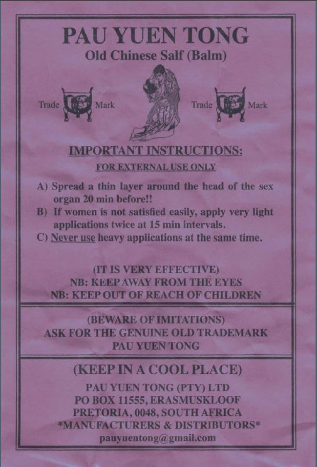 Turn on the music, light some candles and spice up your night with PAU YUEN TONG BALM. Good 'N Natural-searched the globe to gather the most exotic BALM nature has to offer. This specialized formula of the BALM supports energy, whenever you need it! ENJOY. The more you use it the better it gets, experiment to suite your needs, try various intervals prior to "ACTION". USE A SMALL AMOUNT 45 MINT. BEFORE THE ACTIVITY BUT FOR BEST RESULTS, USE BEFORE 3 HOURS A SMALL APPLICATION THAN THE SECOND HOUR APPLY A SMALL AMOUNT AND THE LAST HOUR THE SAME AND HAVE FUN:) AND, YES, OH-YES- WE WOULD LOVE TO KNOW THE DETAILS IF YOU DARE:)