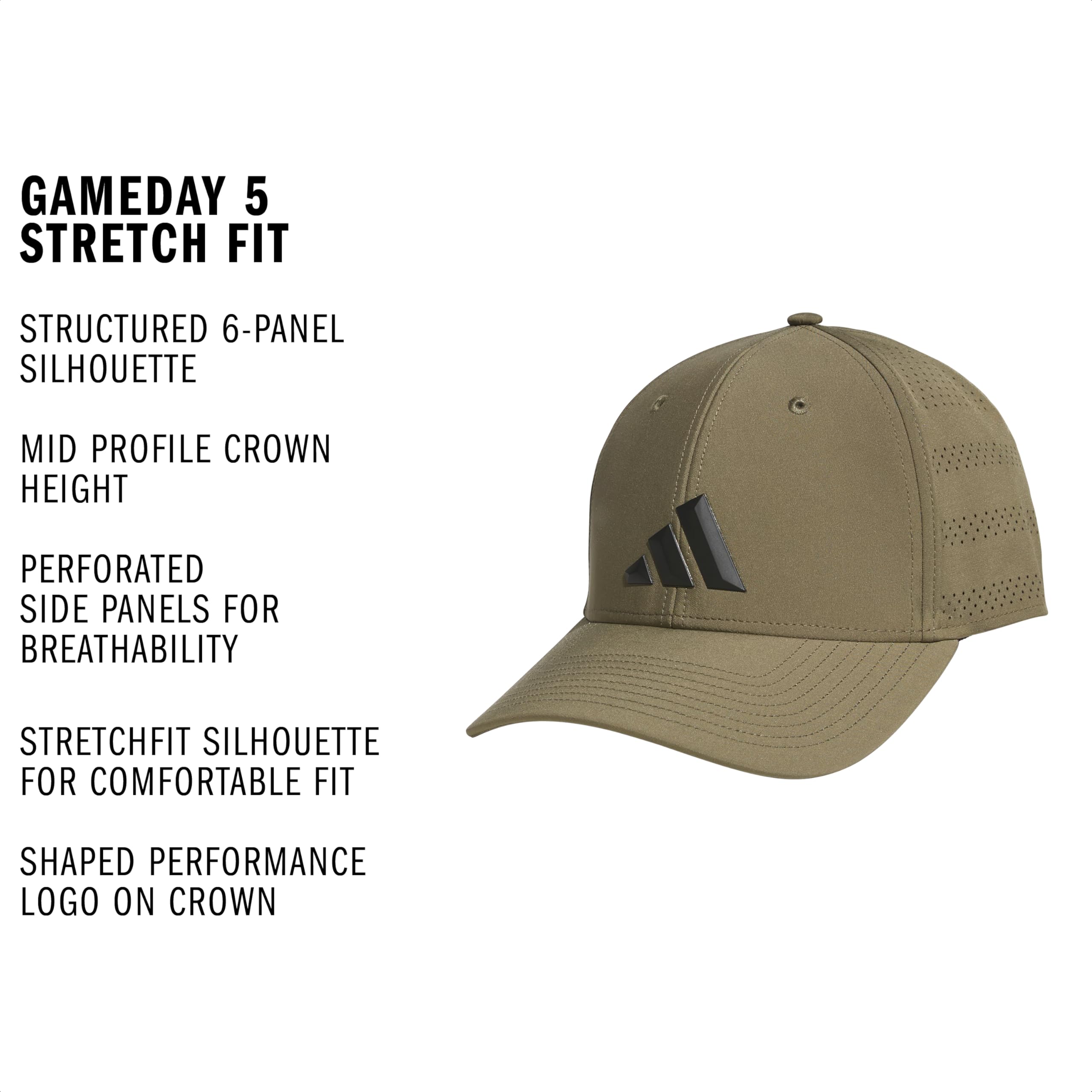 Description The adidas Men's Gameday Structured Stretch Fit Hat is the ideal choice for those seeking versatile mens hats and caps. Designed as a great hat for men, this flexible athletic sports cap offers both style and function. Made from durable poly spandex material, it withstands wear and tear while maintaining its sleek look. Ideal for various activities, whether you're searching for golf hats that men appreciate or looking for that perfect running hat men need, this cap has it all. As a great choice among men's baseball caps, the cap features a snug, stretch fit that adjusts effortlessly. The perforated 3-stripes on the sides provide breathability, making it a great pick as a men's baseball cap. With UPF 50 protection, it effectively blocks harmful UV rays, allowing you to focus on the game. This cap dries fast, keeping you cool and comfortable whether you're on the sidelines or in the heat of a practice session. Elevate your collection of men's hats with this stylish cap.