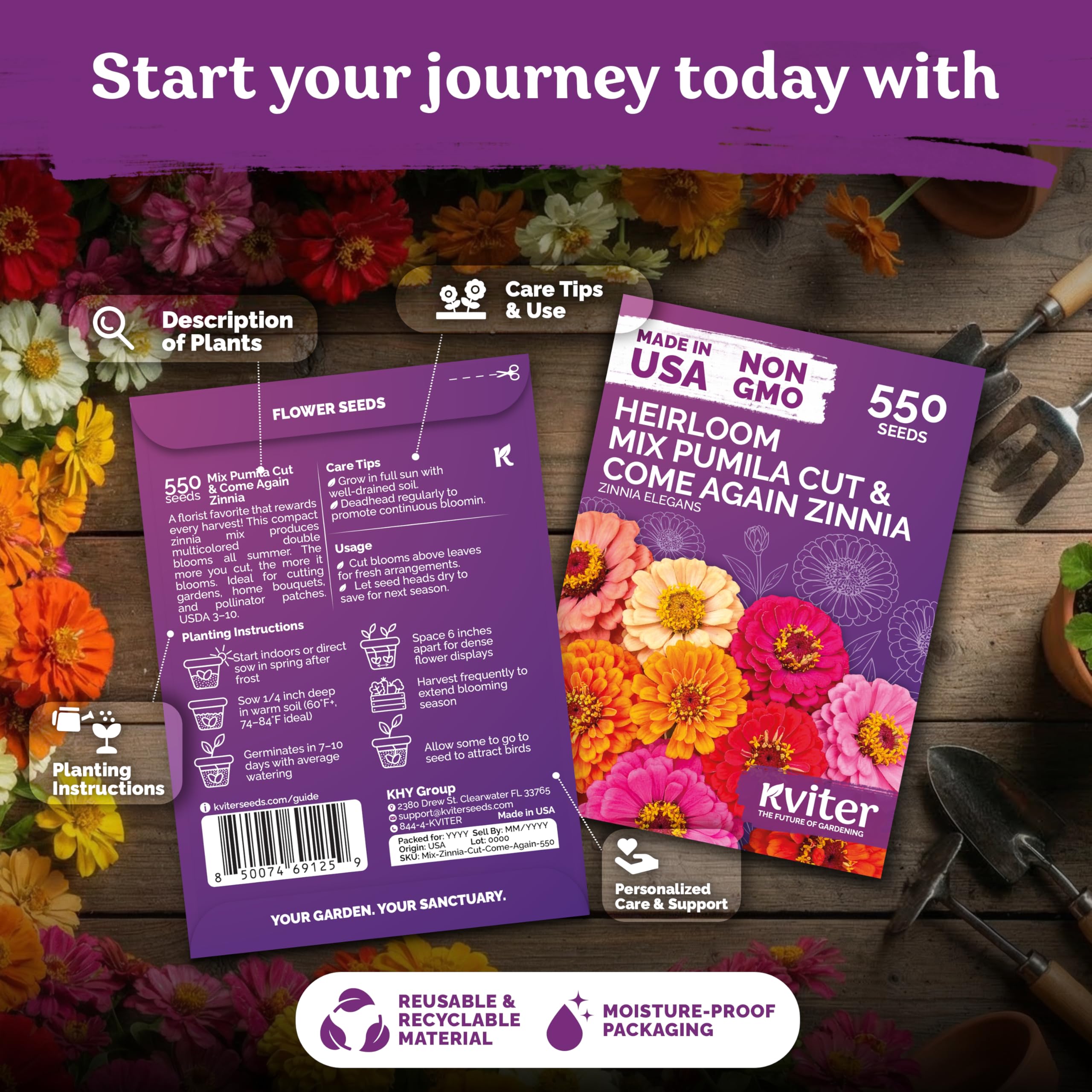 High Germination Rate: Sow Cut and Come Again zinnia seeds for planting ¼ in deep, sprouts in 7-10 days at 74-84 °F, with 90% germination across USDA 3-10, unleashing double blooms for gardens, containers, seed packets.