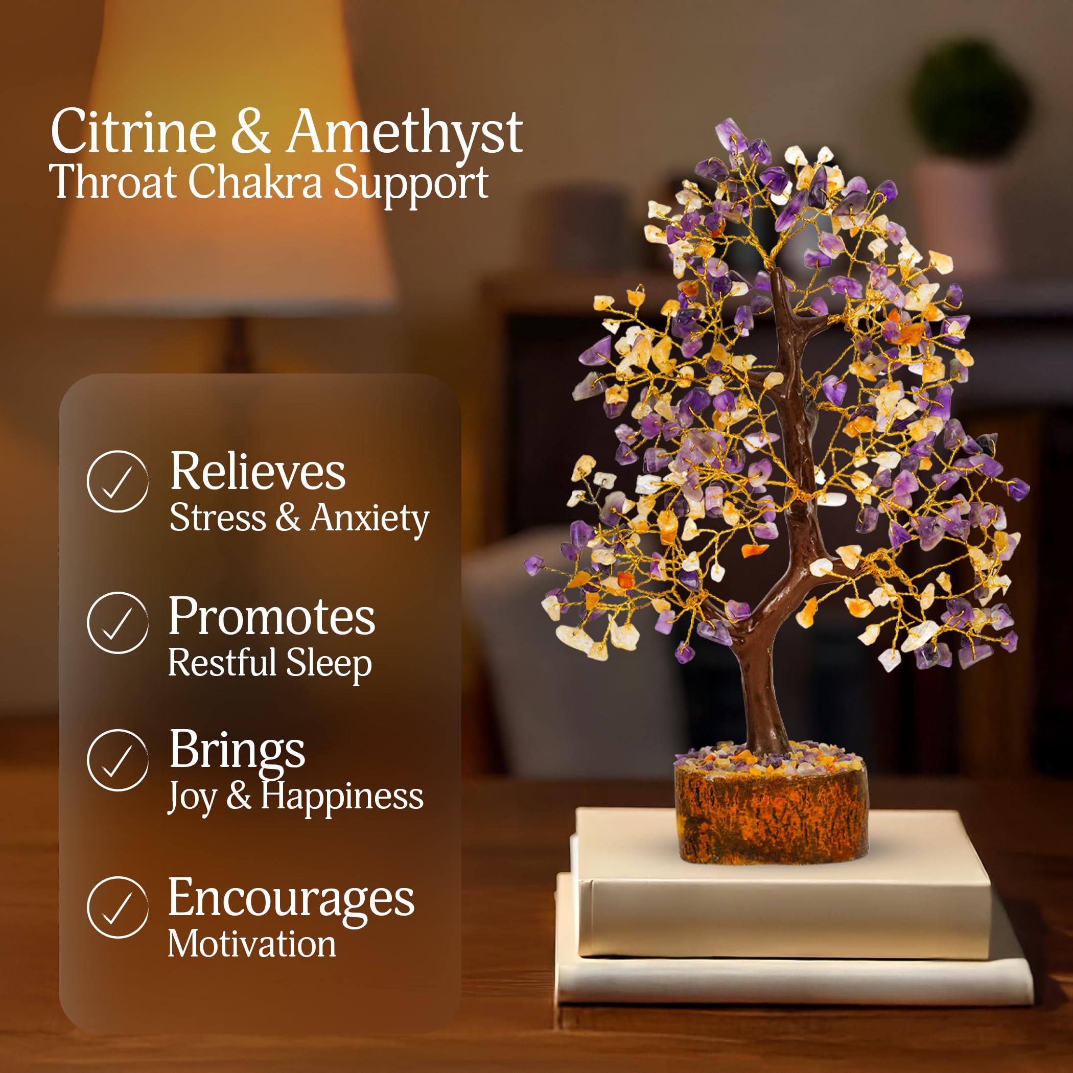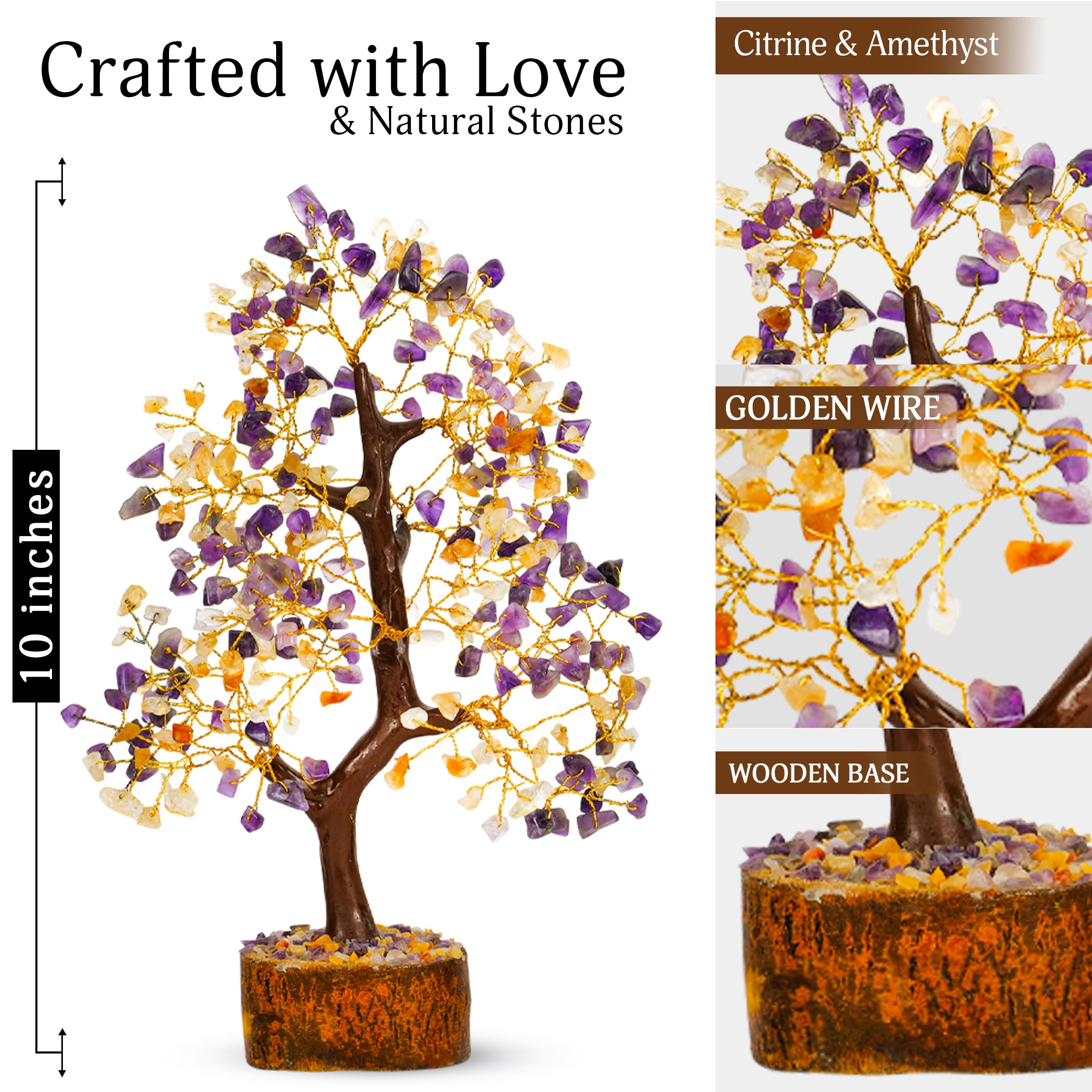 Citrine & Amethyst Crystal Tree - A wonderful chakra healing masterpiece from the coasts of India. From a crystal gemstone to a final product, with craftsmanship, this reiki crystal tree is filled with healing energy. Symbolizing like a bonsai tree, the feng shui bonsai figurine's branches are beaded amidst natural citrine & amethyst crystals. Base of this home decorative item is made from wood. The trunk is made of Mseal & branches is built from golden wire, making it approx 10-12 inch