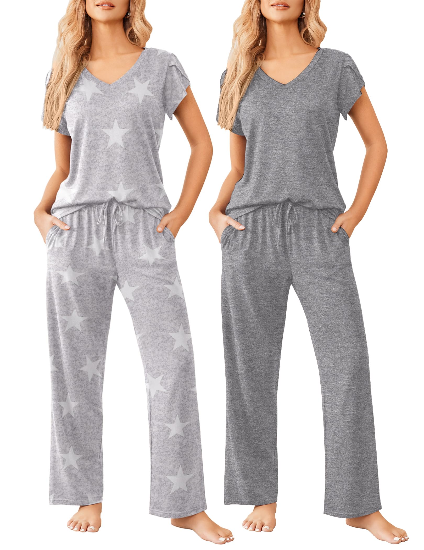 【Features】Ekouaer 2 Packs Pajama Sets features short sleeve,v neck pajamas tops with fashion petal sleeve,and elastic waistband,adjustable waist drawstring,2 side pockets pjs pants.Cute print,loose casual lounge sets,it is a must-have pajamas for your wardrobe.