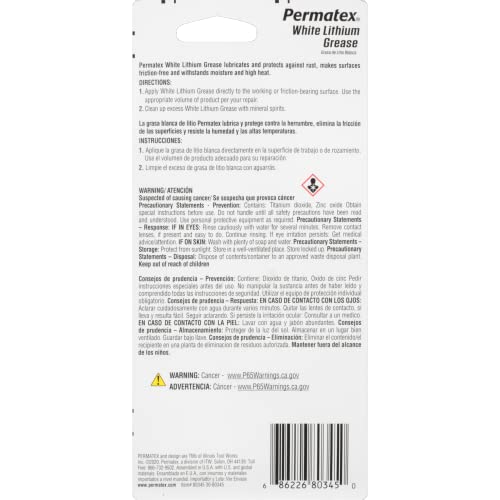 Permatex White Lithium Grease is an all-purpose white lubricant for metal-to-metal and metal-to-plastic applications. This lubricant protects against rust, makes surfaces friction-free and withstands moisture and high heat. Level 3. Widely known and trusted, these tried and true Permatex lubricants work to protect and lubricate virtually every automotive part and component.