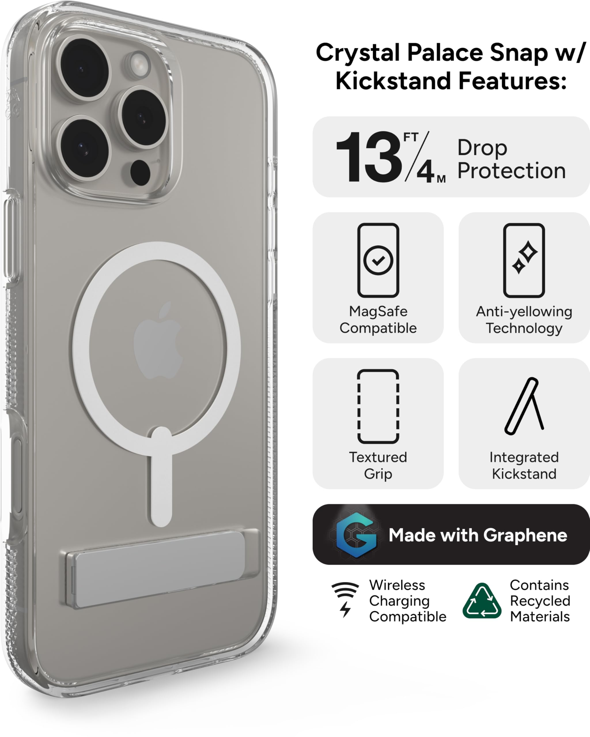 Your iPhone 16 Pro Max is more than just a phone—it's an essential part of your daily life. With the ZAGG Crystal Palace Snap with Kickstand, you don’t have to choose between protection, style, and functionality. This clear iPhone 16 Pro Max case is designed to survive the unexpected, from sudden drops to long days on the go. Imagine this: You’re rushing to catch a train, and your iPhone slips from your hand. But instead of the gut-wrenching sound of your phone shattering on the ground, you pick it up with confidence. Thanks to the ZAGG Crystal Palace Snap case, your iPhone is safe and sound, protected by graphene—a material up to 200 times stronger than steel. The iPhone 16 Pro Max clear case absorbs the shock of a 13-foot drop like a pro, keeping your phone pristine. Not only does this case offer ultimate protection, but it also lets your iPhone’s beauty shine through. Equipped with advanced anti-yellowing technology and an anti-scratch finish, the Crystal Palace Snap case stays clear and flawless, no matter how tough your day is. The textured grip keeps your phone securely in hand, and when it’s time to relax, the integrated kickstand lets you enjoy hands-free video calls or binge-watching your favorite shows. Plus, it's MagSafe compatible, so you can snap your phone onto any MagSafe charger or accessory without removing the case. Made with up to 56% recycled materials, it’s an eco-friendly choice for those who want to protect both their phone and the planet. Key Features: Survives drops up to 13ft with graphene reinforcement Anti-yellowing technology keeps the case crystal clear Textured edges for a secure, no-slip grip Fingernail-friendly kickstand for hands-free viewing MagSafe and wireless charging compatible Made with 56% recycled materials Anti-scratch finish for long-lasting clarity Limited lifetime warranty