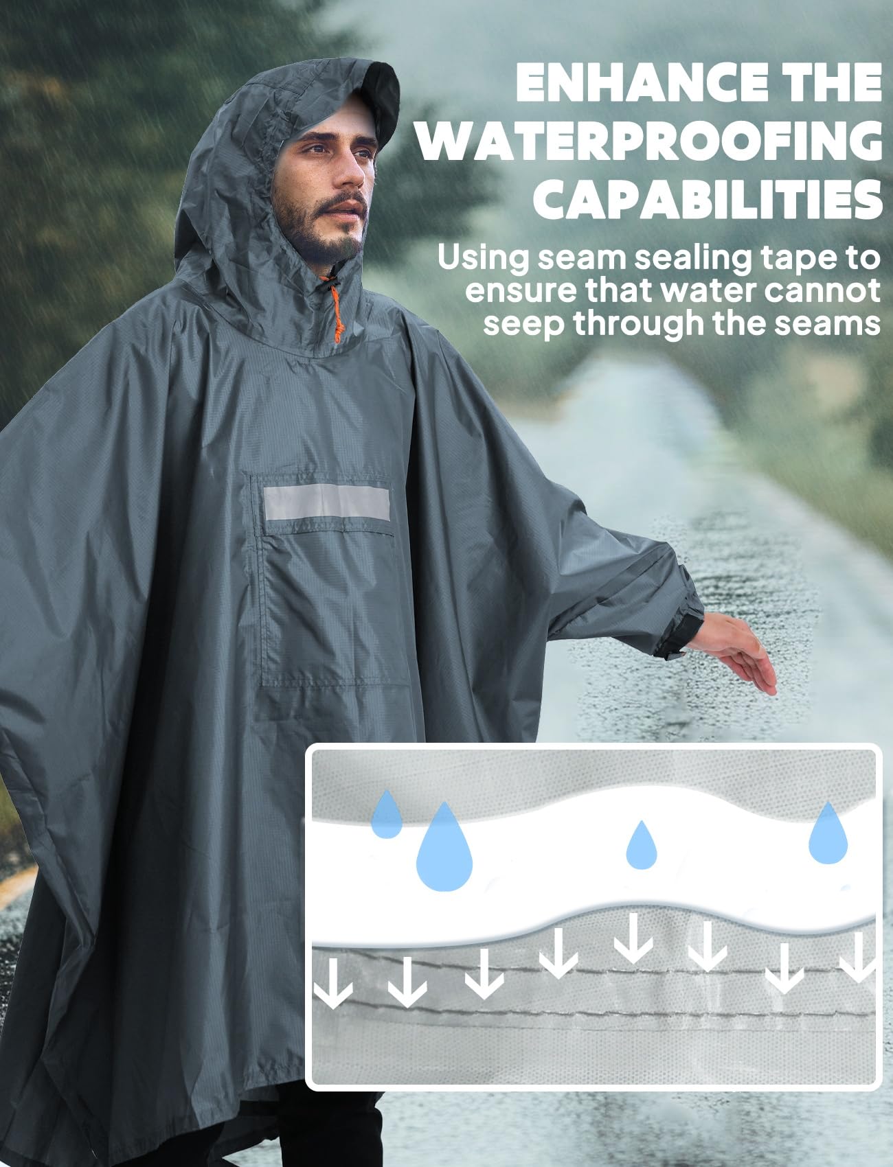 Waterproof and Sturdy Material: The rain poncho is made of 210T ripstop polyester + TPU coating, this rain poncho is PU8000MM waterproof.To enhance the waterproofing capabilities of a rain poncho,we use techniques such as seam sealing or taping to ensure that water cannot seep through the seams.It comes with a drawstring hood, hook and loop fasteners along the sides ensures the optimal fit,which is good for protecting your head and face.