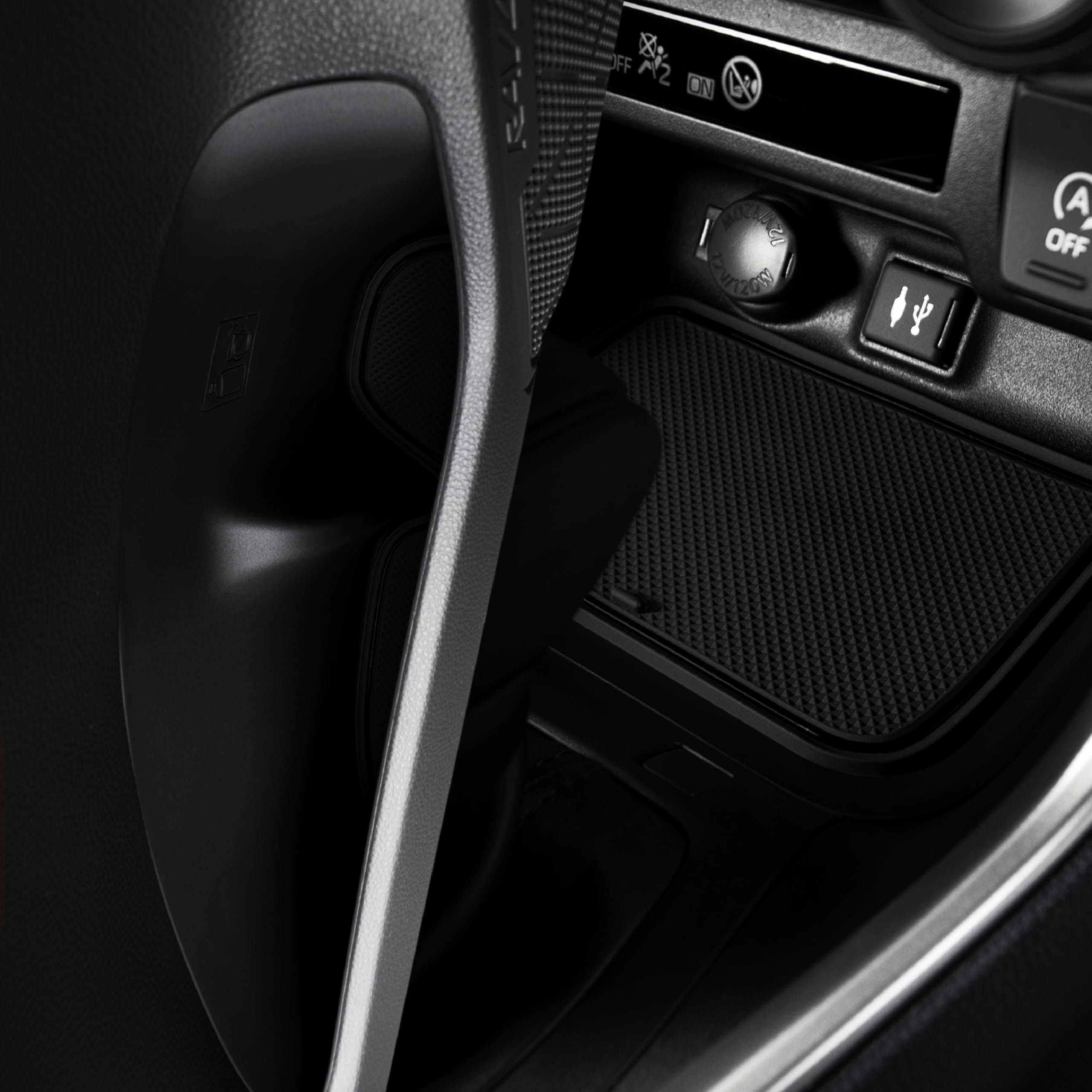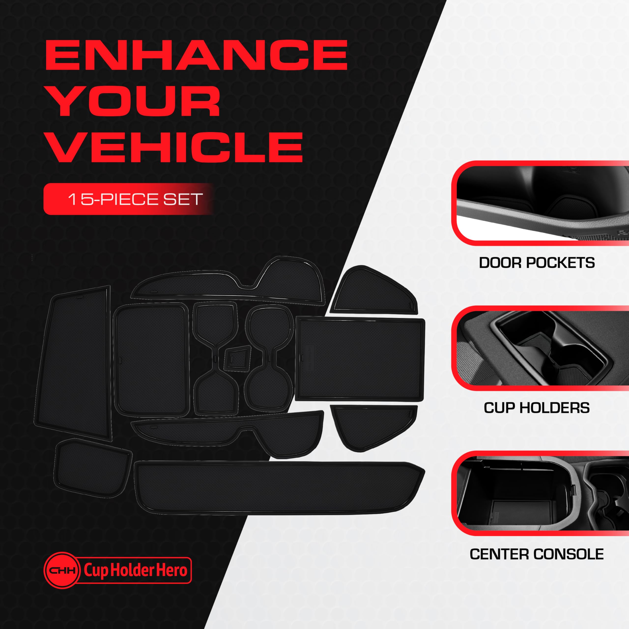 RAV4 Compatible Accessories that keep your car looking new - Our custom car interior liners and cup holder mats are engineered in the USA with a unique design that offers a precise fit you won't find elsewhere, perfectly placed tab handles for easy removal, a sleek mods look without logo designs that gather grime, and a patented all-weather material that withstands heat up to 170 degrees without the “rubber tire” smell