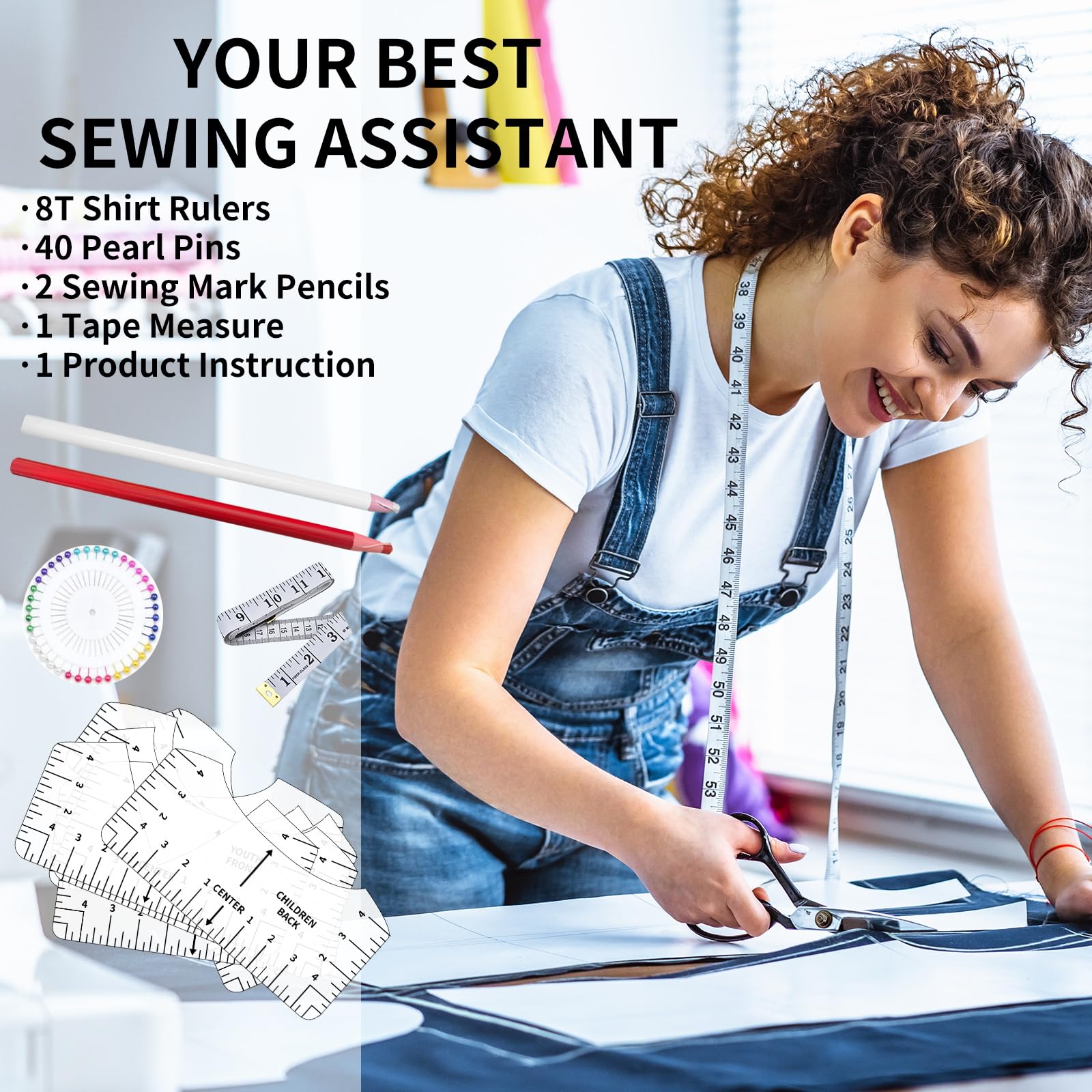🥼【What You Get】Tietoc 12pcs ORIGINAL Tshirt vinyl alignment tool set contains 8pcs all kinds size t shirt rulers, 1pcs soft measuring tape, 2pcs sewing mark pencil, 1pcs 40 multi-color pins for fixing & product instruction to let you know the size and placement of your design. These rules can meet the design needs of the whole family clothes. Free your imagination and enjoy DIY fun from now on!