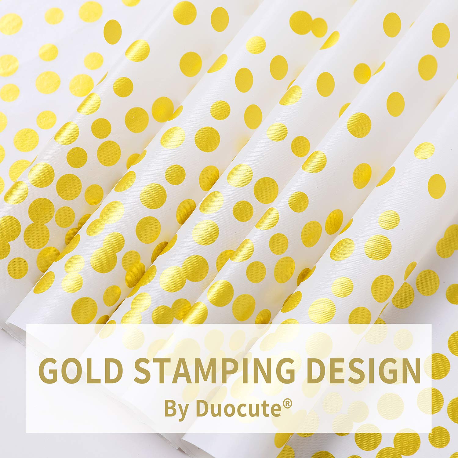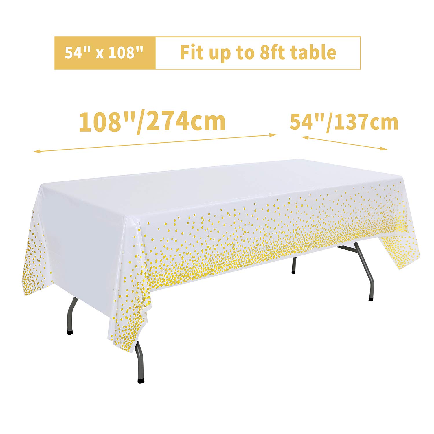 WHITE GOLD FOIL DOT DESIGN: White and gold dot tablecloth is designed to white background and golden foil polka dot pattern. The tablecloth is all enhanced with attractive golden foil dot. Adding an elegant, modern touch to any party. Perfect choice for a white and golden themed party.