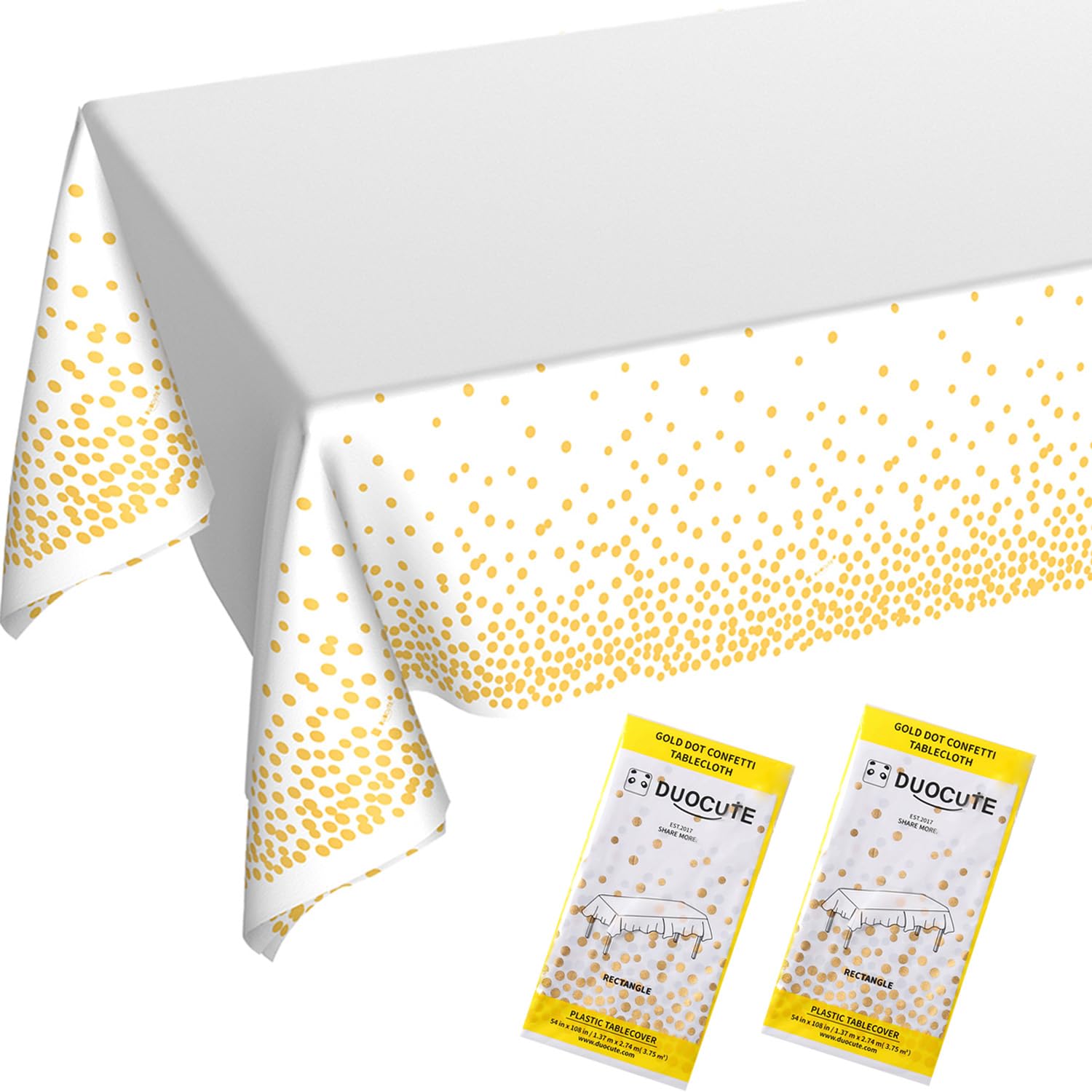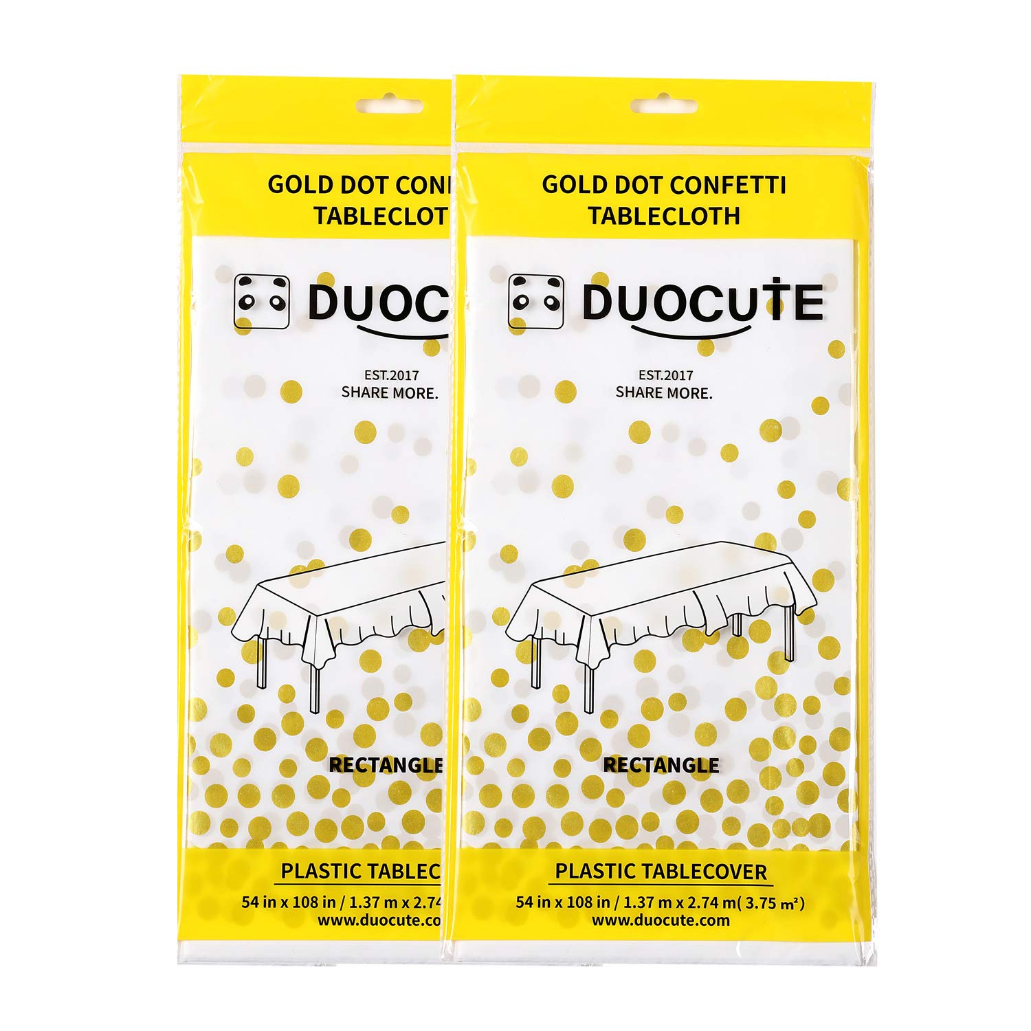 "The party tablecloth includes 5 different designs. Golden dot with Black, Golden dot with White, Golden dot with Blue, Golden dot with Pink, Rose gold dot with White. About DUOCUTE Duocute is committed to provide Premium Product for our millions of party lovers. Product Features : Size: Width x Length 54"" X 108"" / 137cm x 273cm Shape: Rectangle Material: Plastics PEVA Quantity: 2 Packs Ideal for Any Occasion: New year eve party,Wedding, bachelorette parties, girl and boy birthday parties, adult parties, bridal shower, housewarming parties, graduation and get-togethers."