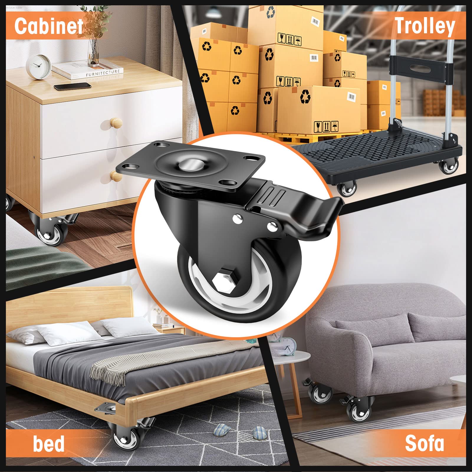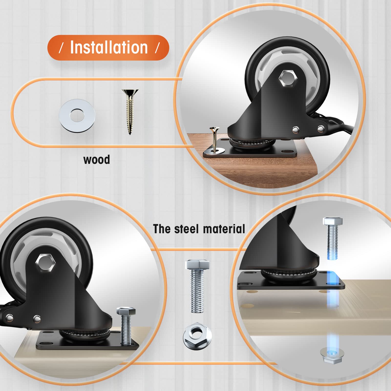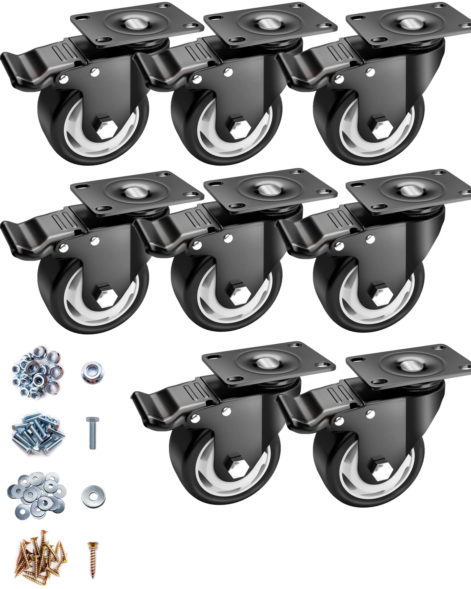 Casters Set of 8: Due to the convenience of customers, we have 8 casters in a set, which are delivered with pointed screws with washers, flat head screws with nuts. Each caster has a load of 375 pounds, and the quality is stable.