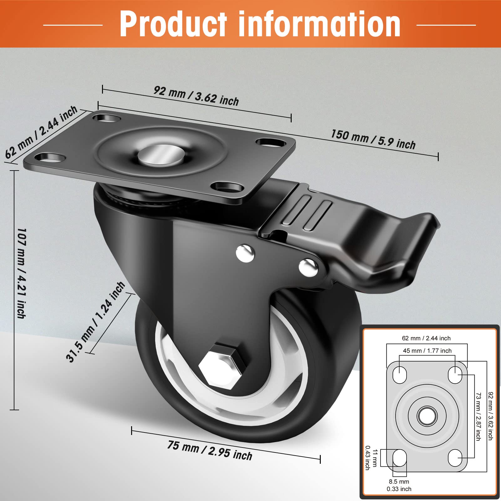 Typical Applications: Casters are widely used in benches, toolbox, trolleys, furniture, carts, dolly, workbench, trolley, suitable for indoor and outdoor, it is a mobile expert. What You Get: 3" casters set of 8 heavy duty, our worry-free 12-month warranty, and friendly customer service. We believed that our castor wheels will last a long time and it saves your time and effort
