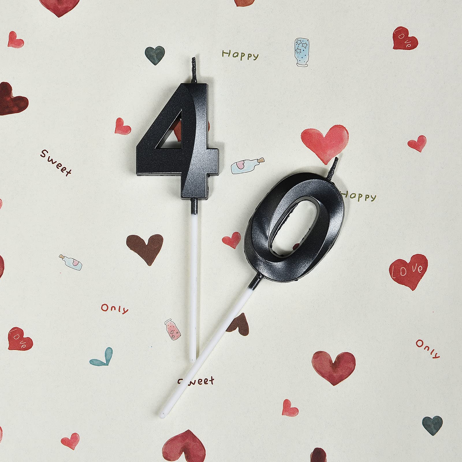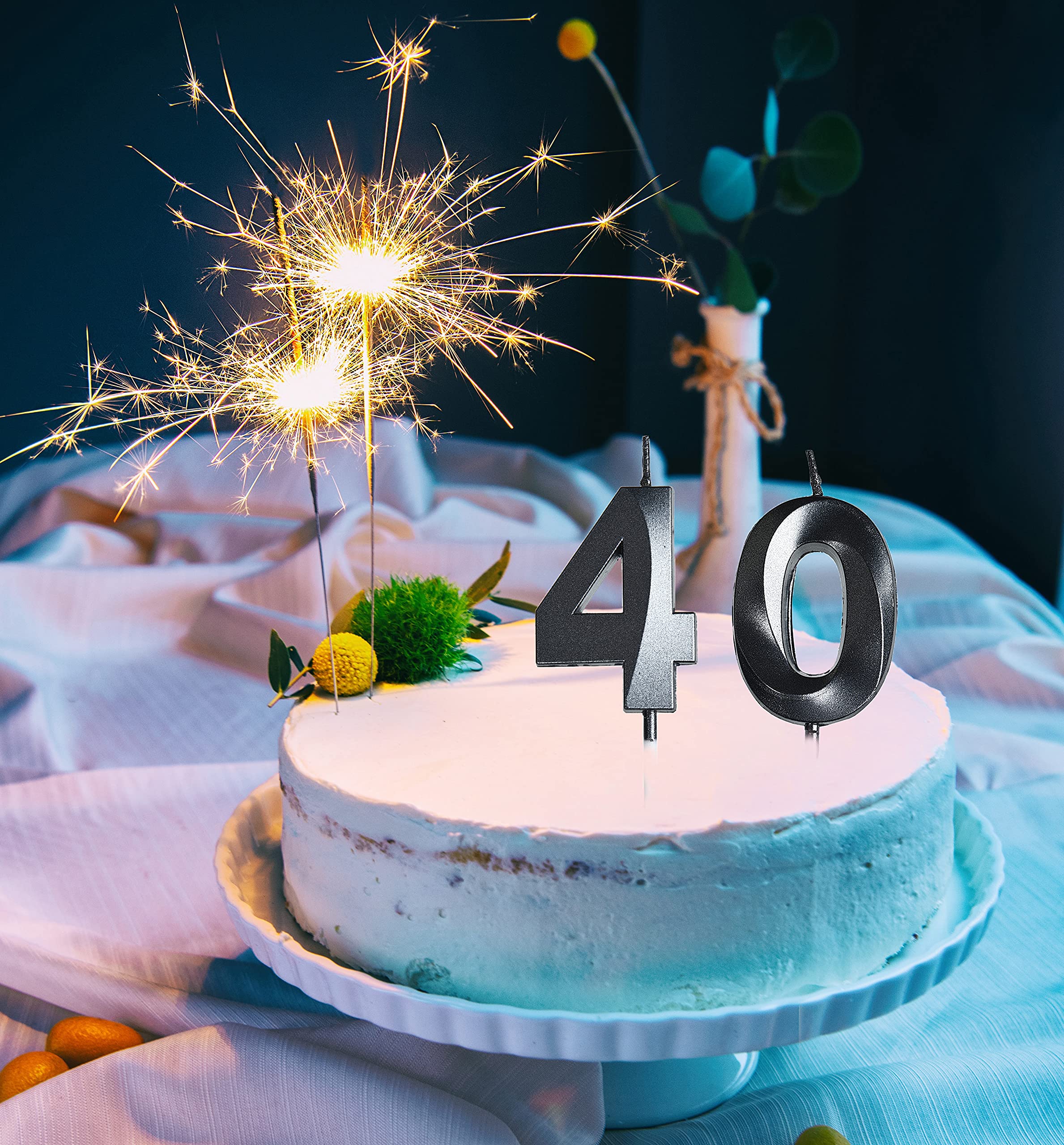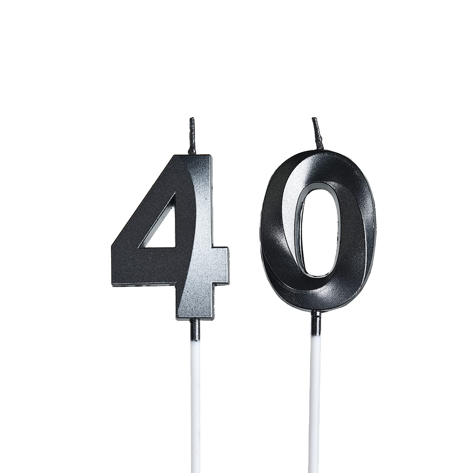 INSTRUCTIONS: Size: Width:1.3 in. Number height: 1.9 in. Total height: 4.8in Color : Glitter Black Material : quality wax ,smokeless and non-toxic Burning Time :approx 4-5 minutes Package included:2 Pcs ,Black Number 40 birthday candles PLEASE NOTE: Please keep the candles in shade away from the fire and make sure the size match to your birthday cakes