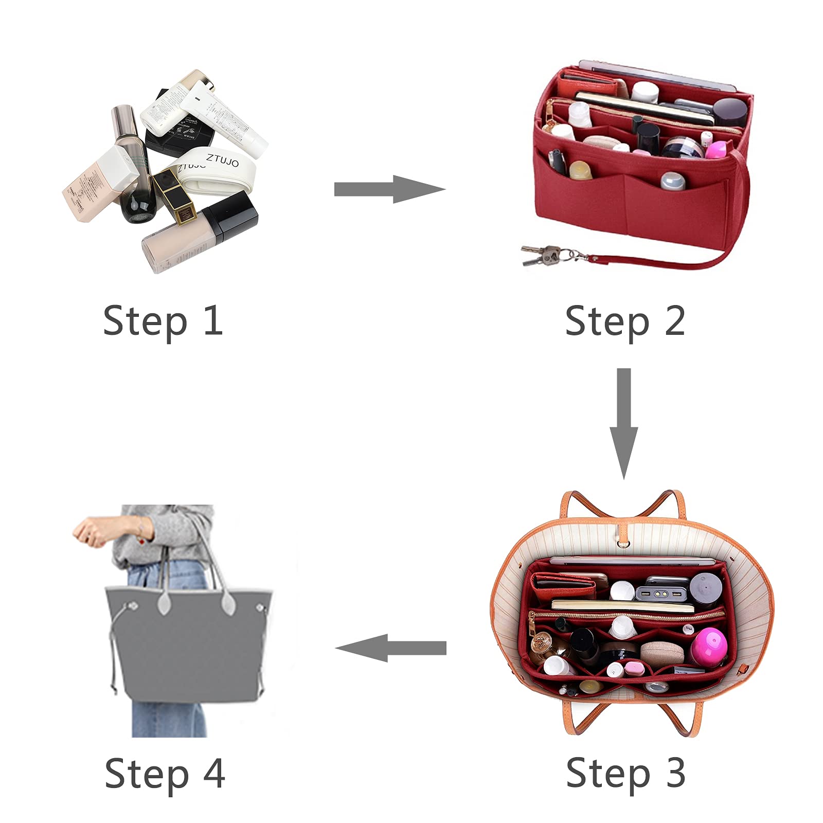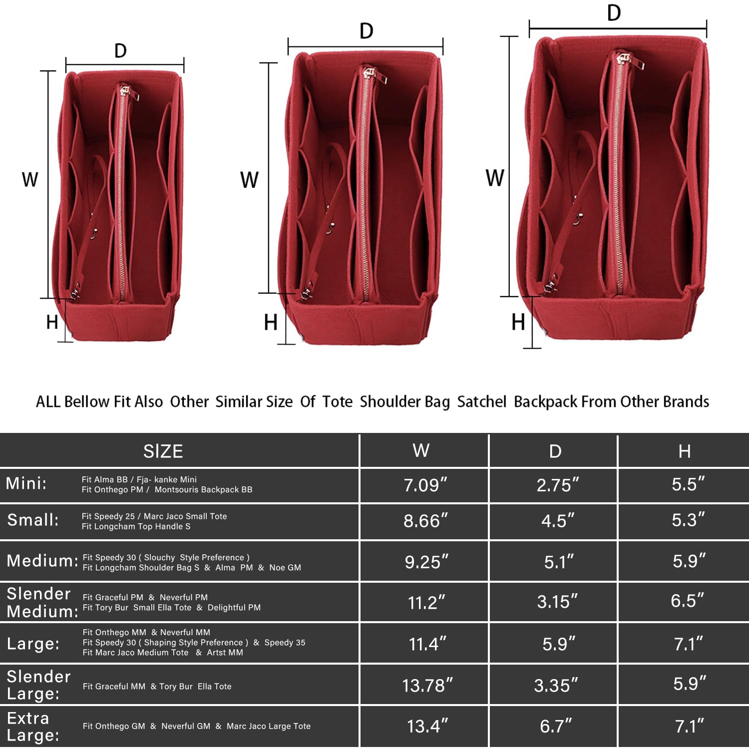 💗SIZE OF BAG ORGANIZER: Mini Purse Organizer: 7.09(W)*5.5(H)*2.75(D) inch Fits Alam BB and Fja-Kanke Mini ;onthego Pm and Montsouris BB. Small Purse Organizer: 8.66(W)*5.3(H)*4.5(D) inch Fits MJ Small Tote, Speedy 25, LC op Handle S and Book Tote New Small. Medium Purse Organizer:9.25(W)*5.9(H)*5.1(D)inch Fits 30 (Slouchy Style Preference). Slender Medium Purse Organizer: 11.2(W)*6.5(H)*3.2(D)inch Fits Graceful PM and Delightful PM