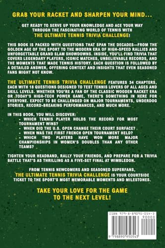 Grab your racket and sharpen your mind... Get ready to serve up your knowledge and ace your way through the fascinating world of tennis with The Ultimate Tennis Trivia Challenge! This book is packed with questions that span the decades—from the golden age of the sport to the modern era of high-speed rallies and unforgettable Grand Slam showdowns. Inside, you'll find trivia that covers legendary players, iconic matches, unbelievable records, and the moments that made tennis history. Each question is followed by a detailed answer, offering context and insights that even seasoned fans might not know. The Ultimate Tennis Trivia Challenge features 34 chapters, each with 18 questions designed to test tennis lovers of all ages and skill levels. Whether you're a fan of the classic wooden racket era or today’s high-tech power game, there's something in here for everyone. Expect to be challenged on major tournaments, underdog stories, record-breaking performances, and much more. In this book, you will discover: Which tennis player holds the record for most tournament wins? When did the U.S. Open change their court surface? When was the first French Open tournament held? Which two players have won more major championships in women’s doubles than any other teams? From Tennis newcomers and seasoned superfans, The Ultimate Tennis Trivia Challenge is your courtside ticket to the sport's most memorable moments and milestones making it an excellent tennis gift to yourself or loved ones. Let’s take your love for the game to the next level, shall we?