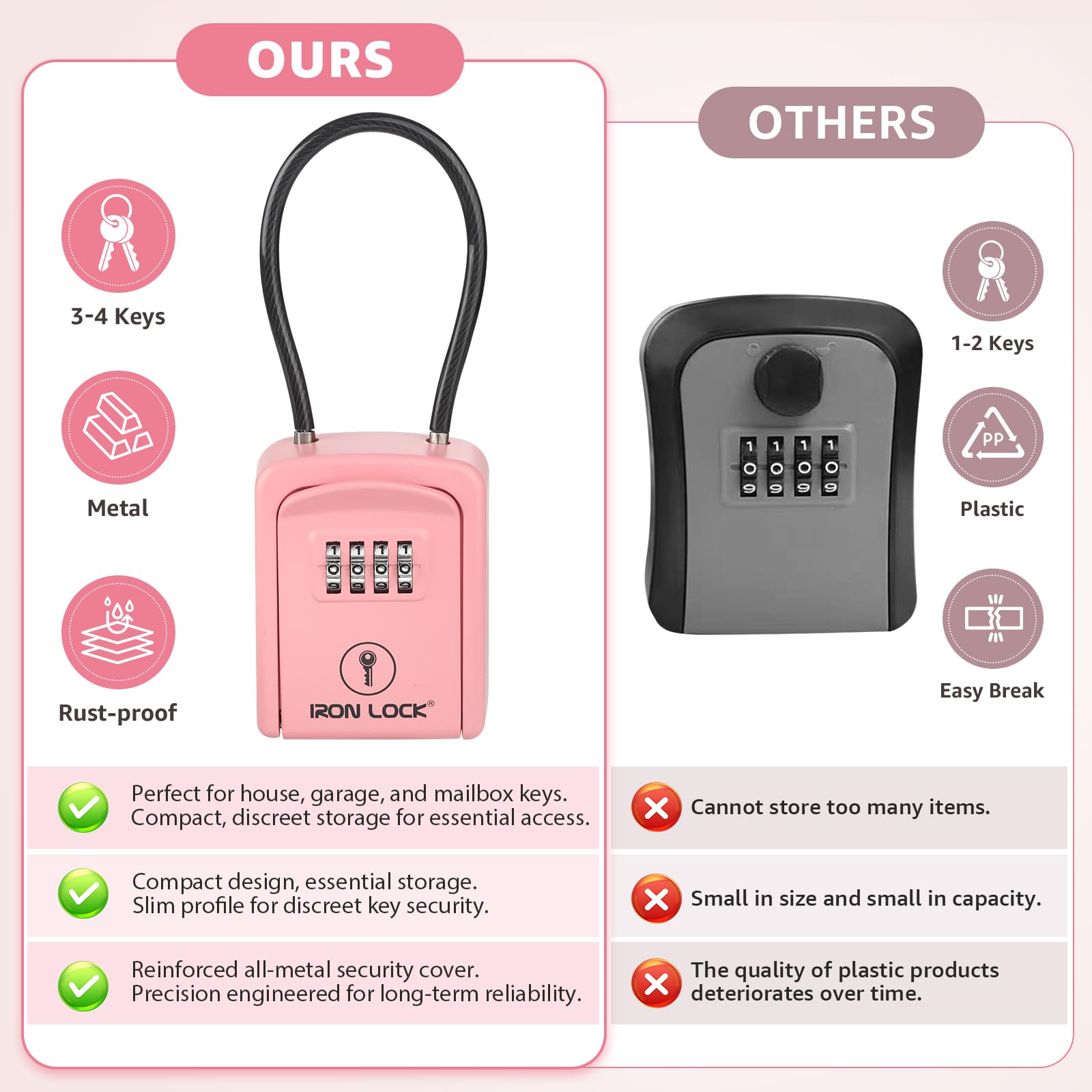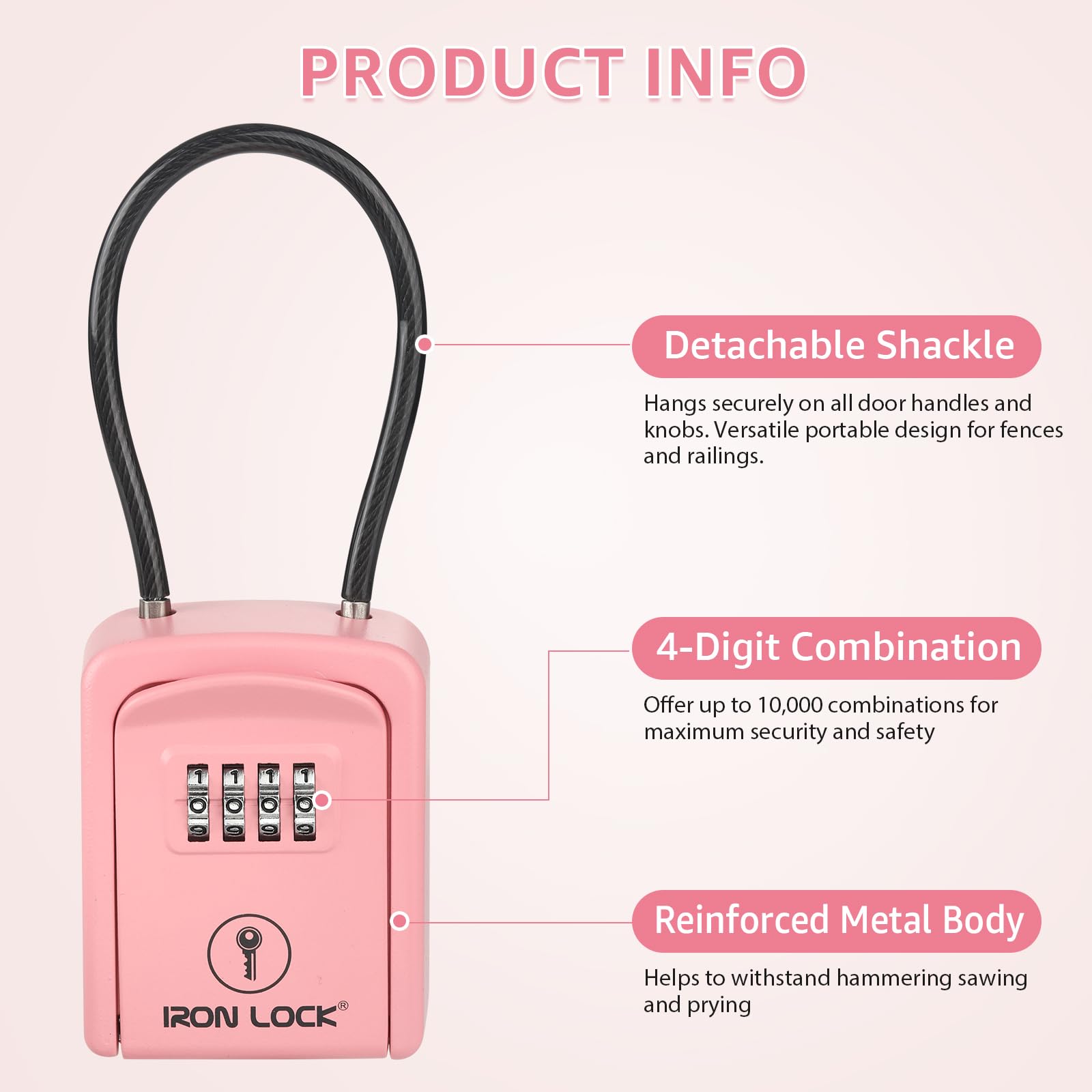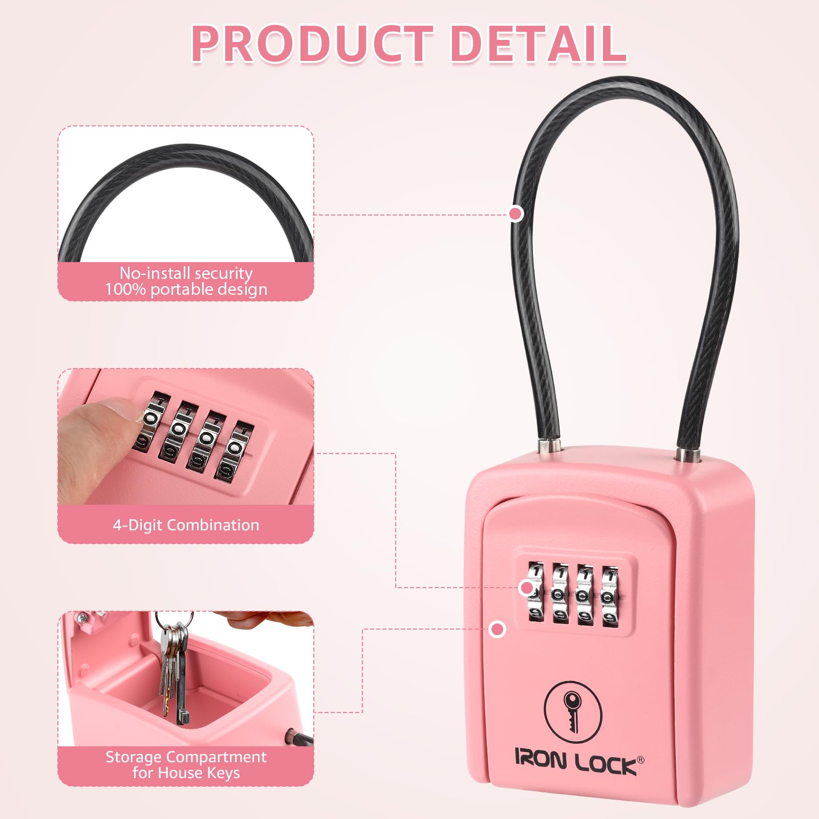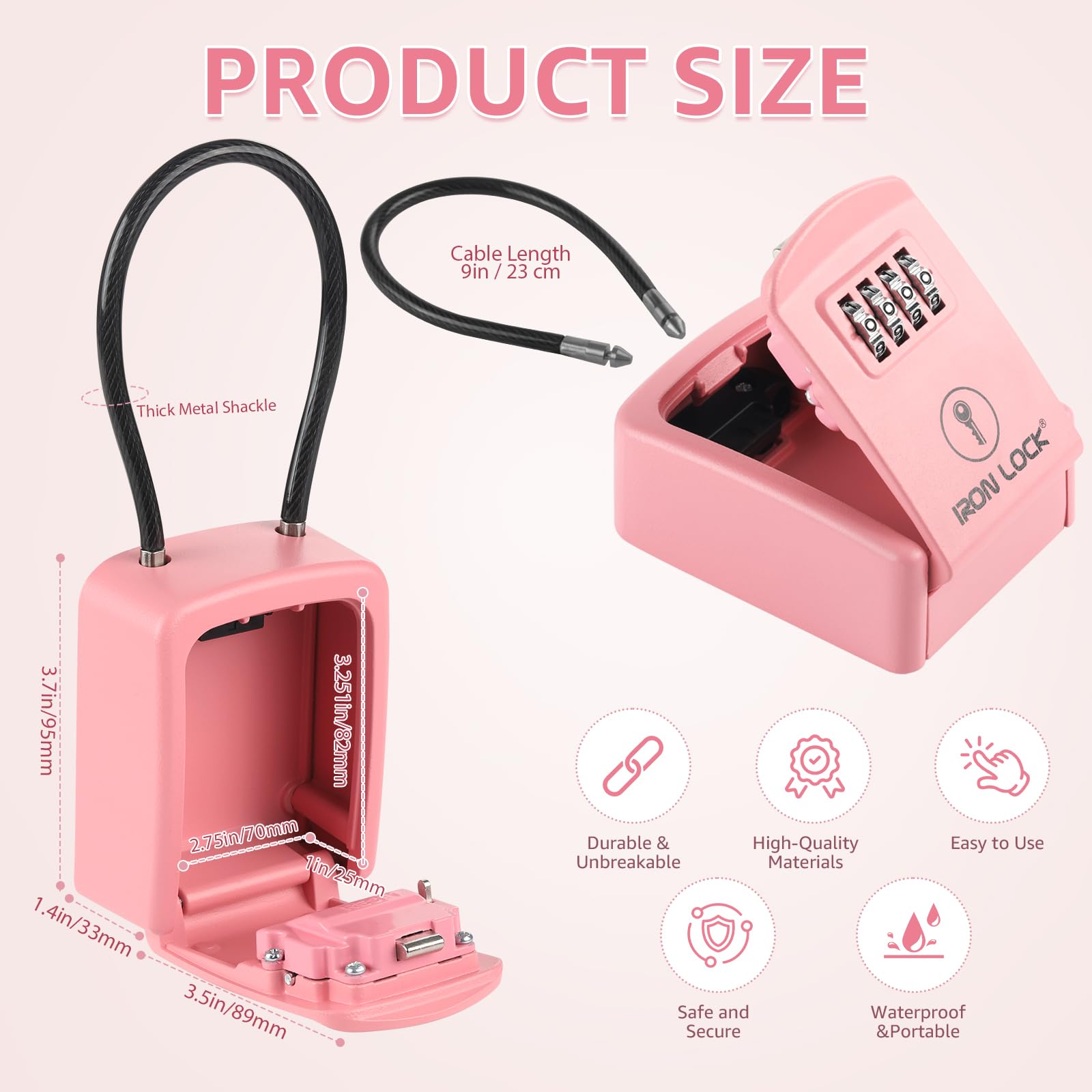 Iron Lock Small Portable Key Lock Box with Cable Shackle is the simple, secure way to share access—without hiding keys under a mat or leaving them with a neighbor. Designed for flexible, on-the-go placement, this compact lock box uses a strong cable shackle that wraps around railings, fences, gate handles, doorknobs, pipes, and many other fixed points, so you can put it exactly where it’s most convenient and visible for the person who needs access. Secure Key Storage Made Easy Store house keys, mailbox keys, gate keys, or small access cards in a protected compartment, then set your own combination so you control who can open it. It’s ideal for temporary access (a cleaner, dog walker, contractor, or guest) or ongoing access (family members, property managers, or service teams). Portable Cable Shackle = More Placement Options Unlike wall-mounted lock boxes that require drilling, the cable shackle gives you freedom: move it from one location to another, use it at different properties, or reposition it based on the best entry point. Great for apartments, rentals, and anywhere you can’t—or don’t want to—install hardware. Built for Real-World Use Iron Lock is made to hold up to everyday handling with a durable, secure housing and a practical design that helps protect the combination area during use. The compact size keeps it discreet while still providing reliable storage for the essentials. Perfect For Airbnb / vacation rentals & guest access Real estate showings & lockbox access Property management & maintenance teams Cleaners, contractors, dog walkers, caregivers Home backup access for family and emergencies