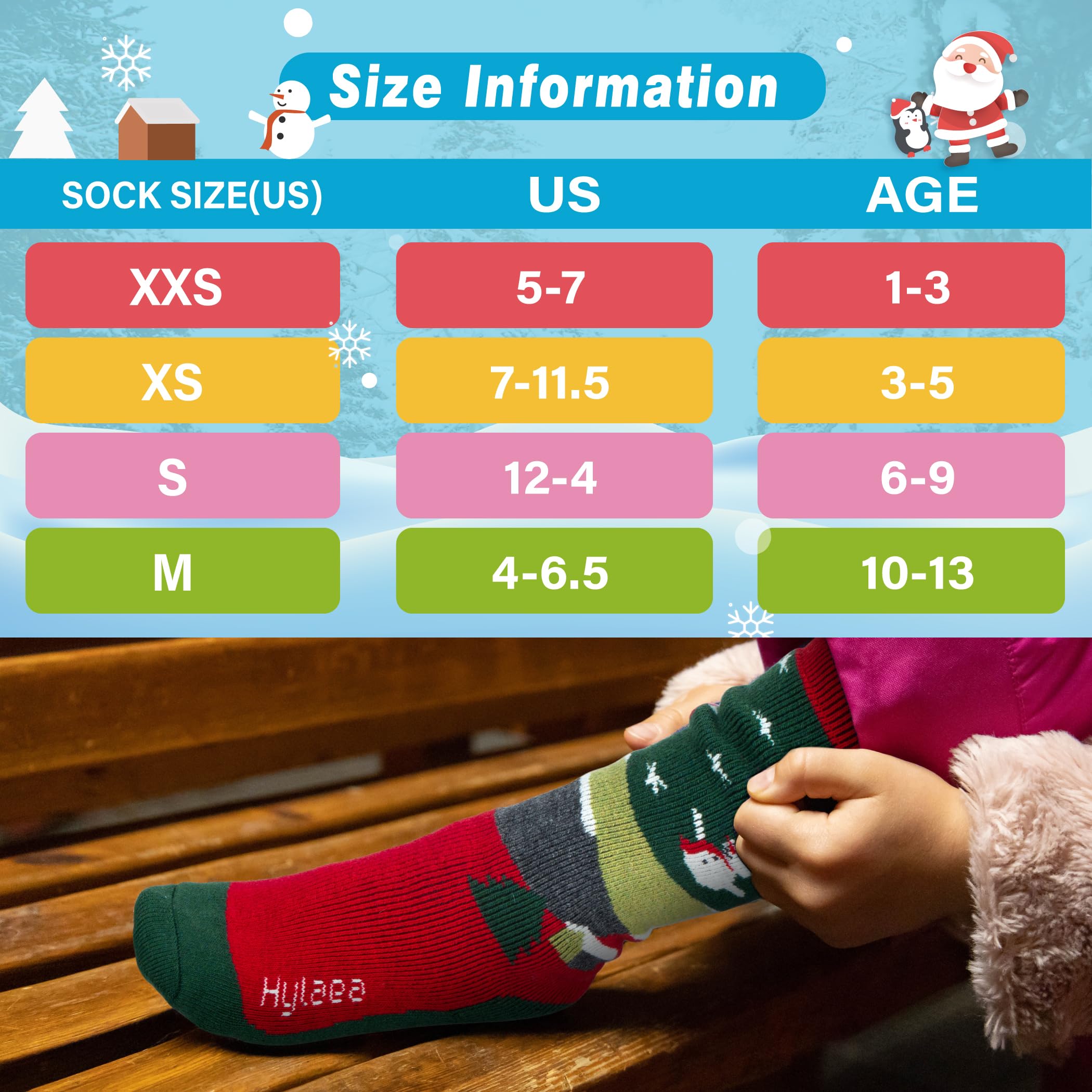 Size Chart: Please read the size chart carefully in the image. Our children's ski socks are perfect for boys/girls/toddlers/youth. X-Small fits US size 7-11.5 (3-5 years old); Small fits US size 12-4 (6-9 years old); Medium fits US size 4-6.5 (10-13 years old)