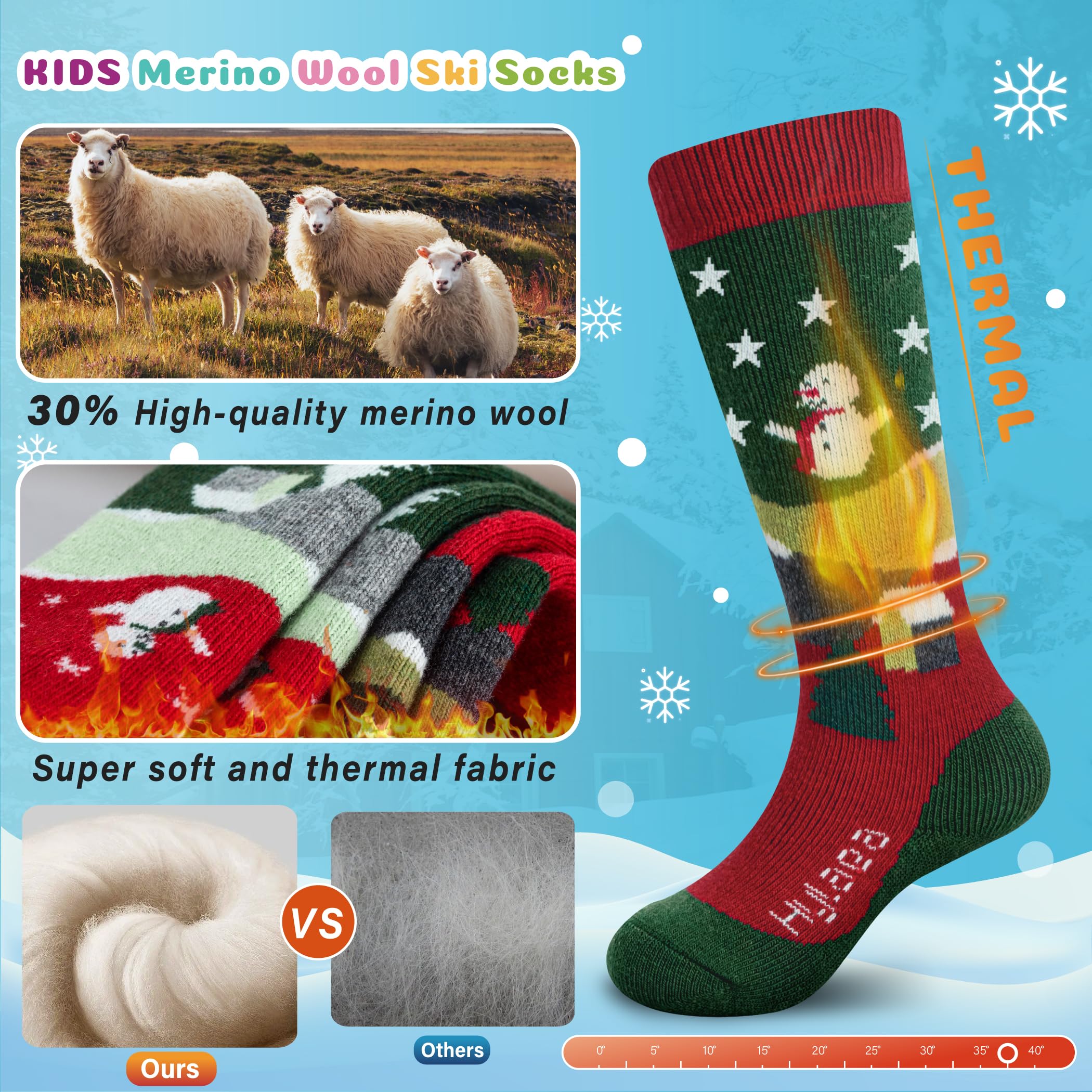 Merino wool Socks for boys and girls: These kids skiing socks are made from merino wool, a breathable, odor resistant, moisture wicking and thermal fabric, which can keep your kid’s feet warm in cold weather to enjoy more outdoor activities in winter