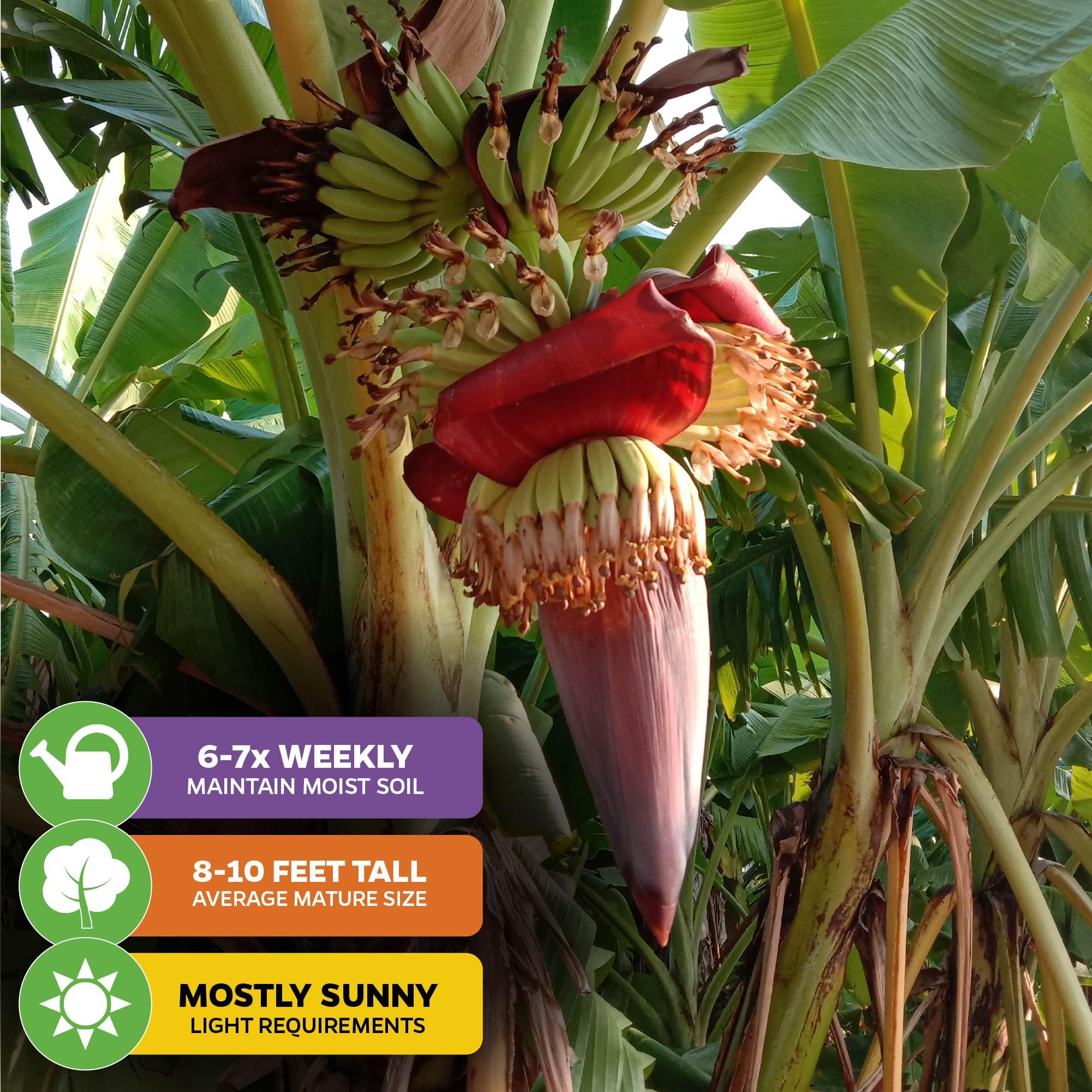 MATURE SIZE & CARE GUIDE: Reaches an average mature height of 8-10 feet and thrives in Zones 8-11. Basked in sunlight, it will flourish in well-drained, rich soil, with an N/P/K fertilizer ratio of 3:1:6, like Wellspring Gardens' Banana Fuel Fertilizer. Take caution against freezing temperatures below 35°F. Administer 1/4 teaspoon of fertilizer weekly for indoor potted plants, 1/2 teaspoon for outdoor potted ones, and 1 teaspoon for outdoor landscape plants.