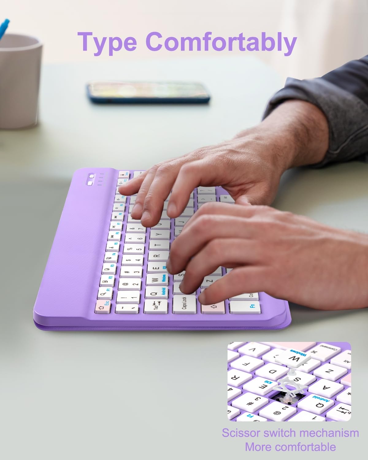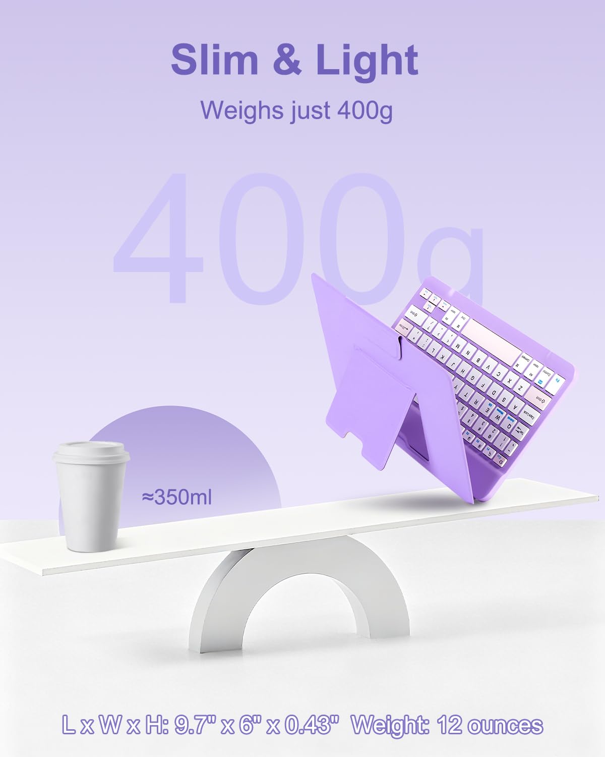 【Ultra-Slim and Portable with PU Material】This slim keyboard (9.7" x 6" x 0.43", 12 oz) fits easily into a briefcase or laptop bag. Perfect for use on airplanes, in libraries, at cafes, or anywhere else you want. Its stylish PU leather cover and ultra-light hardboard provide effective support while maintaining a lightweight and premium feel.