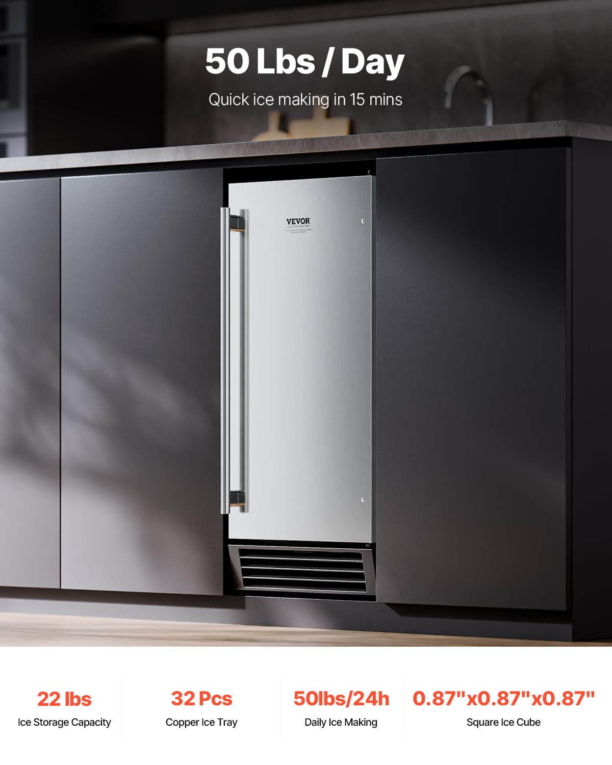 Fast Ice Making & Large Ice Storage: Our undercounter built-in ice maker can produce up to 50 lbs of ice within 24 hours and store up to 22 lbs. It features a 32-cube copper ice tray, making square ice cubes (0.87x0.87x0.87 inch) in as fast as 15 minutes. Ideal for home use or parties.