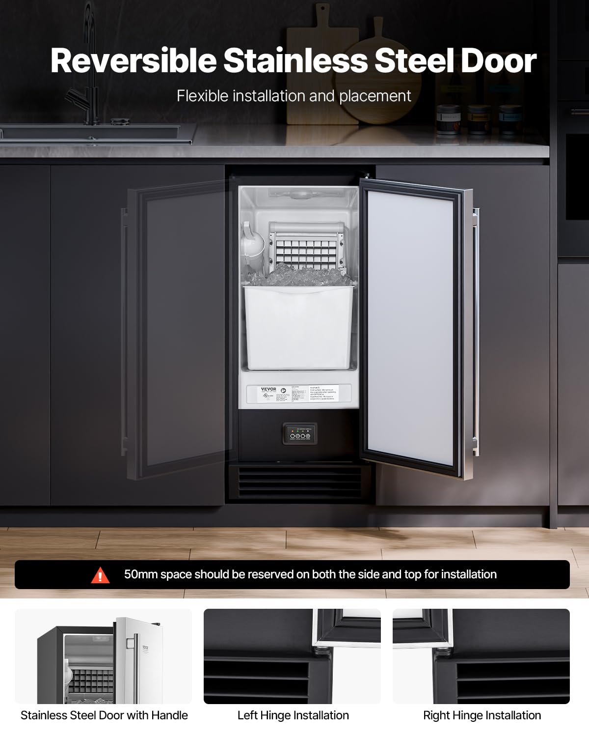 Flexible Installation: Equipped with a reversible stainless steel door and a full-length handle, this built in ice maker can be installed with either a left-hinged or right-hinged door for flexibility. It supports various installation types (undercounter, freestanding, or built-in), and requires 50mm of clearance on the sides and top for proper installation.
