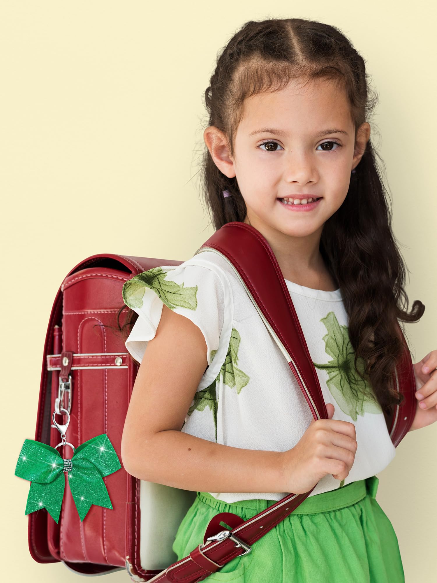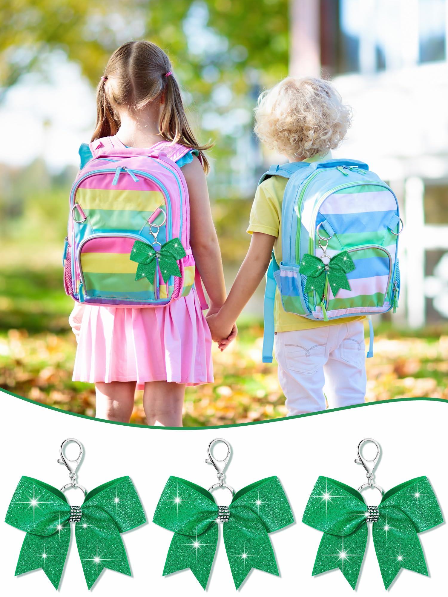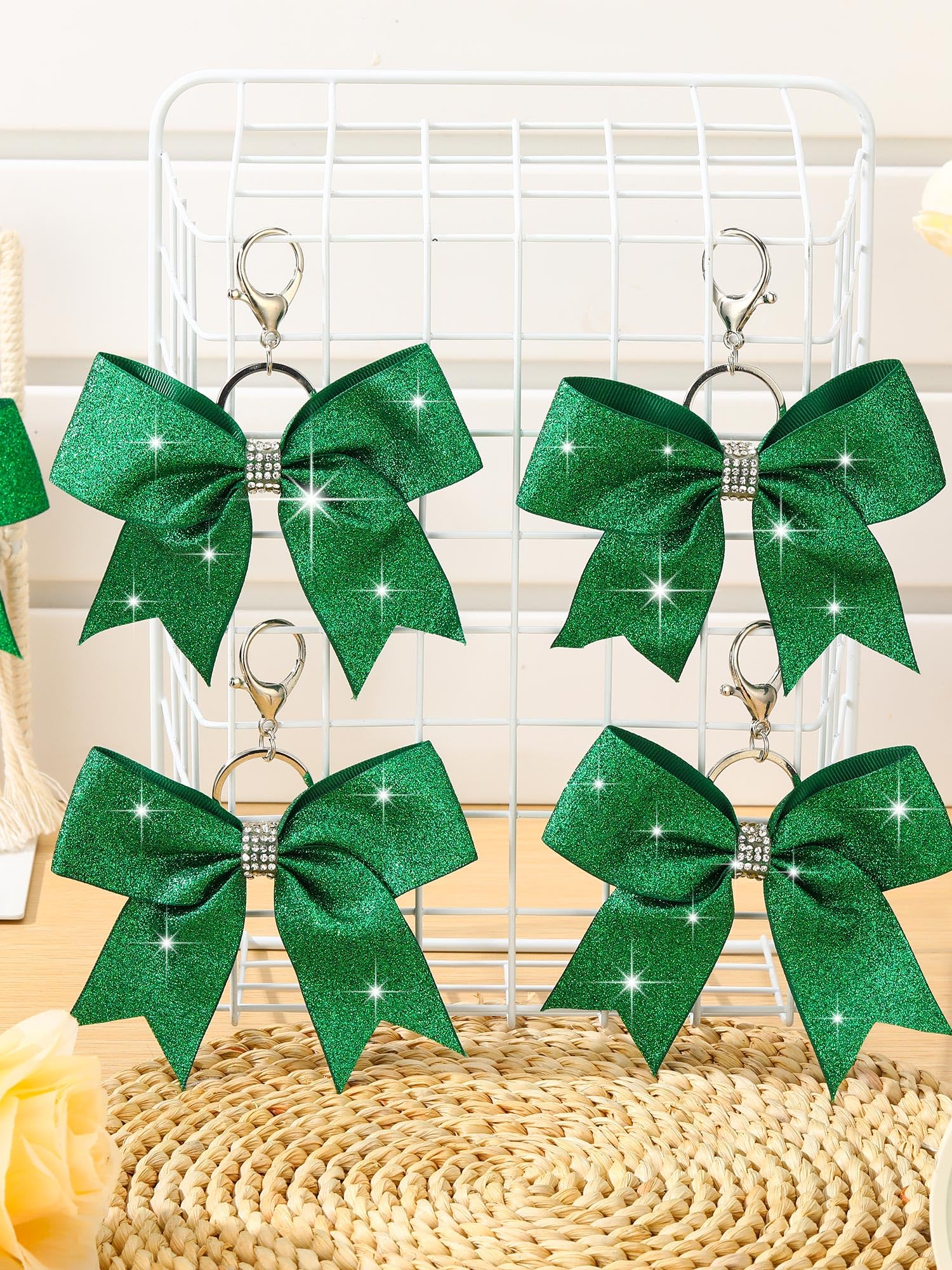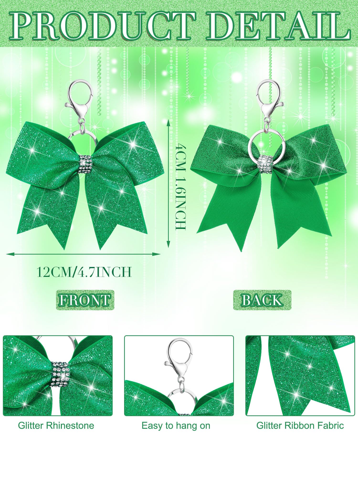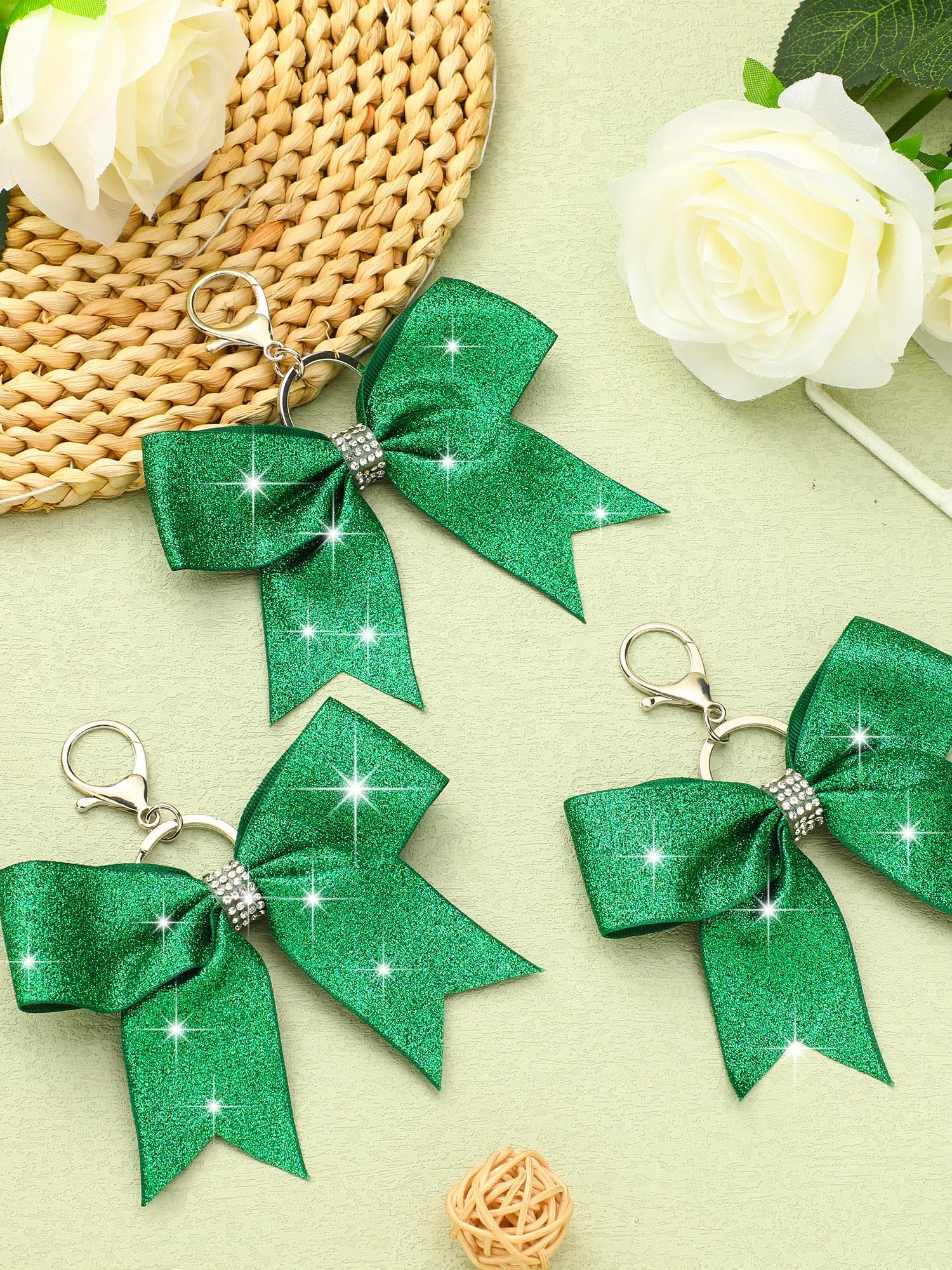 Quality Material: our green glitter bow key chains are made out of fabric, sturdy metal, and rhinestones; This trio of materials makes a product that's not only visually appealing but is also designed to withstand daily usage; You can expect longevity and continuity of the aesthetic appeal