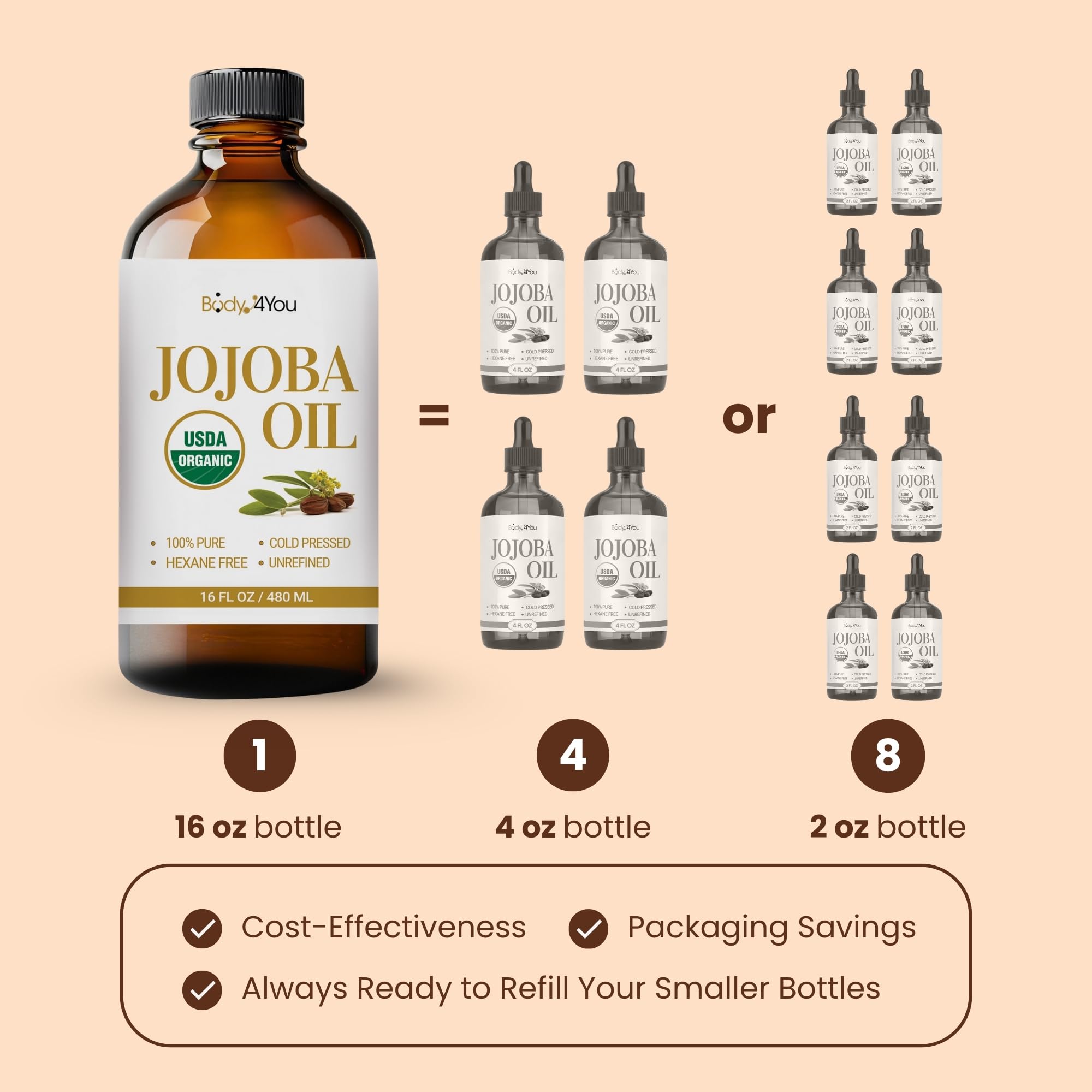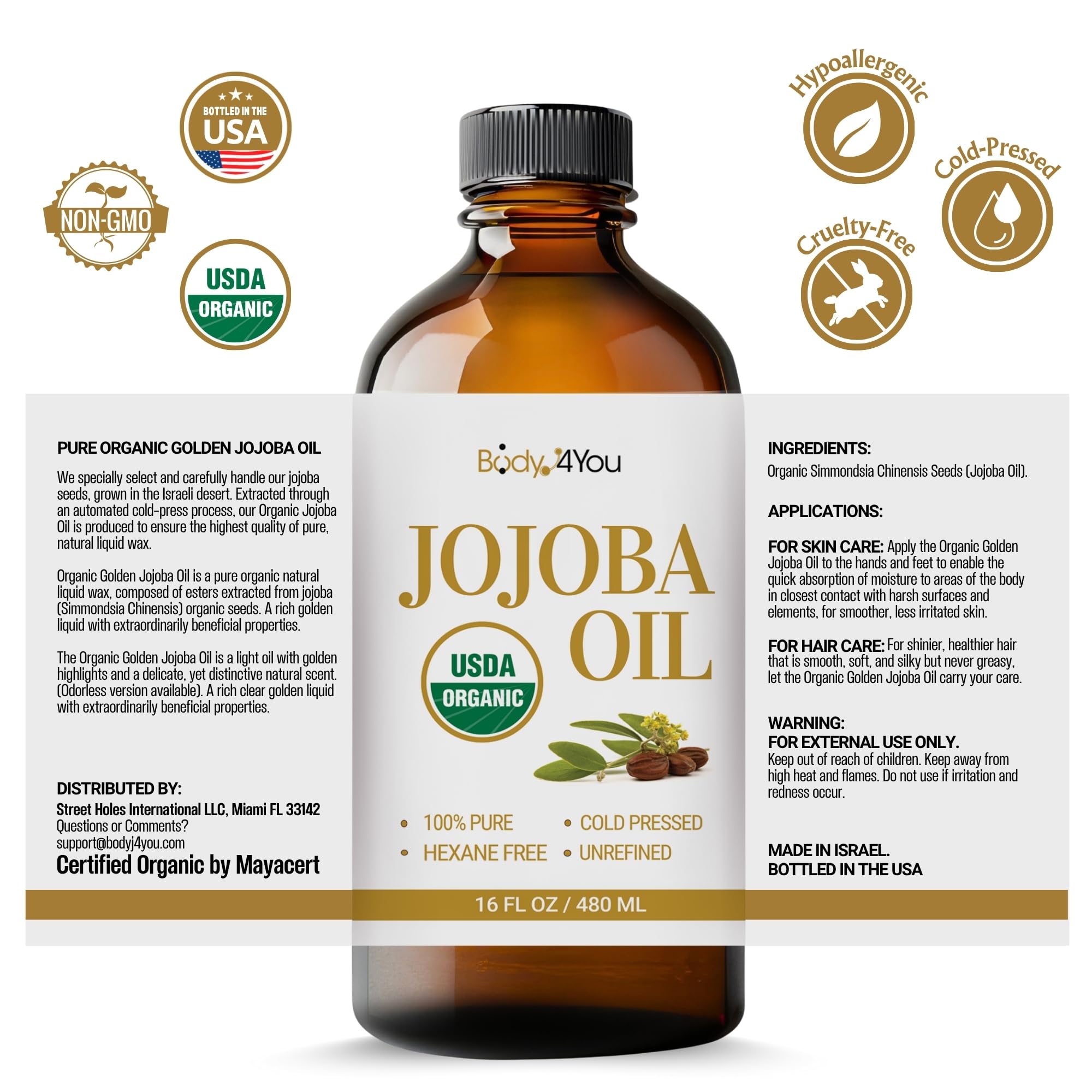 ORGANIC JOJOBA OIL COLD PRESSED: 100% Pure USDA Certified Organic Jojoba Oil for Face, Skin, Hair, Nails and Body. Bulk Value Size 16 Fl Oz, Amber Glass. Hexane Free, Vegan, Cruelty Free. Perfect for Full Body Massage, Professional Use, DIY Projects and Family Care.
