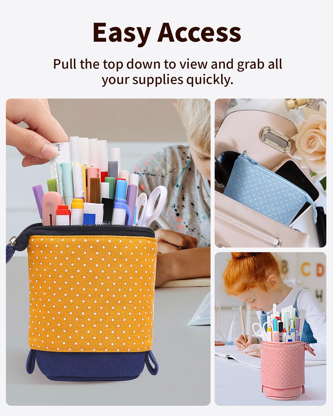 Retractable & Convenient: Put the bag on the table, unzip and pull down the two side tabs to transform it into a pen holder for easy access. The sturdy base gives it good support to stand upright, keeping all your supplies visible and easy to grab.
