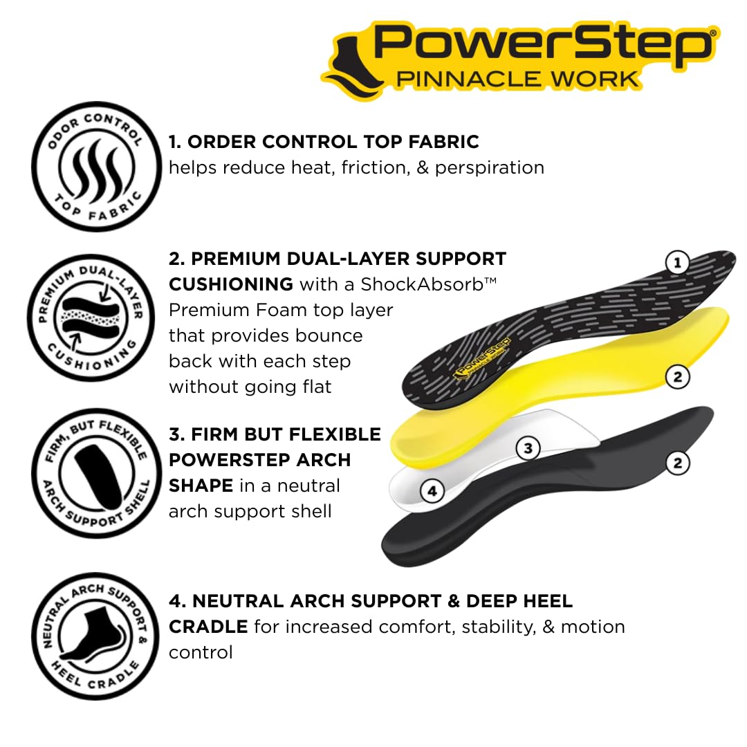 All Day Comfort & Support: PowerStep Pinnacle Work orthotic insoles improve foot comfort while working. Our work arch support inserts reduce fatigue, increase productivity and help maintain energy which leads to feeling happier and less fatigued.
