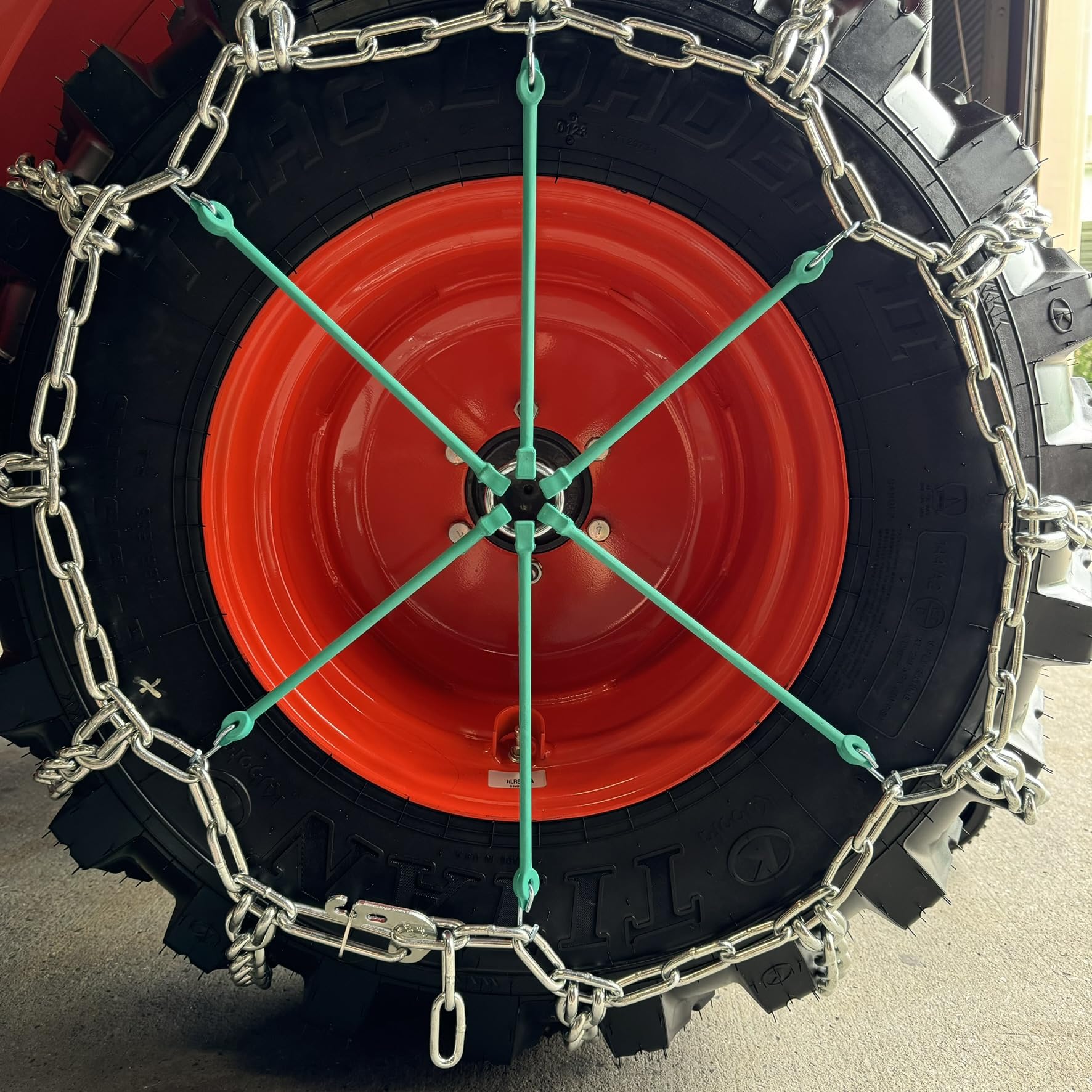 Fits Large Truck and Skid Steer ( 33" tall tire and larger) Keeps the tire chains tight and in place - thus maximizing the life of the tire chains. Adjusters or another tensioning device is a must for best performance. Mounts to the side chain on the outside of the tire. One pair per set is recommended. sold per pair (2) Heavy rubber arms attached to a welded ring. Rubber arms spaced evenly for even tension