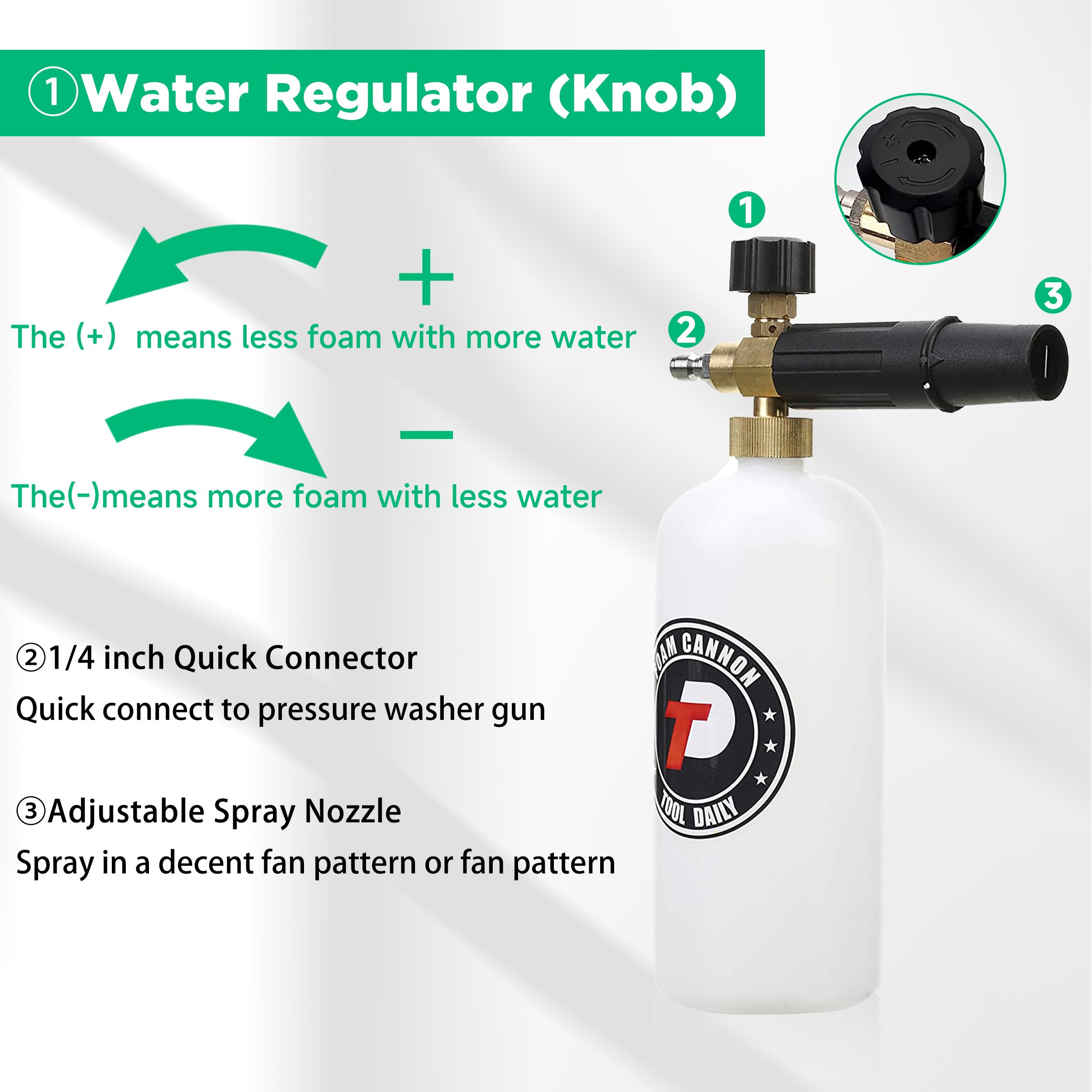 SPECIFICATIONS: This adjustable snow foam lance comes with a 1/4" quick-connect fitting for easy setup. Container capacity: 1 Liter (0.22 Gallon). Working pressure: 1000 to 3000 PSI. Max flow rate: 8 GPM. Max water temperature: 60℃ / 140℉. The adjustable nozzle allows precise mixing and foam generation. Turn the top knob clockwise(-) for the thickest foam mixture. Adjust the nozzle to set your desired spray pattern