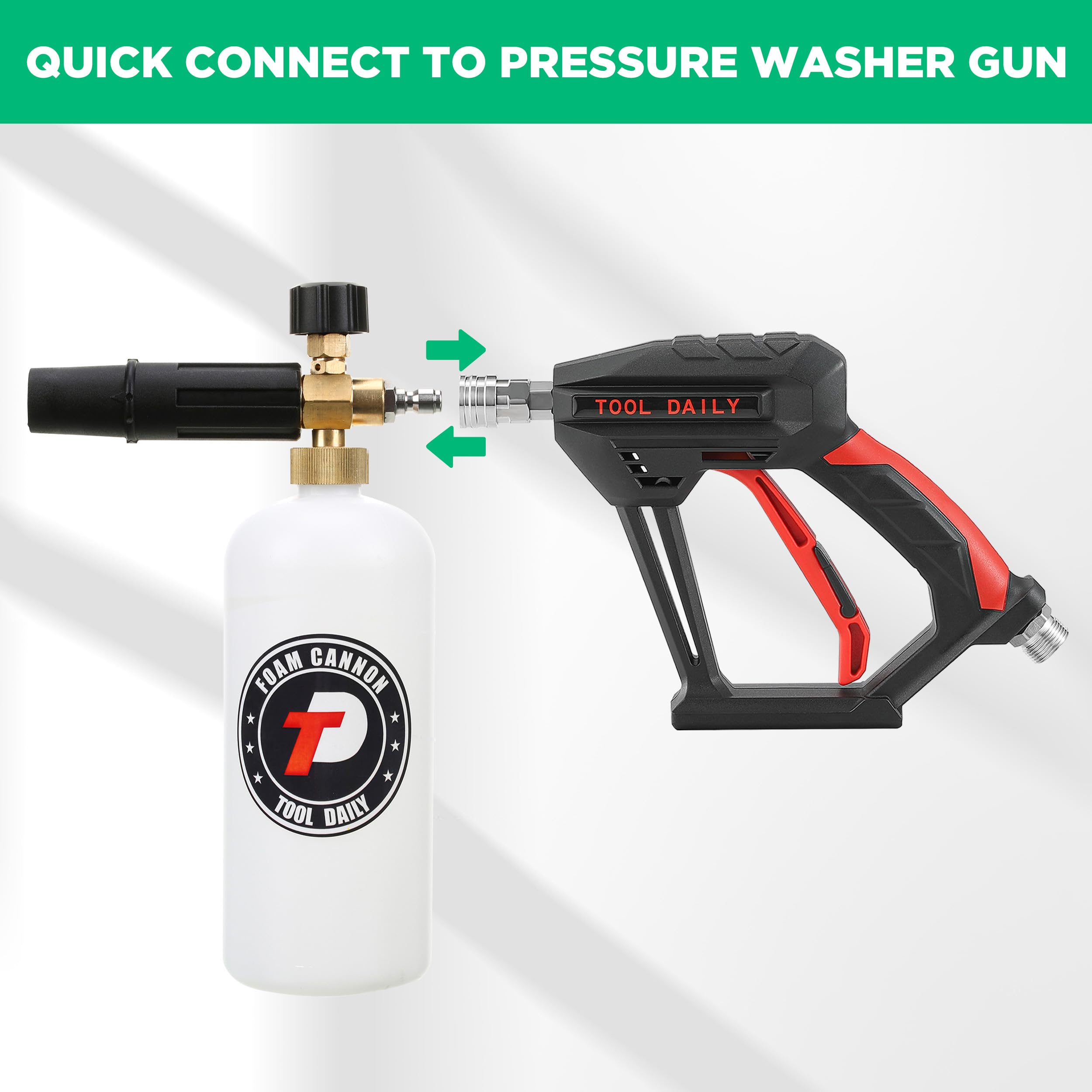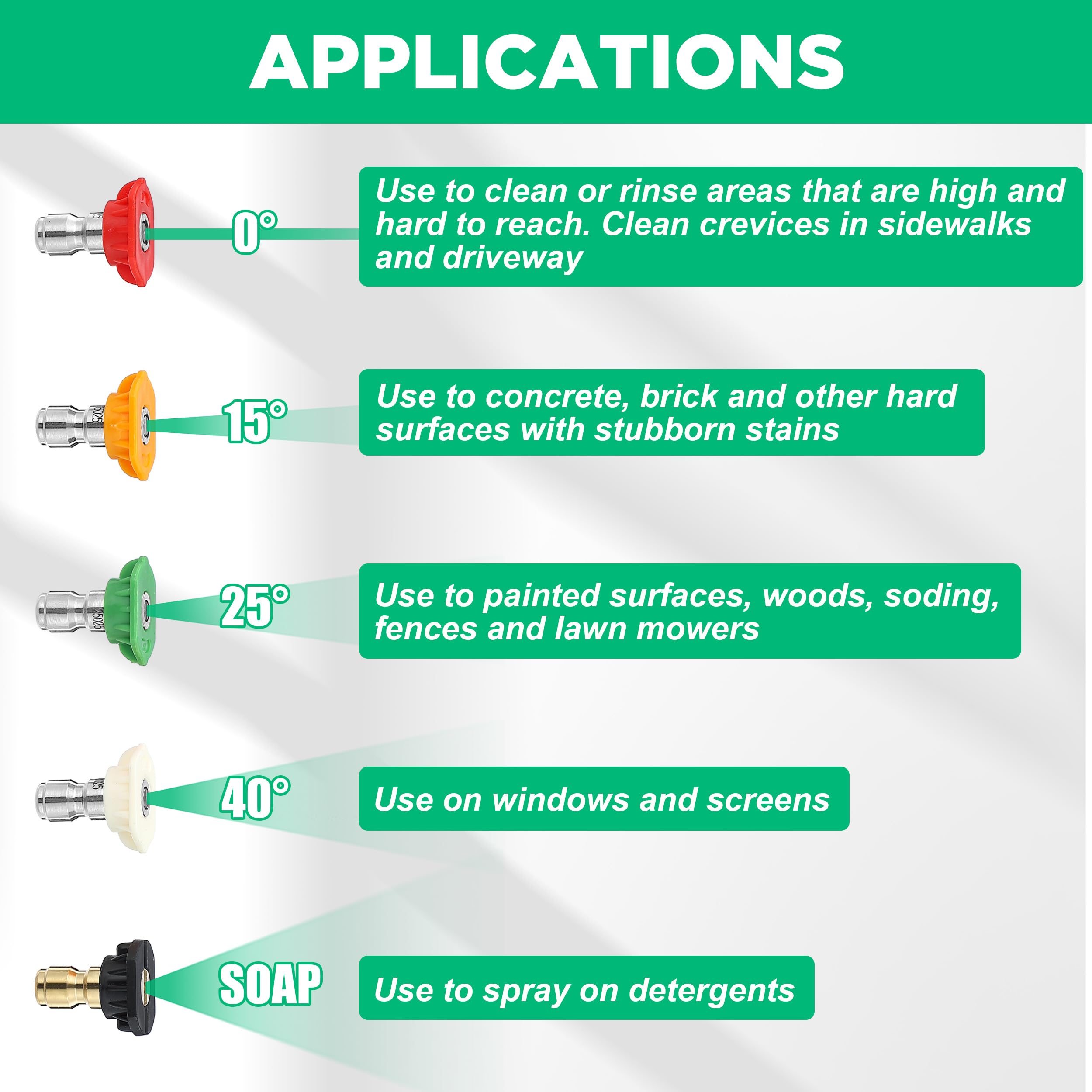 WIDE APPLICATIONS: This foam gun kit includes 5 pressure washer nozzle tips with different spray angles (0°, 15°, 25°, 40°, 65°), allowing you to choose the most suitable one for your task. It’s perfect for washing cars, motorcycles, and cleaning walls, windows, driveways, sidewalks, roofs, floors, decks, and more