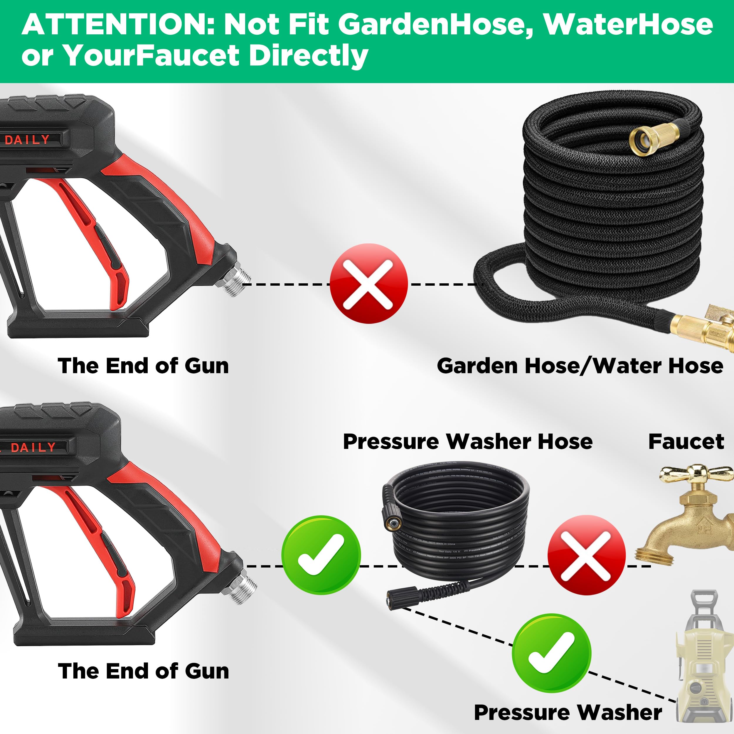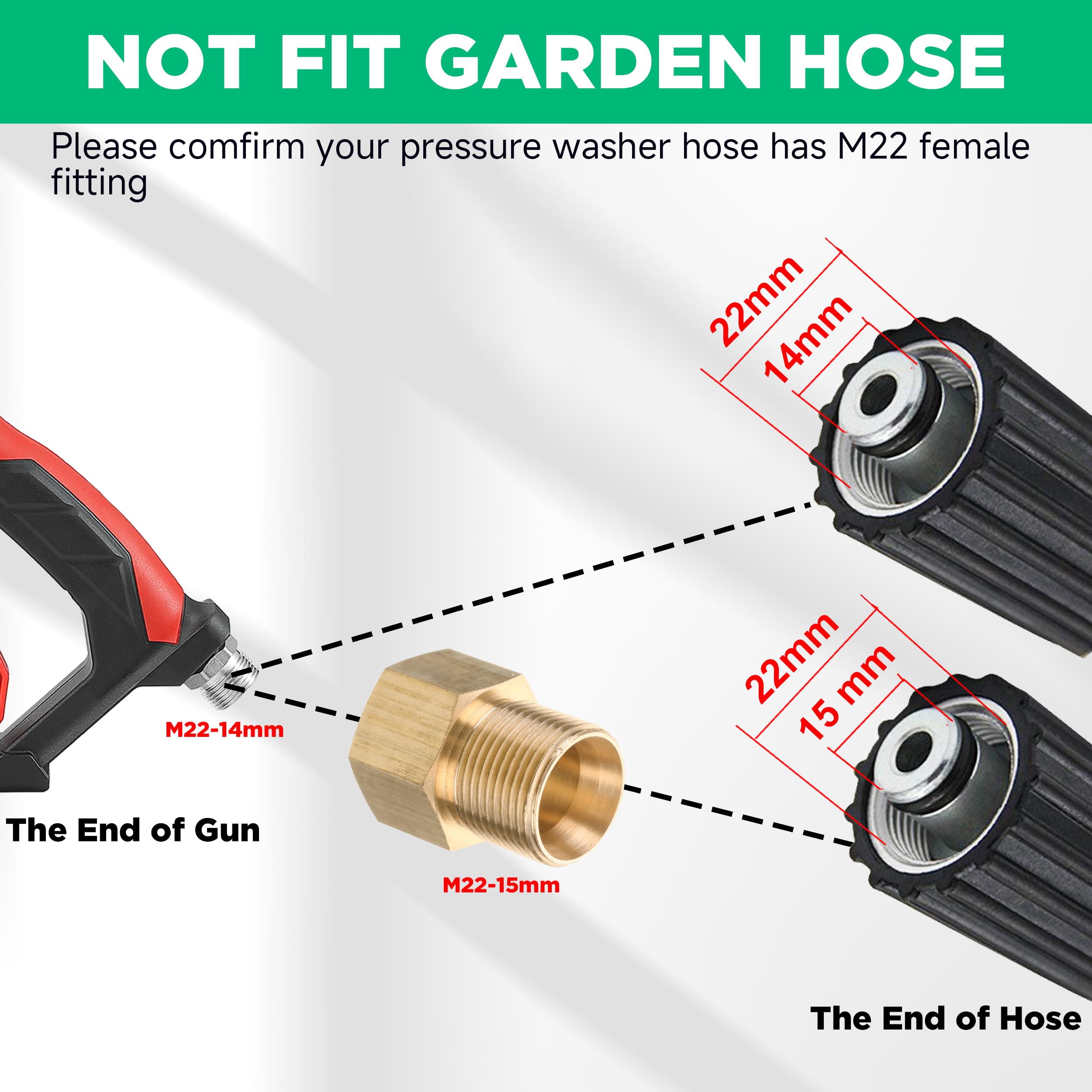 NOTE: Not fit Garden Hose, Water Hose or the Faucet directly! The power washer gun features an M22-14 fitting. If your pressure washer hose has an M22 14mm fitting, connect the gun to the hose directly. If your hose has an M22 15mm fitting, use the brass coupler to connect the gun and hose. Max pressure: 4000 PSI
