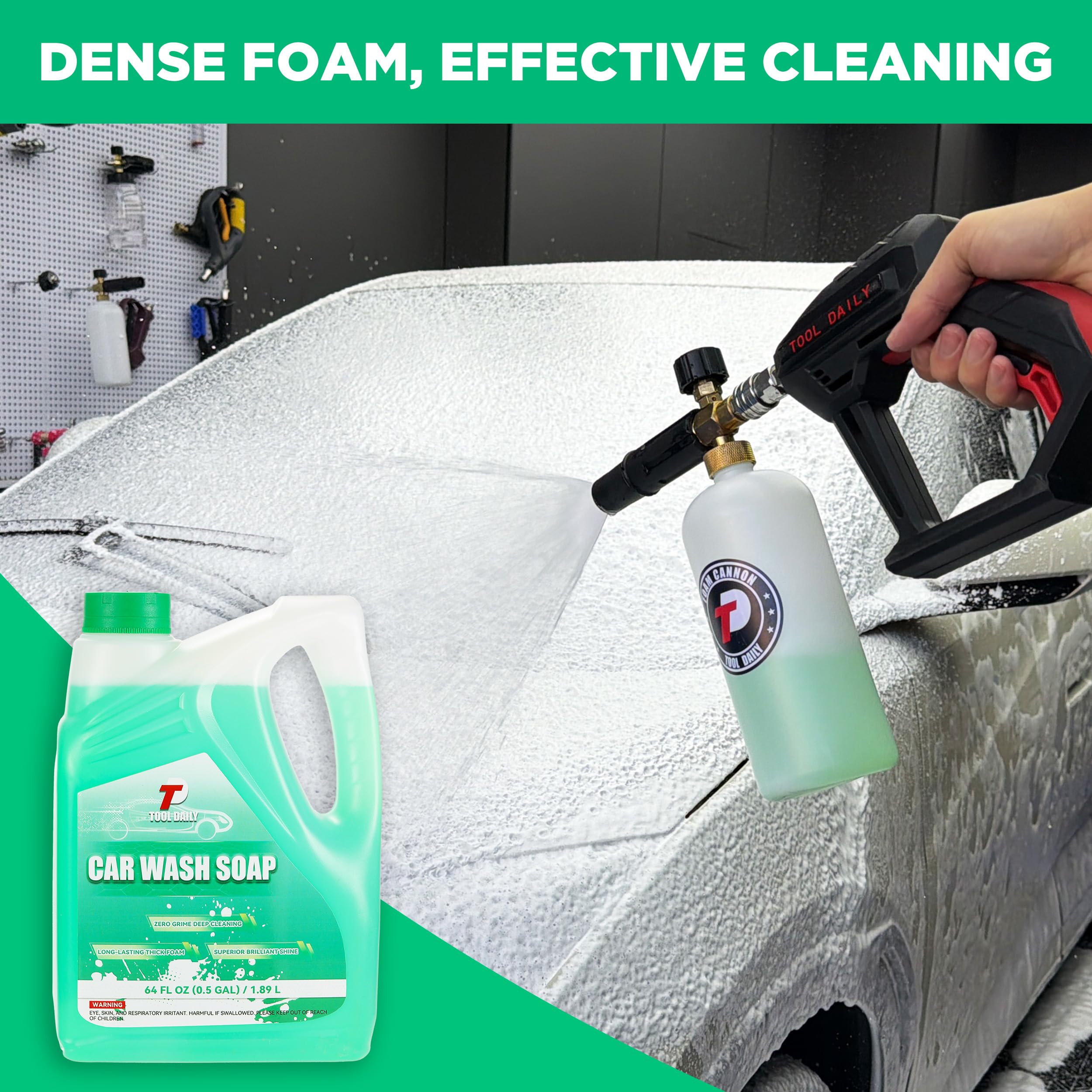CAR WASH SHAMPOO: The foam cannon soap has a 64 oz (0.5-gallon) capacity, providing dozens of uses. For optimal foam mix ratios: for pressure washers over 1500 PSI, use a 1:20 soap-to-water ratio; for pressure washers below 1500 PSI, use a 1:10 to 1:15 ratio. This foaming car wash soap is formulated to break down tough stains without damaging surfaces and works with all pressure washers for maximum cleaning power