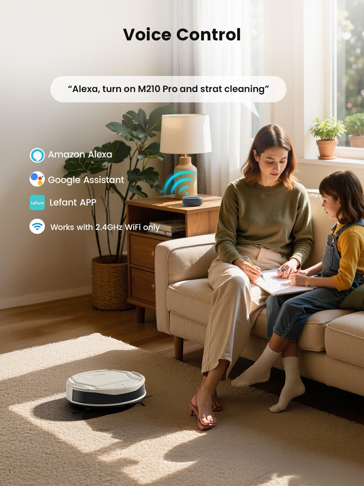 đą ăSmart App & Voice ControlăEnjoy smart home cleaning with Lefant App control (schedule cleanings, adjust suction, track progress) and Alexa/Google Assistant voice commands - set it and forget it, returning to a spotless home every time.(Note: 2.4GHz WiFi only)