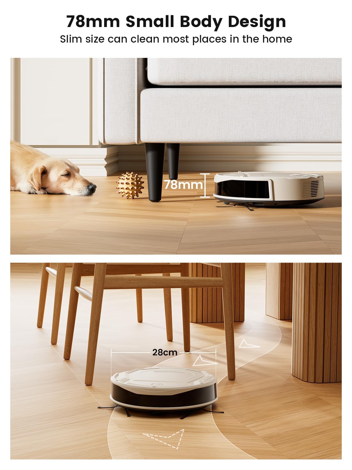 â ăCompact & Slim DesignăWith an ultra-slim 2.99-inch profile, this robot vacuum effortlessly cleans under furniture, beds, and tight spaces, while its edge-sweeping brush thoroughly reaches corners and along walls for complete coverage.