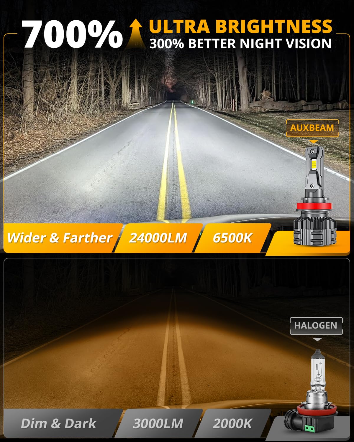 1500 FEET OF SUPER VISON: Upgraded 12 PCs Blade-X chips, 24,000 lumens and 110W high output arm your car with a farther & wider lighting field. Auxbeam H11 light focus on super brightness, providing 700% more light and 300% more night vision than original halogen light for confident driving anytime. Say goodbye to those dim yellow stock light and see what you wanna see clearly with super bright light.