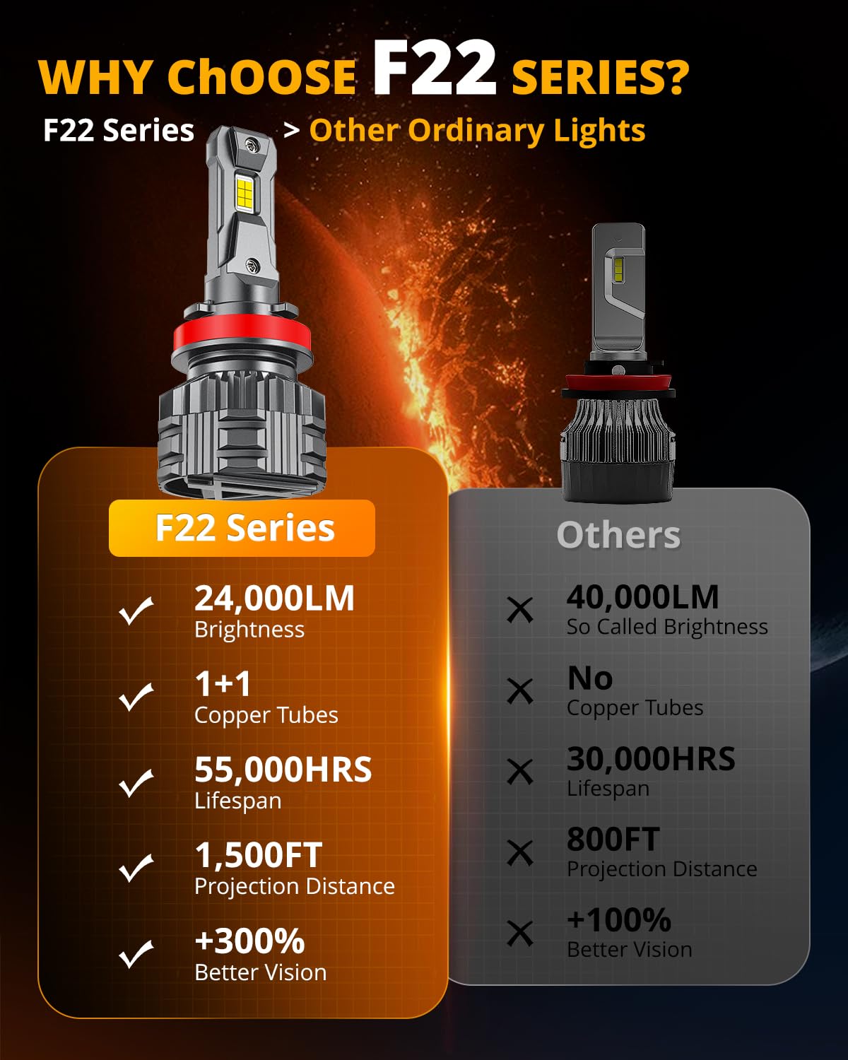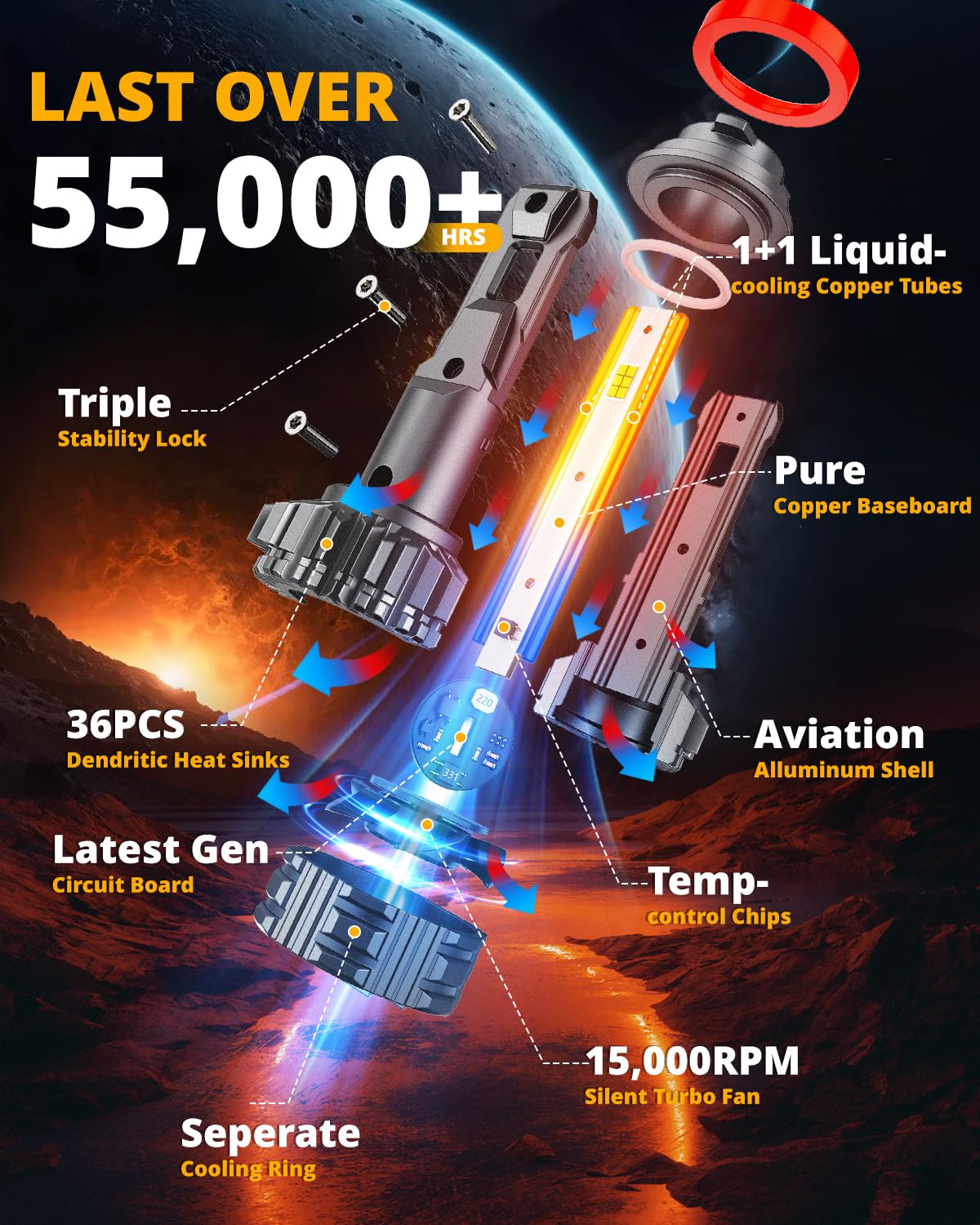 MOST ADVANCED COOLING SYSTEM EVER: Five-layer cooling design - The red copper substrates + 6063 aviation aluminum lamp body + Unique 36PCs dendritic heat sinks + Latest double liquid-cooling copper tubes + 15,000RPM turbofan directly doubles heat dissipation, prolonging lifespan of H8 light up to 55,000 hours to avoid frequent light replacements.