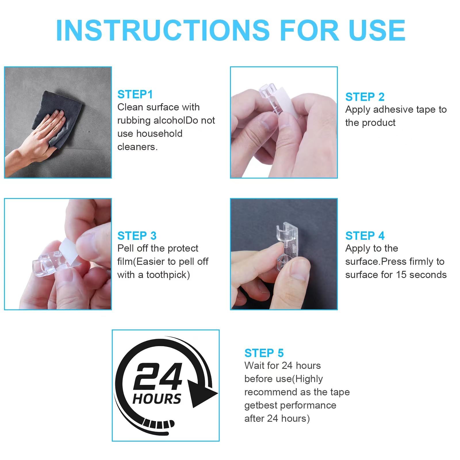 【Precautions before use】Before using the cable holders, be sure to clean the installation surface with an alcohol pad, stick them and press firmly for 30 seconds, use them after 24 hours for maximum adhesion.