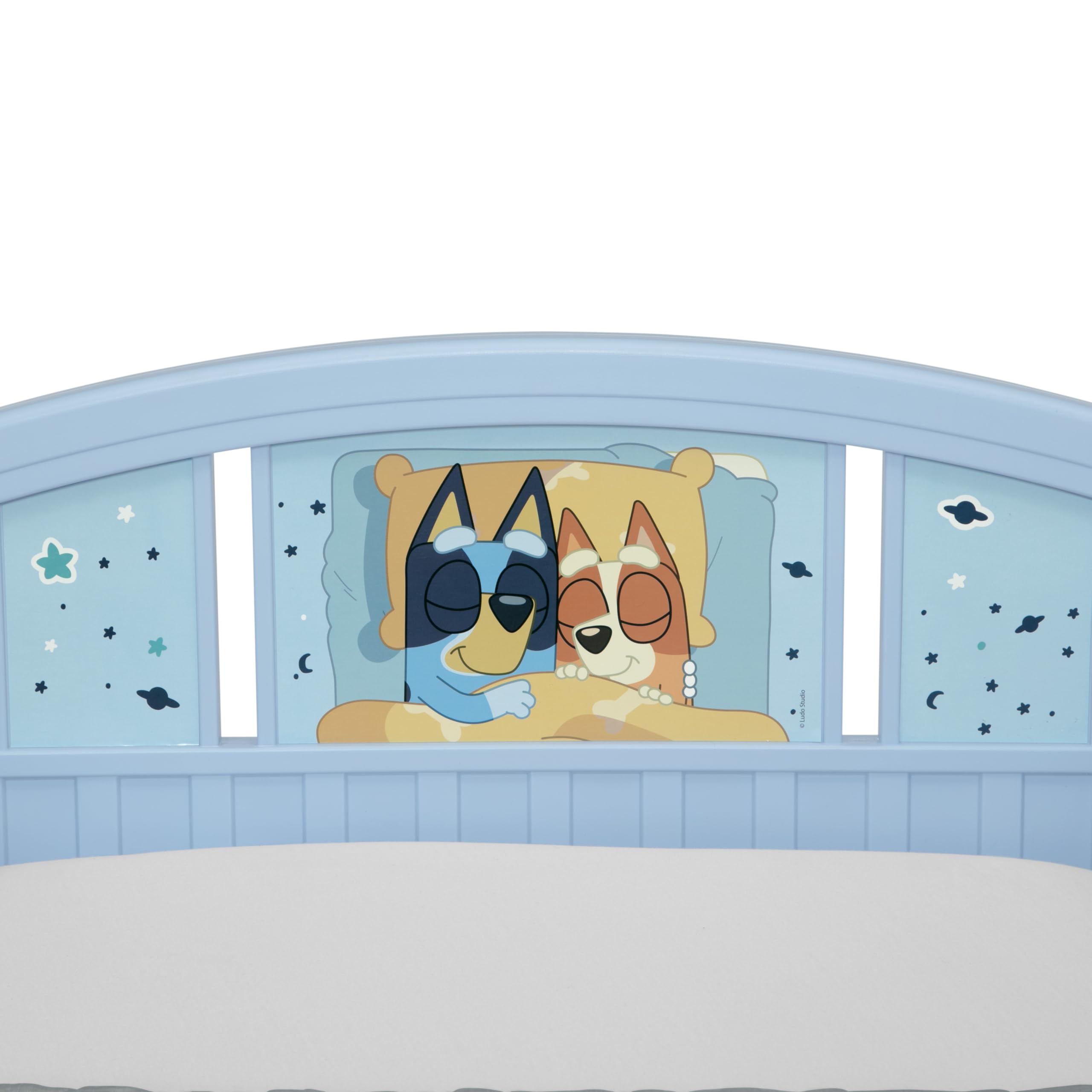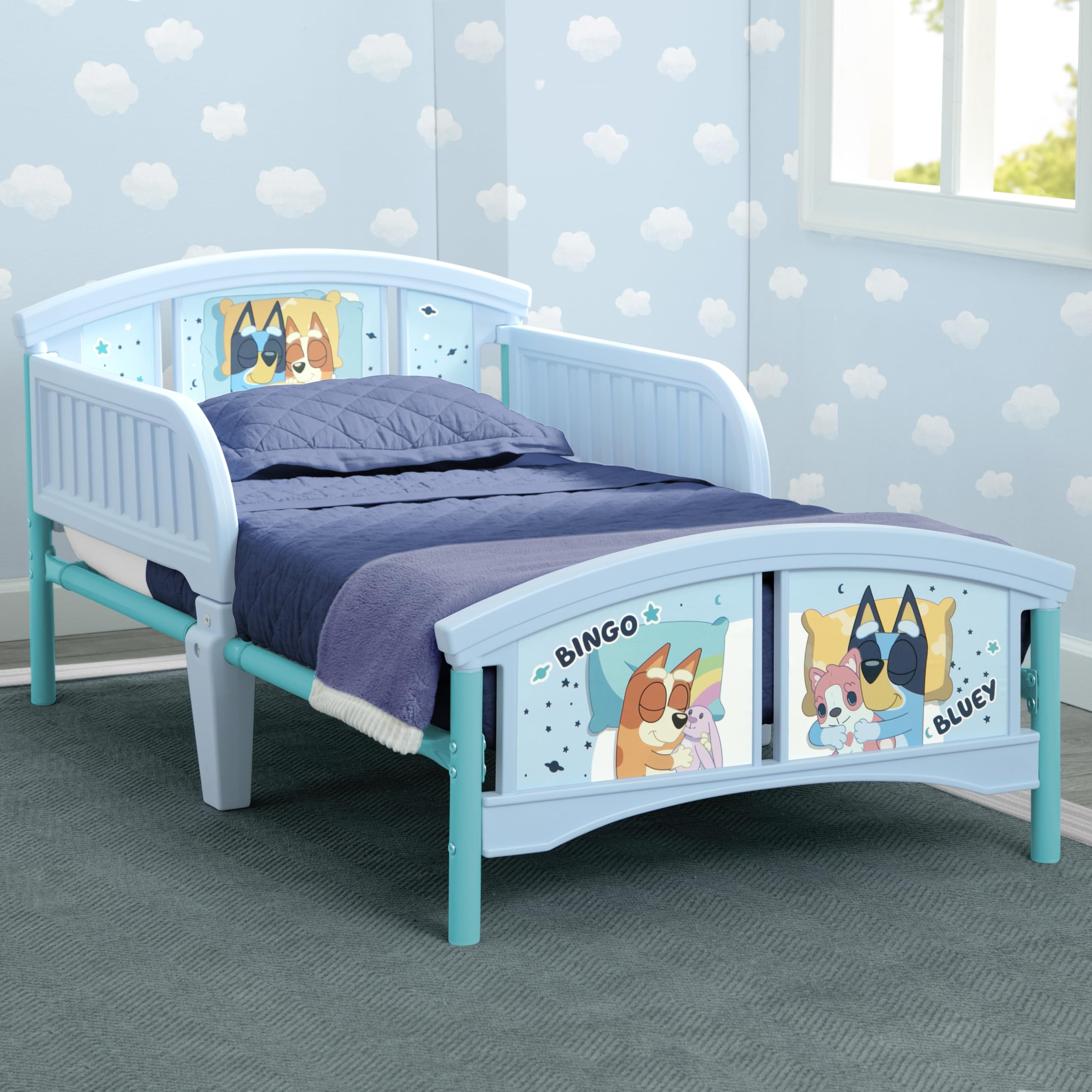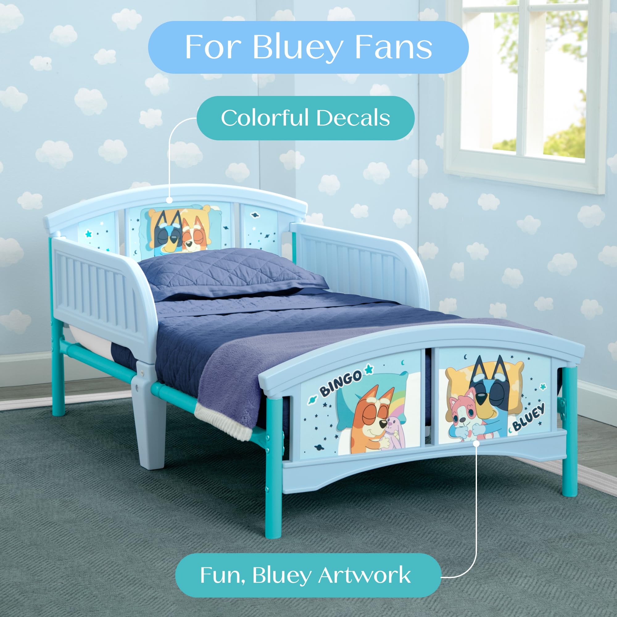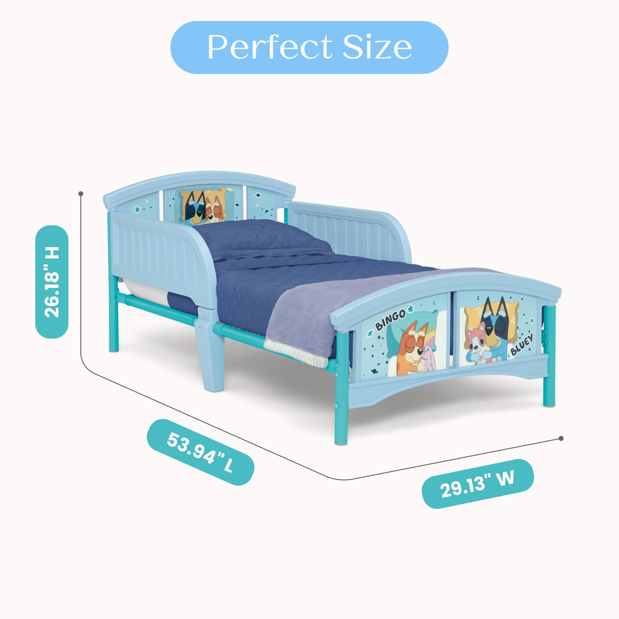 This Bluey Plastic Toddler Bed by Delta Children will have kids excited for bedtime. Colorful decals of fun-loving heeler pups from the land down under, Bluey and Bingo, makes this toddler bed is a must-have for any Bluey fan. The bedβs low mattress height and attached guardrails make it the best option for your childβs first big-kid bed, giving them the independence they crave while keeping them safe throughout the night. Get this toddler bed today and bring home the magic of Bluey! Bedding and mattress not included.